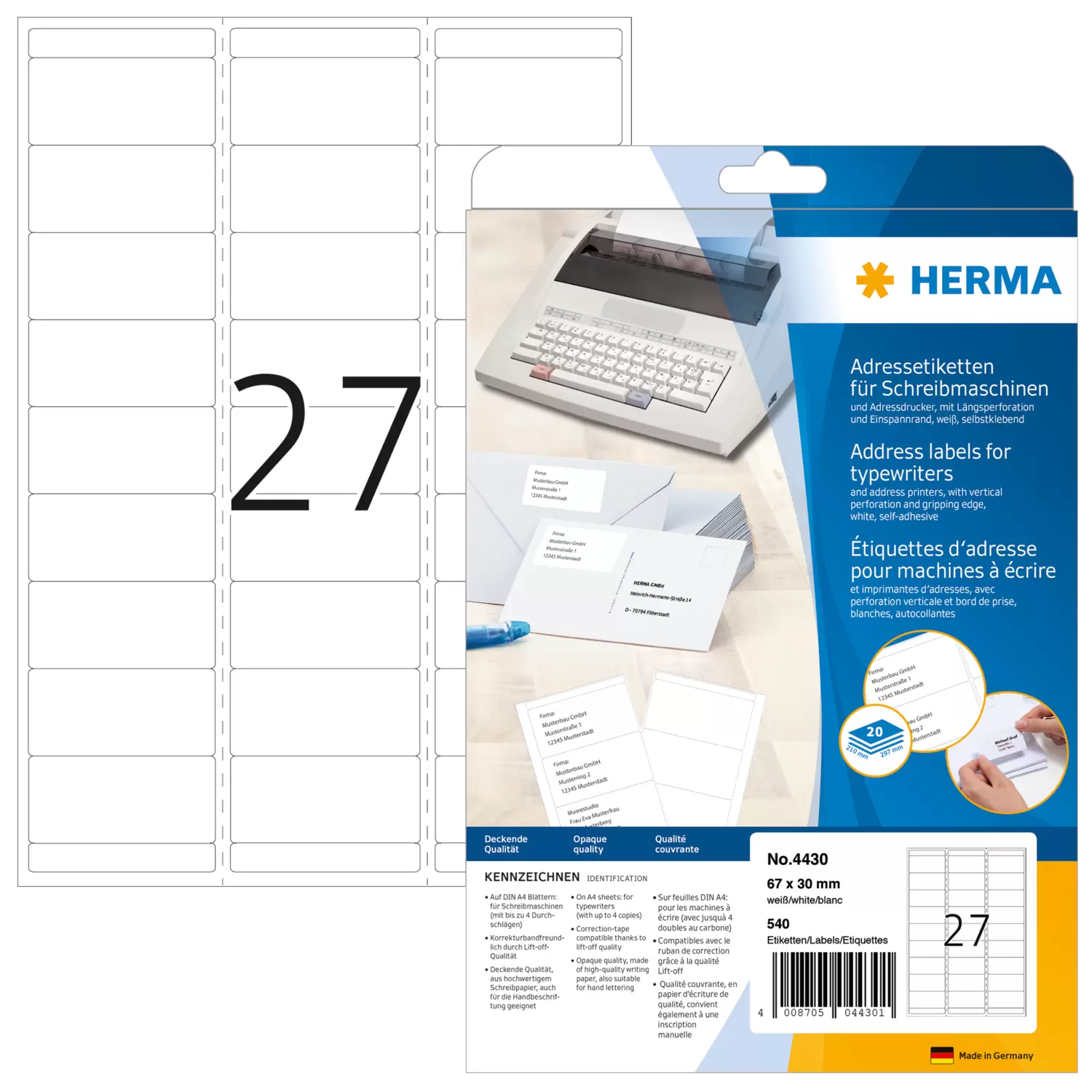 Adressetiketten für Schreibmaschinen, auf A4-Blättern, Ecken abgerundet, selbstklebend. Zum Adressieren, zum Kennzeichnen von Akten, Behältern, Mustern, Fotos oder zum Überkleben. Aus hochwertigem, holzfreiem weißem Schreibpapier, deckende Qualität. Chlorfrei gebleicht, lösemittelfreier Haftkleber. Etikettenpapier FSC® Mix Credit-zertifiziert. Korrekturbandfreundlich durch Lift-Off-Qualität. Mit Längsperforation zum einfachen Trennen der Etiketten. Für Schreibmaschinen und Handbeschriftung. Nicht für PC-Beschriftung geeignet. Nutzen Sie dafür HERMA Premium A4 Etiketten.