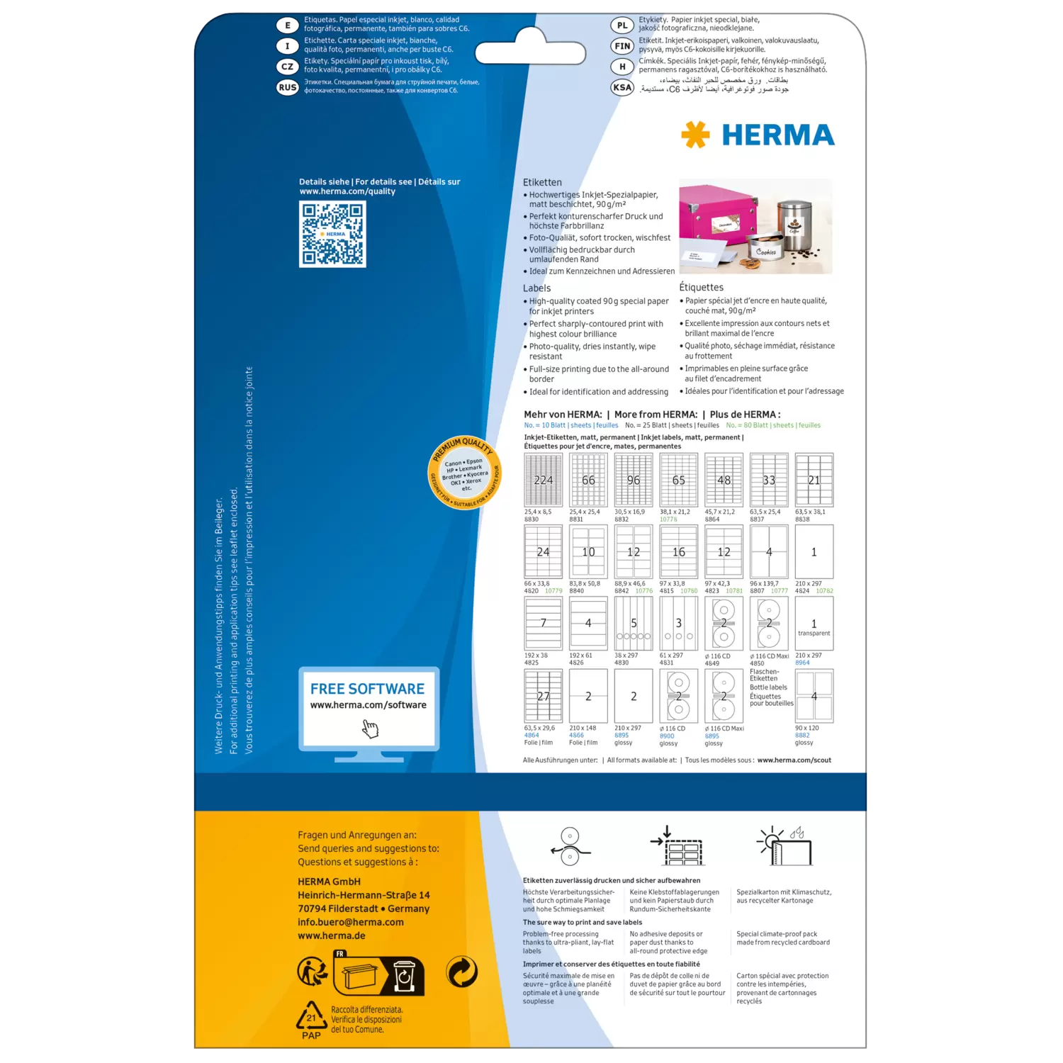 Etiketten, speziell für Inkjetdrucker, auf A4-Blättern, selbstklebend. Aus hochwertigem gestrichenem Spezialpapier, 90 g/m² für konturenscharfe und farbbrillante Drucke in Foto-Qualität. Störungsfreie Verarbeitung durch Rundum-Sicherheitskante und optimale Planlage. Alle Ausführungen mit umlaufendem Rand: vollflächig bedruckbar und ideal auch für Inkjetdrucker mit kritischen Papierführungen. Kostenlose Softwarelösungen: www.herma.de/software.
