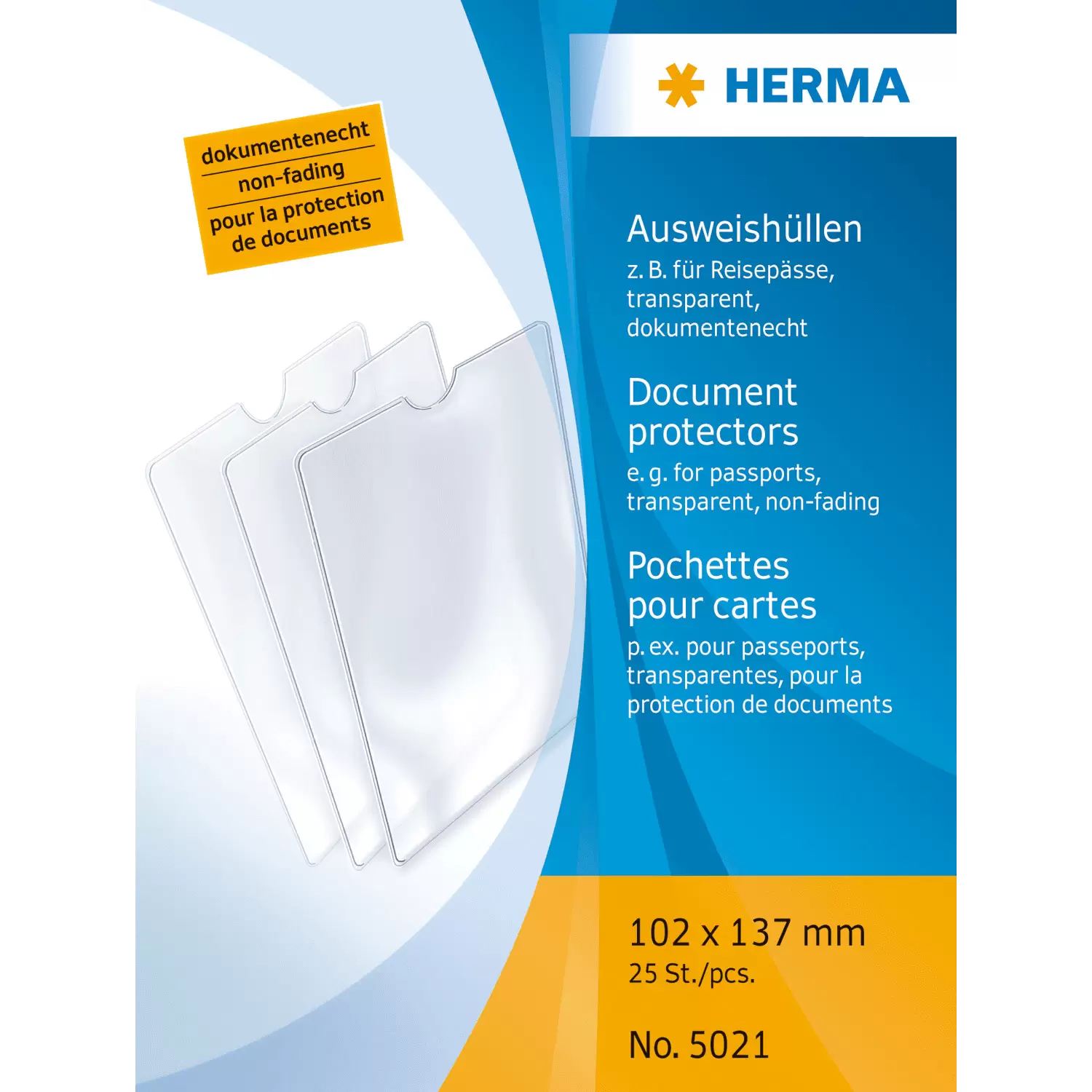 Dokumente, Ausweise sowie Bank-, Kredit- und andere wichtige Karten sollten gut geschützt und sicher aufbewahrt werden. Die HERMA Steckhülle aus transparenter Polypropylen-Folie ist optimal für Reisepässe und mehr im Format 102 x 137 mm geeignet. Die Hülle ist extrem strapazierfähig und robust, dokumentenecht, reißfest, geruchsfrei und schützt vor Nässe, Schmutz und Abnutzung, auch unterwegs im Geldbeutel, in der Hand- oder Hosentasche. Das ist HERMA Qualität Made in Germany.