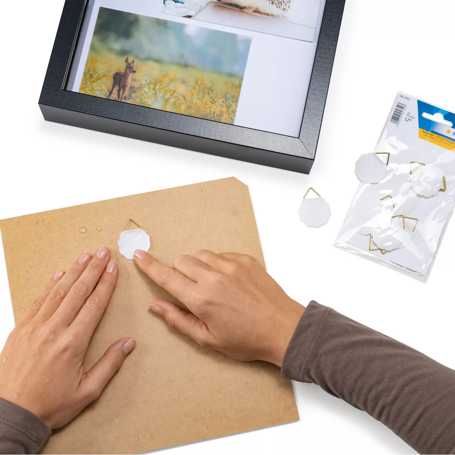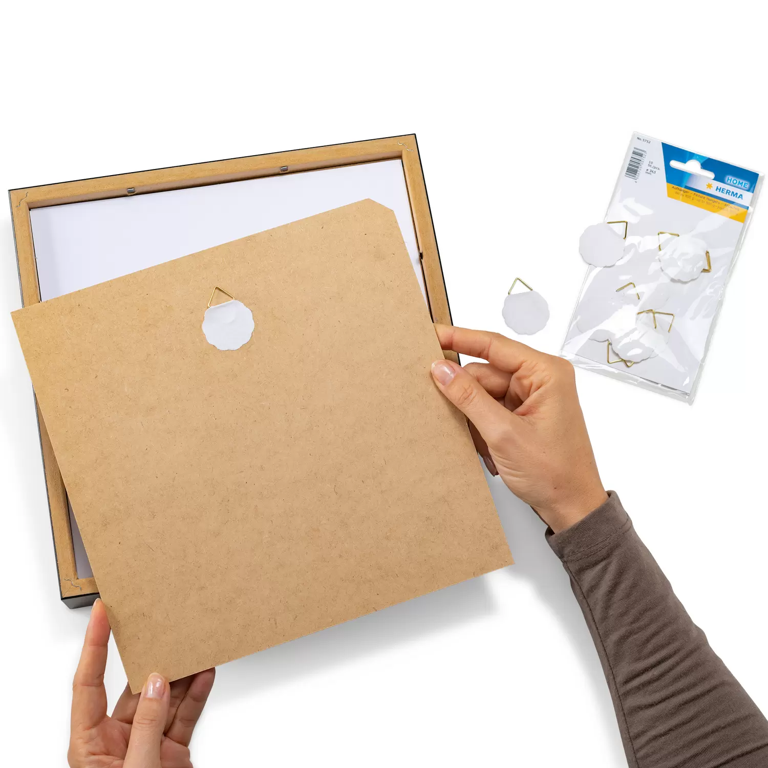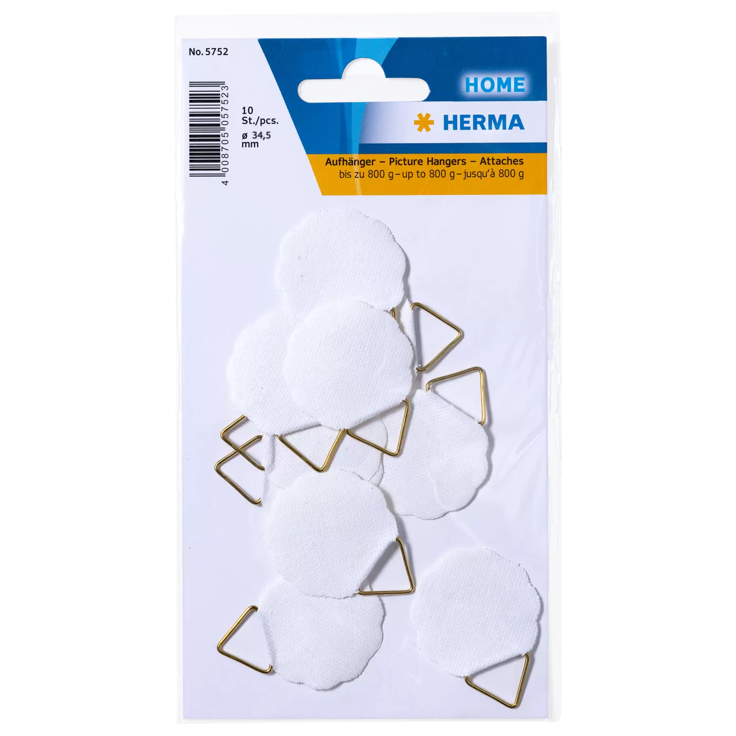 Permanent haftende, weiße Aufhänger von HERMA aus stabilem strukturiertem Leinengewebe mit eingearbeitetem Drahtbügel-Haken. 10 Stück pro Packung. Zum Aufhängen von Bildern und Bilderrahmen, Plakaten und Postern, Kalendern, Schildern, Wandschmuck mit glatter Rückseite und vielem mehr. Die Aufhänger haben einen Durchmesser von 34,5 mm und eine Tragkraft von bis zu 0,8 kg. Selbstklebend durch die wasserlöslich gummierte Seite: Einfach einen oder mehrere Anhänger befeuchten, auf den fett- und staubfreien Untergrund aufkleben, mindestens 30 Minuten trocknen lassen und Gegenstand aufhängen. Eine einfache und kostengünstige Möglichkeit um Dekoobjekte auf- oder umzuhängen und Ihr Zuhause oder Büro zu verschönern. Haftet auf glatten Oberflächen wie Holz, Pappe, Kunststoffen, Glas, Porzellan, Keramik und mehr. Achtung: Verminderte Tragfähigkeit auf gewölbten Flächen. Haftet nicht auf Hart- oder Weichschaumplatten oder kaschierten Flächen.