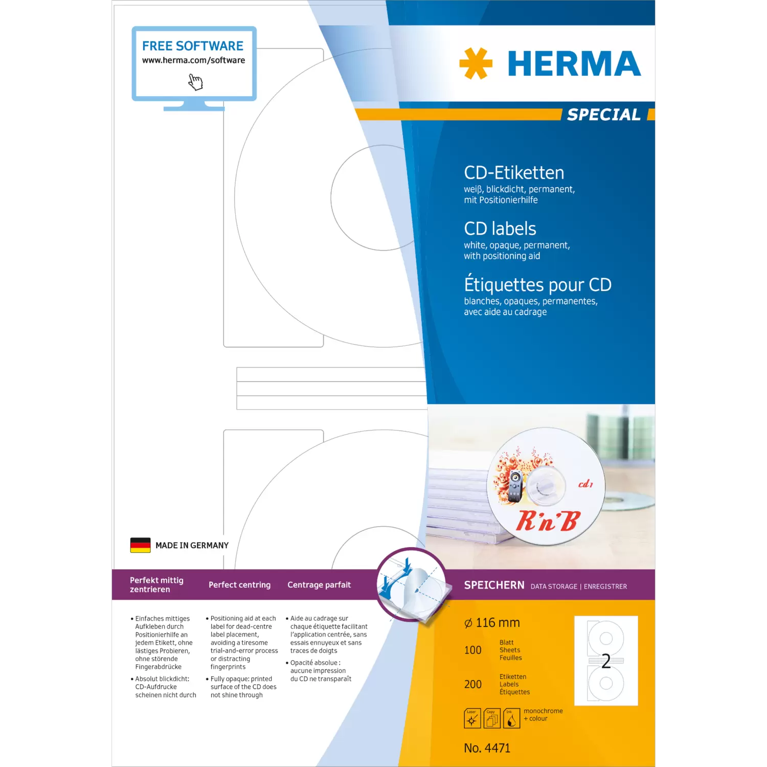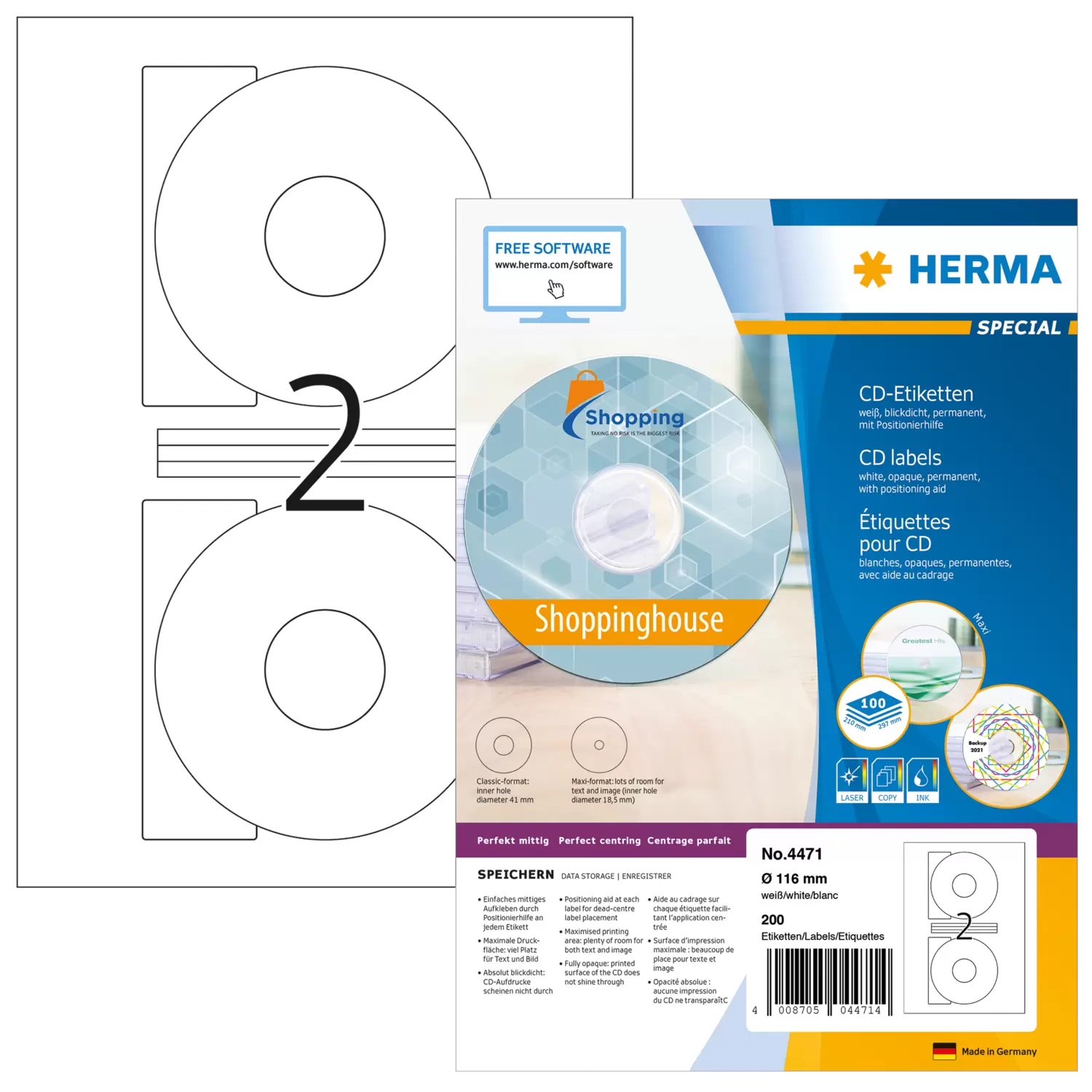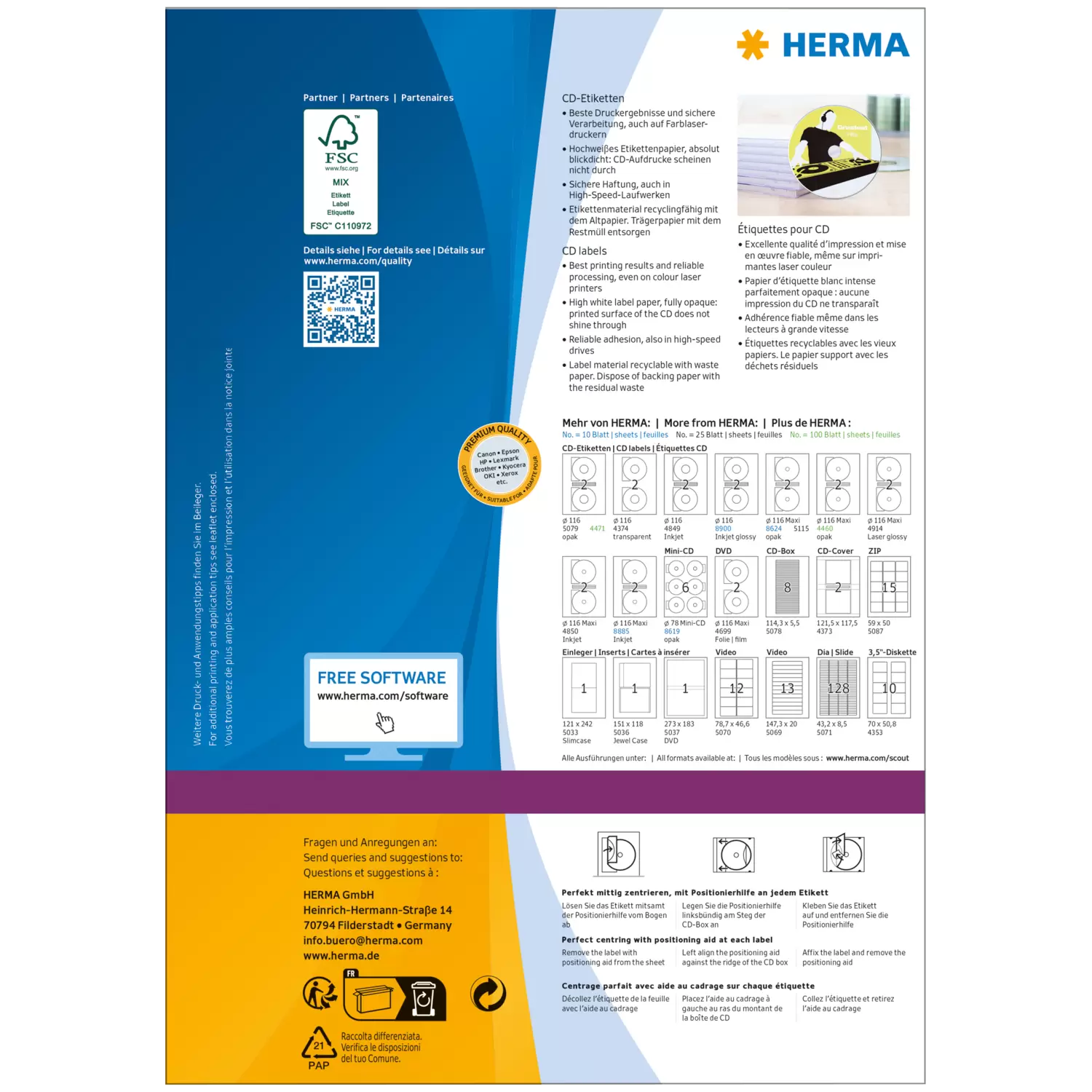 CD-Etiketten aus Papier, auf A4-Blättern, selbstklebend. Absolut blickdichtes Material mit hohem Weißgrad, CD-Aufdrucke scheinen nicht durch. Einfaches mittiges Aufkleben durch Positionierhilfe an jedem Etikett. Sichere Haftung, auch in High-Speed-Laufwerken. Umweltfreundlich: hochwertiges, chlorfrei gebleichtes Spezialpapier, FSC® Mix Credit-zertifiziert, lösemittelfreier Haftkleber, Verpackung aus Recyclingkarton. Sehr gute Druckergebnisse auf allen Laser- und Inkjetdruckern, Kopierern, Farblaserdruckern und Farbkopierern. Störungsfreie Verarbeitung durch Rundum-Sicherheitskante und optimale Planlage. Kostenlose Softwarelösungen: www.herma.de/software.