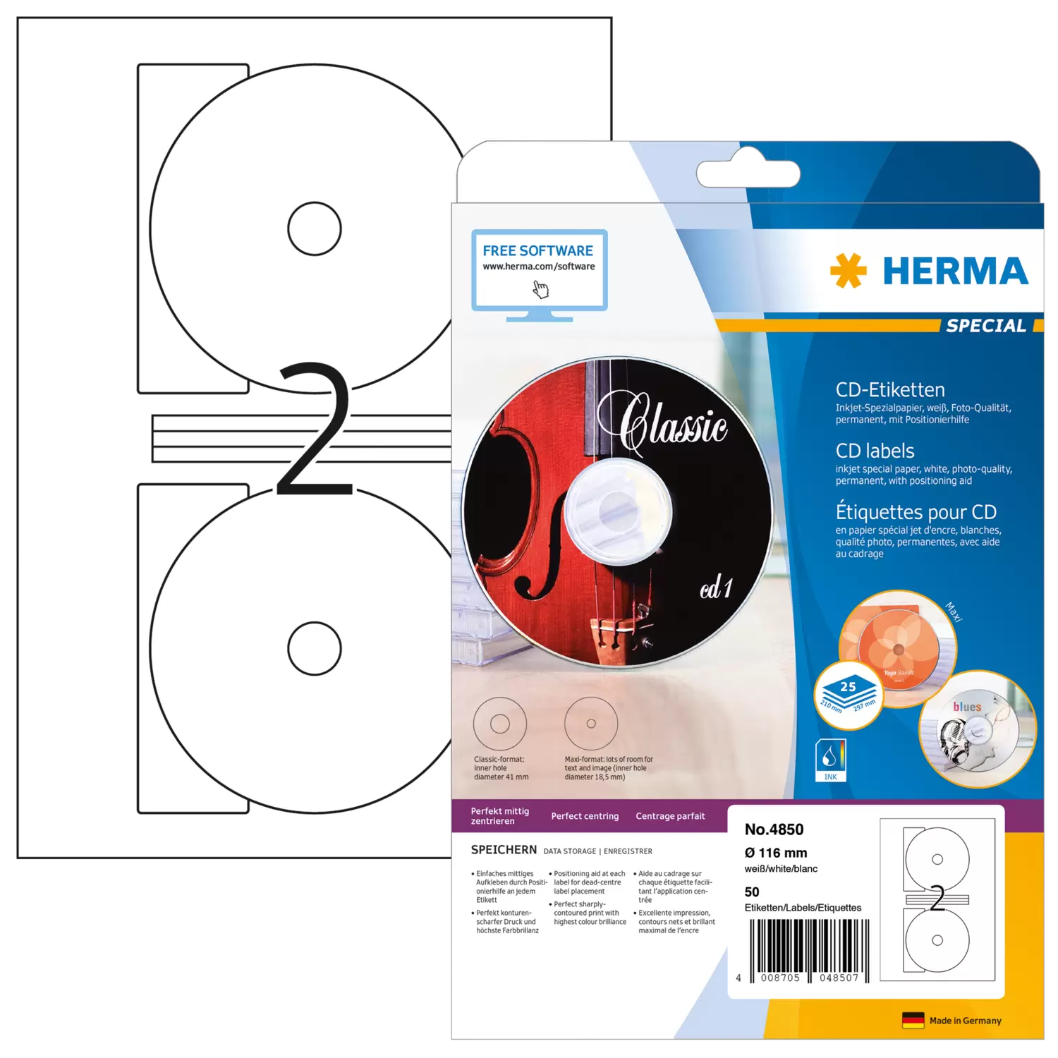 Inkjet-CD-Etiketten A4, Ø 116 mm (Innenloch klein), weiß, permanent haftend