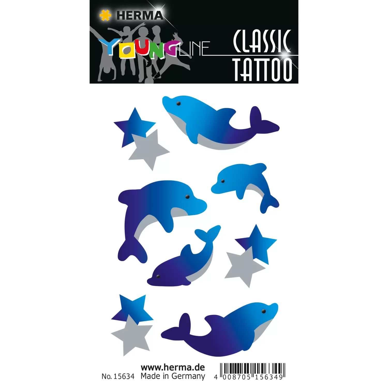 Tattoos müssen nicht für immer sein: Klebetattoos zaubern fantasievolle Motive auf die Haut – aber nur temporär. Hautfreundlich, leicht aufzubringen und noch leichter wieder zu entfernen: Das sind die coolen Klebetattoos von HERMA. Gewünschtes Tattoo ausschneiden, Schutzfolie abziehen und auf gewünschter Hautstelle positionieren, mit einem feuchten Tuch 30 Sekunden fest andrücken und abziehen – fertig. Die Tattoos sind wasserfest und halten einige Tage auf der Haut. Außerdem lassen sie sich ganz leicht wieder abwaschen: einfach etwas Haut- oder Speiseöl auf ein Tuch geben und sanft über das Tattoo streichen und es wird rückstandslos entfernt. Ein Riesenspaß für Groß und Klein! Die hübschen Delfine in blau sind der Hit als Sommertattoo! Ab in's Freibad!
