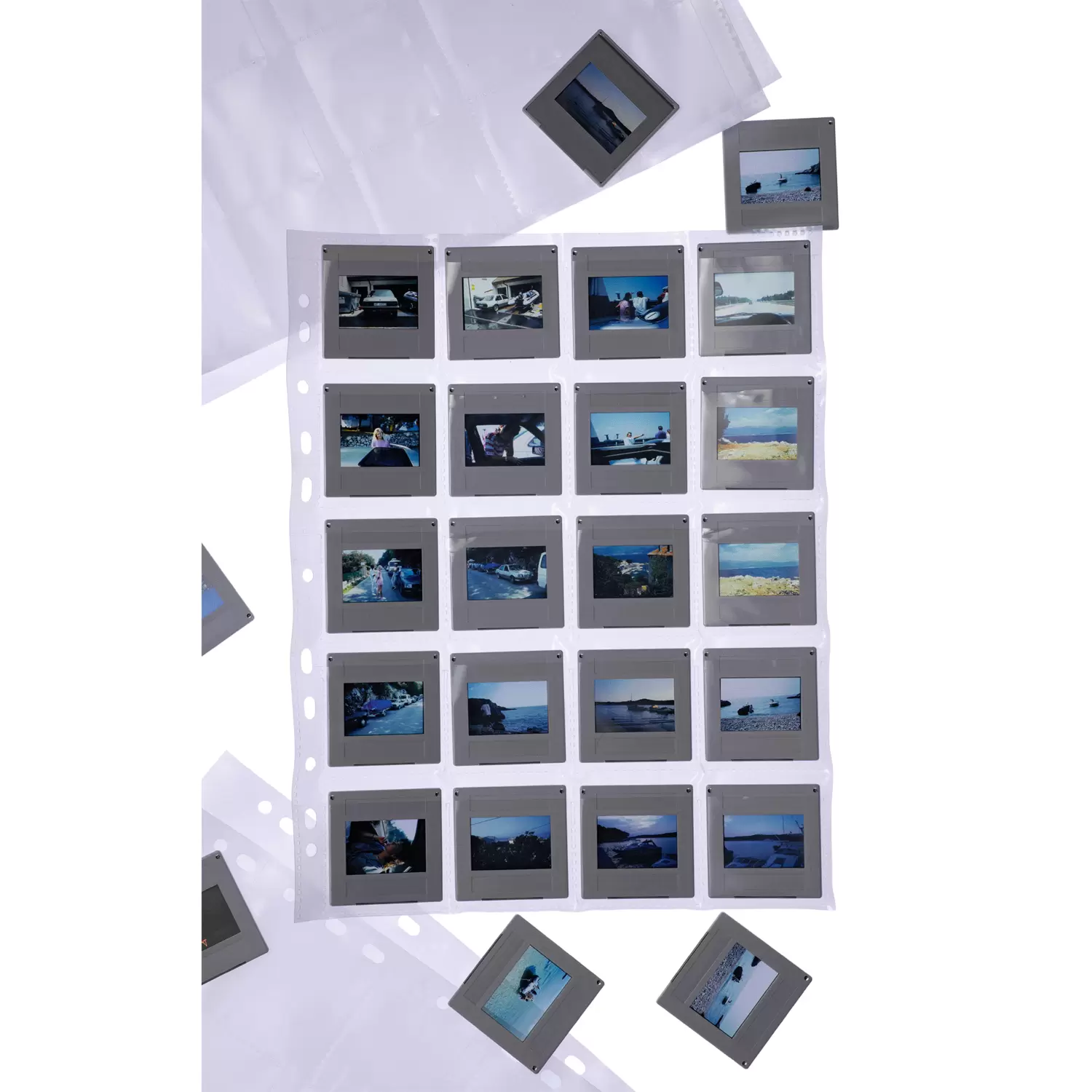 Die HERMA Diahüllen sind ideal zum sauberen und übersichtlichen Aufbewahren und Archivieren von Kleinbild-Dias. Sie bestehen aus transparentem, robustem und weichmacherfreiem klar-mattem Polypropylen und bieten pro Hülle Platz für 20 gerahmte Dias im Format 50 x 50 mm. Das Besondere sind die speziellen Sicherungslaschen, die das Herausfallen der Dias aus den Hüllen verhindern. So lassen sich die Dias komfortabel einstecken und entnehmen und sind dennoch optimal geschützt. Eine Hülle ist ca. 24,4 x 30,1 cm groß und lässt sich durch die Eurolochung ganz einfach in Ordner, Ringbücher oder Fotobooks einheften. Für optimalem Halt werden Varianten mit 4 Ringen empfohlen. In einer Packung sind 100 Blatt enthalten und somit genügend Platz für bis zu 2.000 Dias.