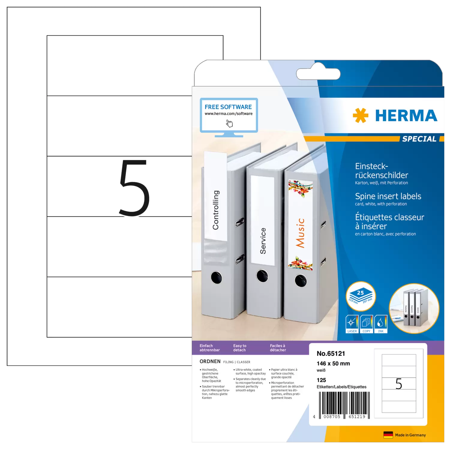 Einsteckrückenschilder aus Karton, für Ordner mit Einstecktasche/Sichtfenster. Für ein einheitliches Erscheinungsbild im Büro und Zuhause. Blanko: Ideal für Firmenlogo, Beschriftungen und Ordnungsvermerke. Hochweißer, gestrichener Spezialkarton mit hoher Deckkraft. Sauber trennbar durch Mikroperforation. Sehr gute Druckergebnisse auf allen Laserdruckern, Kopierern, Farblaserdruckern und Farbkopierern. Kostenlose Softwarelösungen: www.herma.de/software.