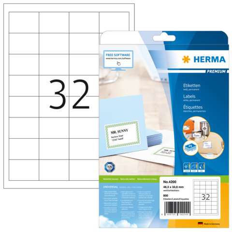 Selbstklebende Etiketten auf A4-Blättern, permanent haftend. Perfekt für alle Laser- und Inkjetdrucker, Kopierer, Farblaserdrucker und Farbkopierer. Garantiert staufrei und high-speed-fähig durch extra starken Spezialverbund, Top-Planlage und Rundum-Sicherheitskante. Problemloser Druckerdurchlauf für Laserdrucker und Inkjetdrucker getestet und bestätigt durch den TÜV SÜD. Hoher Weißegrad und gleichmäßige Oberfläche für beste Druckergebnisse in Schwarz und Farbe. Spürbar dicker: extra starke Etiketten, einfaches Aufkleben. Besonders schnell und sicher haftend, auch auf kühlen und feuchten Oberflächen. Umweltschonend und nachhaltig: chlorfrei gebleicht, FSC® Mix Credit-zertifiziert, lösemittelfreier Haftkleber. Etikettenmaterial recyclingfähig mit dem Altpapier, Trägerpapier mit dem Restmüll entsorgen, Verpackung aus Recyclingkarton. Kostenlose Softwarelösungen: www.herma.de/software.
