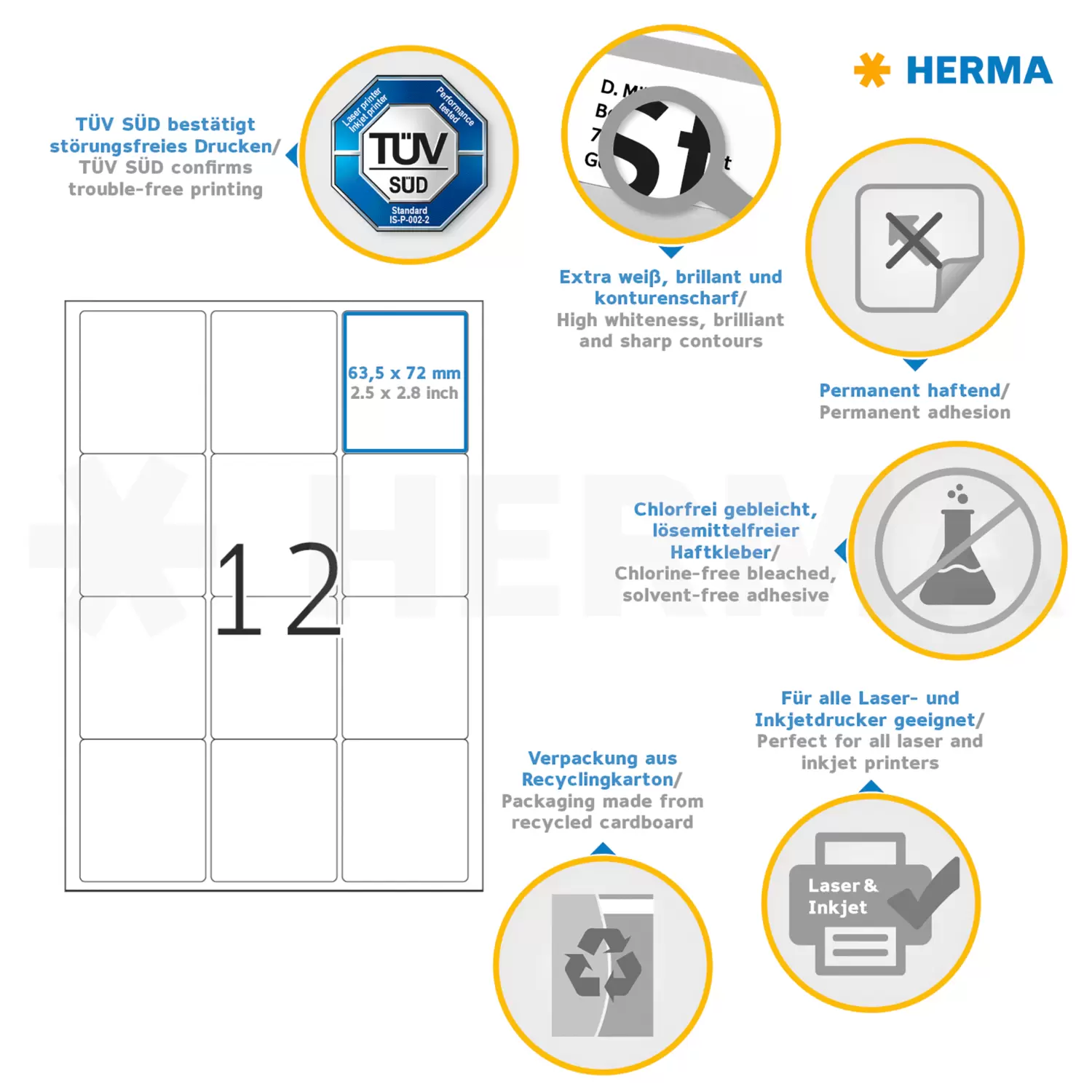Selbstklebende Etiketten auf A4-Blättern, permanent haftend. Perfekt für alle Laser- und Inkjetdrucker, Kopierer, Farblaserdrucker und Farbkopierer. Garantiert staufrei und high-speed-fähig durch extra starken Spezialverbund, Top-Planlage und Rundum-Sicherheitskante. Problemloser Druckerdurchlauf für Laserdrucker und Inkjetdrucker getestet und bestätigt durch den TÜV SÜD. Hoher Weißegrad und gleichmäßige Oberfläche für beste Druckergebnisse in Schwarz und Farbe. Spürbar dicker: extra starke Etiketten, einfaches Aufkleben. Besonders schnell und sicher haftend, auch auf kühlen und feuchten Oberflächen. Umweltschonend und nachhaltig: chlorfrei gebleicht, FSC® Mix Credit-zertifiziert, lösemittelfreier Haftkleber. Etikettenmaterial recyclingfähig mit dem Altpapier, Trägerpapier mit dem Restmüll entsorgen, Verpackung aus Recyclingkarton. Kostenlose Softwarelösungen: www.herma.de/software.