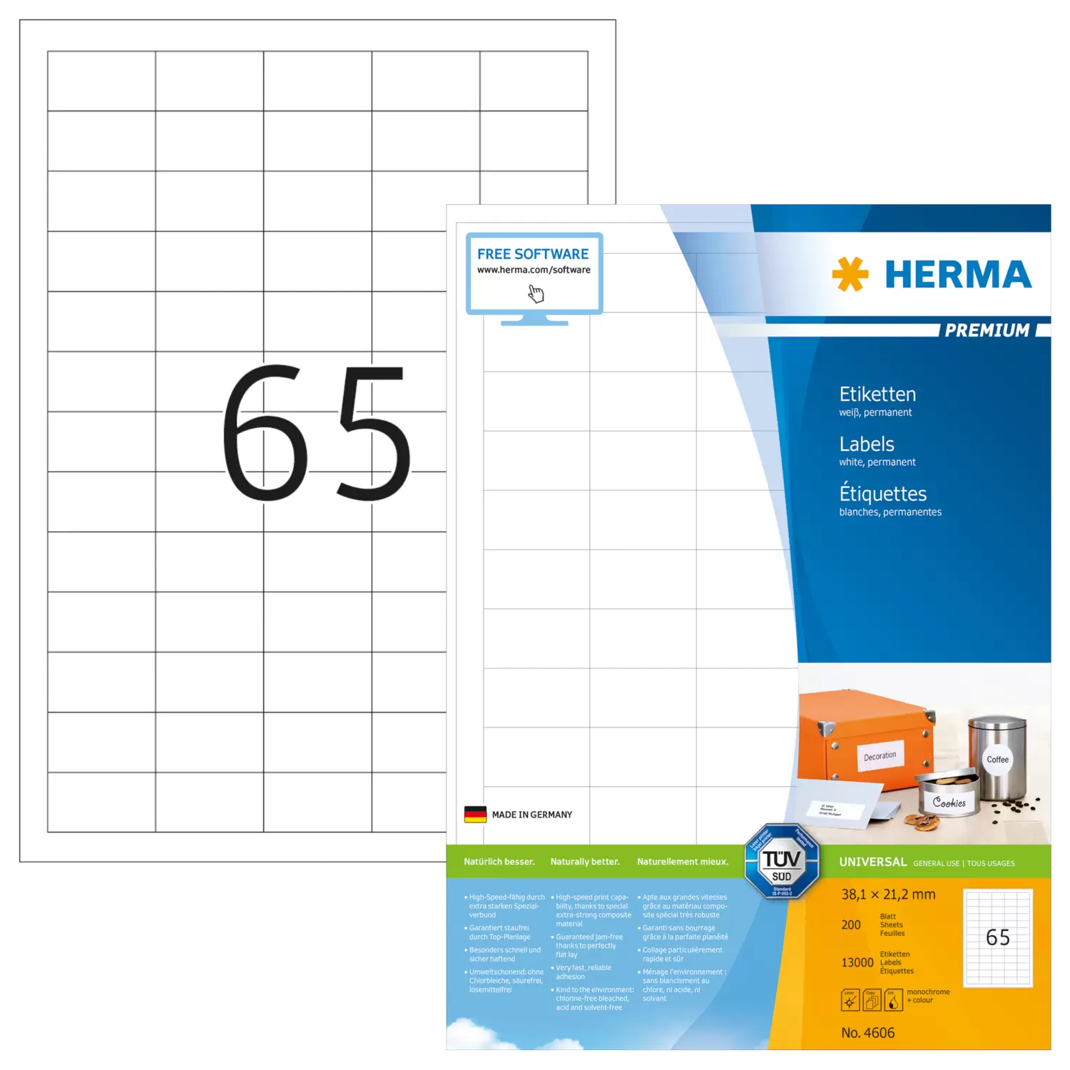 Selbstklebende Etiketten auf A4-Blättern, permanent haftend. Perfekt für alle Laser- und Inkjetdrucker, Kopierer, Farblaserdrucker und Farbkopierer. Garantiert staufrei und high-speed-fähig durch extra starken Spezialverbund, Top-Planlage und Rundum-Sicherheitskante. Problemloser Druckerdurchlauf für Laserdrucker und Inkjetdrucker getestet und bestätigt durch den TÜV SÜD. Hoher Weißegrad und gleichmäßige Oberfläche für beste Druckergebnisse in Schwarz und Farbe. Spürbar dicker: extra starke Etiketten, einfaches Aufkleben. Besonders schnell und sicher haftend, auch auf kühlen und feuchten Oberflächen. Umweltschonend und nachhaltig: chlorfrei gebleicht, FSC® Mix Credit-zertifiziert, lösemittelfreier Haftkleber. Etikettenmaterial recyclingfähig mit dem Altpapier, Trägerpapier mit dem Restmüll entsorgen, Verpackung aus Recyclingkarton. Kostenlose Softwarelösungen: www.herma.de/software.