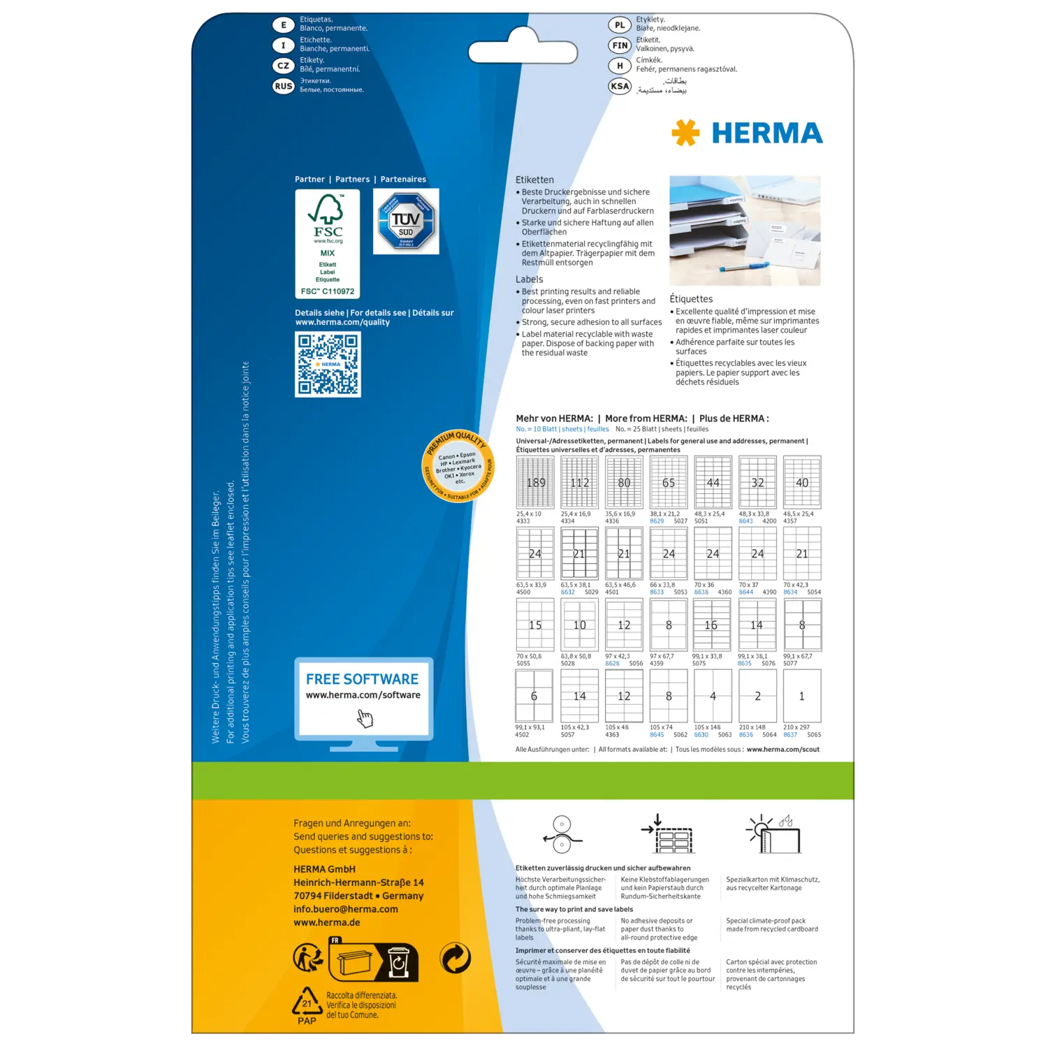 Selbstklebende Etiketten auf A4-Blättern, permanent haftend. Perfekt für alle Laser- und Inkjetdrucker, Kopierer, Farblaserdrucker und Farbkopierer. Garantiert staufrei und high-speed-fähig durch extra starken Spezialverbund, Top-Planlage und Rundum-Sicherheitskante. Problemloser Druckerdurchlauf für Laserdrucker und Inkjetdrucker getestet und bestätigt durch den TÜV SÜD. Hoher Weißegrad und gleichmäßige Oberfläche für beste Druckergebnisse in Schwarz und Farbe. Spürbar dicker: extra starke Etiketten, einfaches Aufkleben. Besonders schnell und sicher haftend, auch auf kühlen und feuchten Oberflächen. Umweltschonend und nachhaltig: chlorfrei gebleicht, FSC® Mix Credit-zertifiziert, lösemittelfreier Haftkleber. Etikettenmaterial recyclingfähig mit dem Altpapier, Trägerpapier mit dem Restmüll entsorgen, Verpackung aus Recyclingkarton. Kostenlose Softwarelösungen: www.herma.de/software.