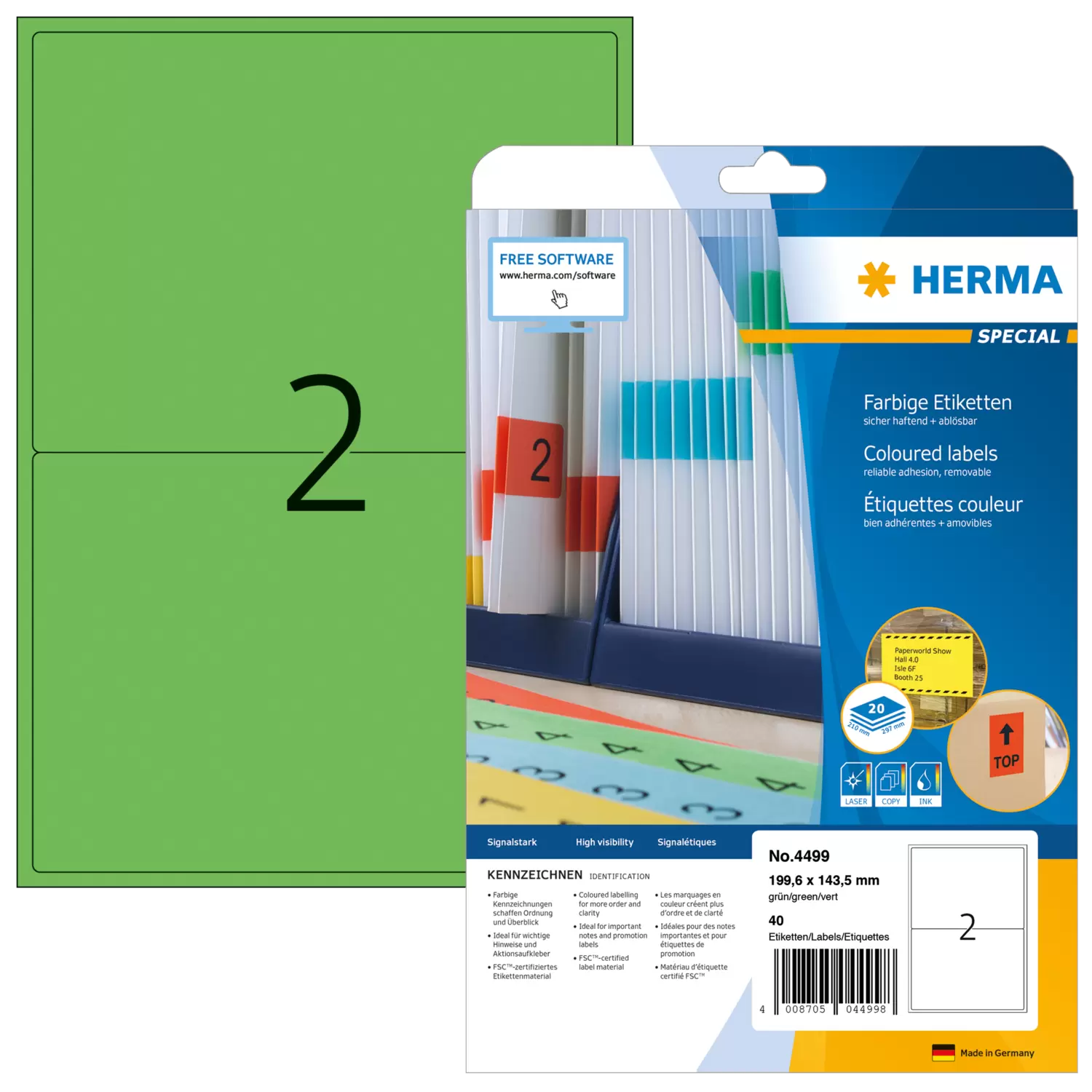 Farbige Etiketten auf A4-Blättern, selbstklebend. Ideal für Kennzeichnungen mit Signalcharakter, z. B. Warnhinweise, Eilvermerke, Adressänderungen, Farbcodierung, Aktionen,... Umweltfreundlich: FSC® Mix Credit-zertifiziertes Etikettenpapier, chlorfrei gebleicht, lösemittelfreier Haftkleber. Etiketten sind 100 % recyclingfähig mit dem Altpapier, Verpackung aus Recyclingkarton. Sehr gute Druckergebnisse auf allen Laser- und Inkjetdruckern, Kopierern, Farblaserdruckern und Farbkopierern. Störungsfreie Verarbeitung durch Rundum-Sicherheitskante und optimale Planlage. Kostenlose Softwarelösungen: www.herma.de/software.