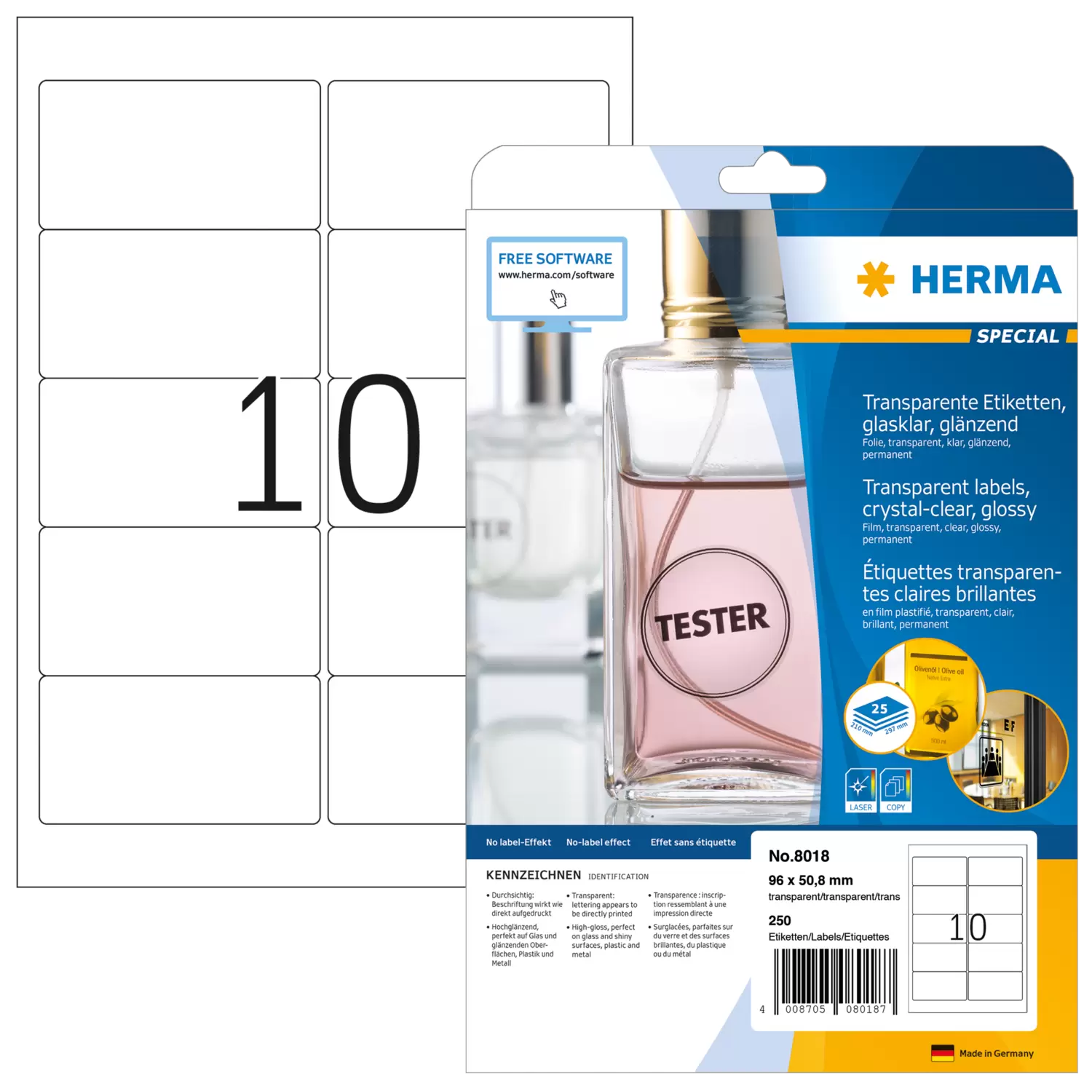 Transparente glasklare Folien-Etiketten auf A4-Blättern, selbstklebend. Hochglänzend, perfekt für optisch anspruchsvolle Anwendungen. Ideal auf Glas und glänzenden Oberflächen, Plastik, Metall und farbigem Untergrund. Als hochwertiges Produktetikett, für repräsentative Unterlagen und Geschenkboxen, zur Kennzeichnung von Büroutensilien, als Schaufensteraufkleber und Türschild, oder zum Adressieren. No Label-Effekt: Beschriftung wirkt wie direkt aufgedruckt. Wetterfest, alterungsbeständig, Öl und Schmutz abweisend, abwaschbar. Störungsfreie Verarbeitung durch Rundum-Sicherheitskante und optimale Planlage. Für Laserdrucker und Kopierer, Farblaserdrucker und Farbkopierer. Nicht für Inkjetdrucker geeignet. Kostenlose Softwarelösungen: www.herma.de/software.