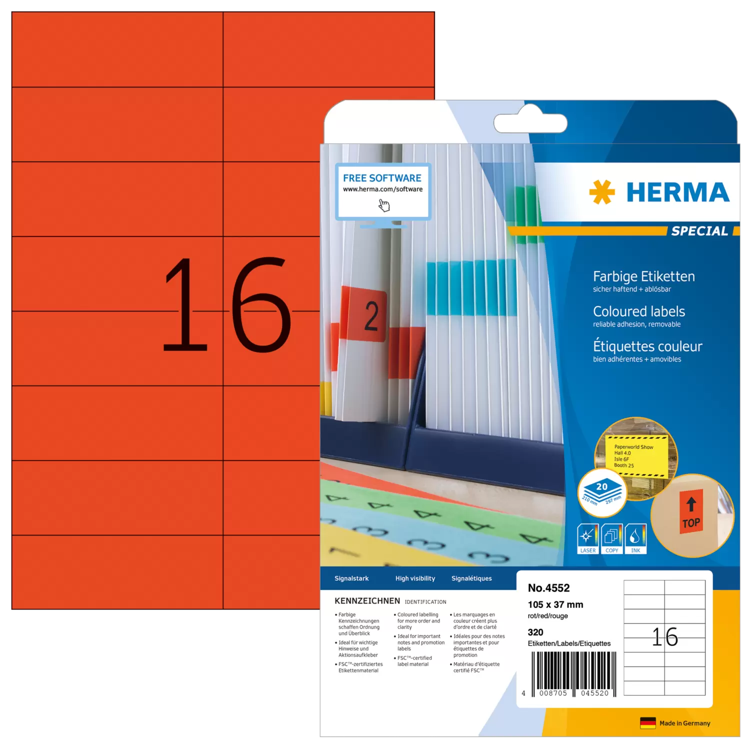 Farbige Etiketten auf A4-Blättern, selbstklebend. Ideal für Kennzeichnungen mit Signalcharakter, z. B. Warnhinweise, Eilvermerke, Adressänderungen, Farbcodierung, Aktionen,... Umweltfreundlich: FSC® Mix Credit-zertifiziertes Etikettenpapier, chlorfrei gebleicht, lösemittelfreier Haftkleber. Etiketten sind 100 % recyclingfähig mit dem Altpapier, Verpackung aus Recyclingkarton. Sehr gute Druckergebnisse auf allen Laser- und Inkjetdruckern, Kopierern, Farblaserdruckern und Farbkopierern. Störungsfreie Verarbeitung durch Rundum-Sicherheitskante und optimale Planlage. Kostenlose Softwarelösungen: www.herma.de/software.