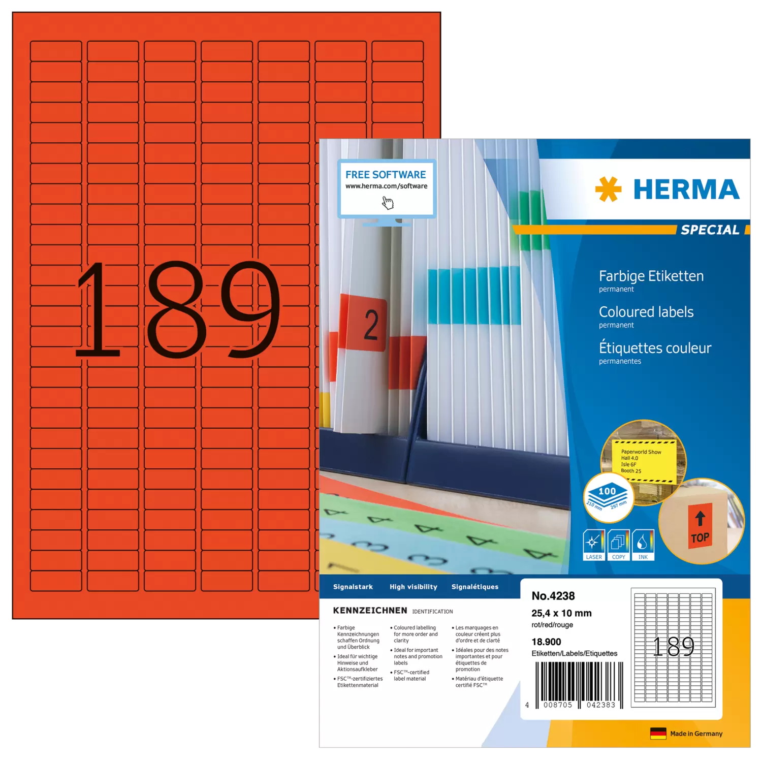 Farbige Etiketten auf A4-Blättern, selbstklebend. Ideal für Kennzeichnungen mit Signalcharakter, z. B. Warnhinweise, Eilvermerke, Adressänderungen, Farbcodierung, Aktionen,... Umweltfreundlich: FSC® Mix Credit-zertifiziertes Etikettenpapier, chlorfrei gebleicht, lösemittelfreier Haftkleber. Etiketten sind 100 % recyclingfähig mit dem Altpapier, Verpackung aus Recyclingkarton. Sehr gute Druckergebnisse auf allen Laser- und Inkjetdruckern, Kopierern, Farblaserdruckern und Farbkopierern. Störungsfreie Verarbeitung durch Rundum-Sicherheitskante und optimale Planlage. Kostenlose Softwarelösungen: www.herma.de/software.