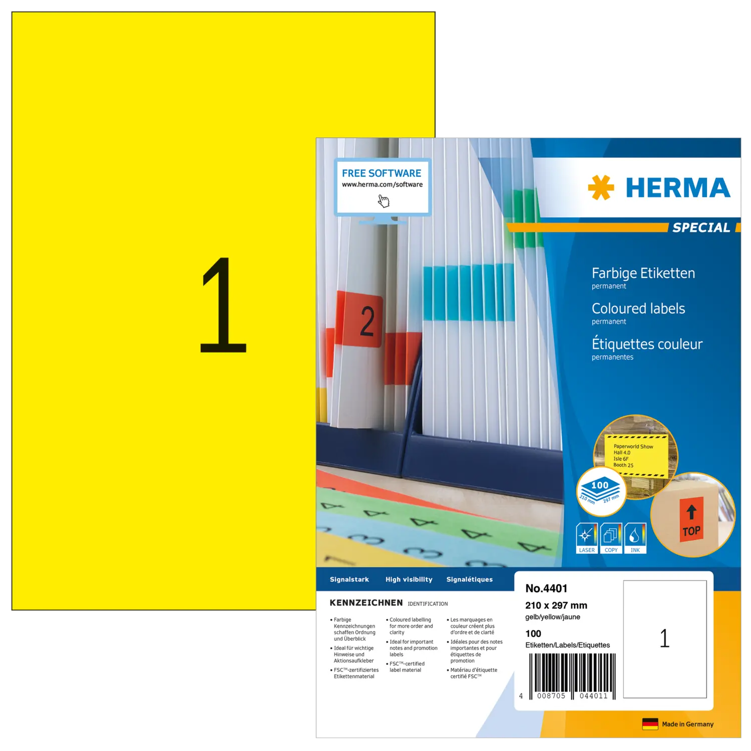 Farbige Etiketten auf A4-Blättern, selbstklebend. Ideal für Kennzeichnungen mit Signalcharakter, z. B. Warnhinweise, Eilvermerke, Adressänderungen, Farbcodierung, Aktionen,... Umweltfreundlich: FSC® Mix Credit-zertifiziertes Etikettenpapier, chlorfrei gebleicht, lösemittelfreier Haftkleber. Etiketten sind 100 % recyclingfähig mit dem Altpapier, Verpackung aus Recyclingkarton. Sehr gute Druckergebnisse auf allen Laser- und Inkjetdruckern, Kopierern, Farblaserdruckern und Farbkopierern. Störungsfreie Verarbeitung durch Rundum-Sicherheitskante und optimale Planlage. Kostenlose Softwarelösungen: www.herma.de/software.