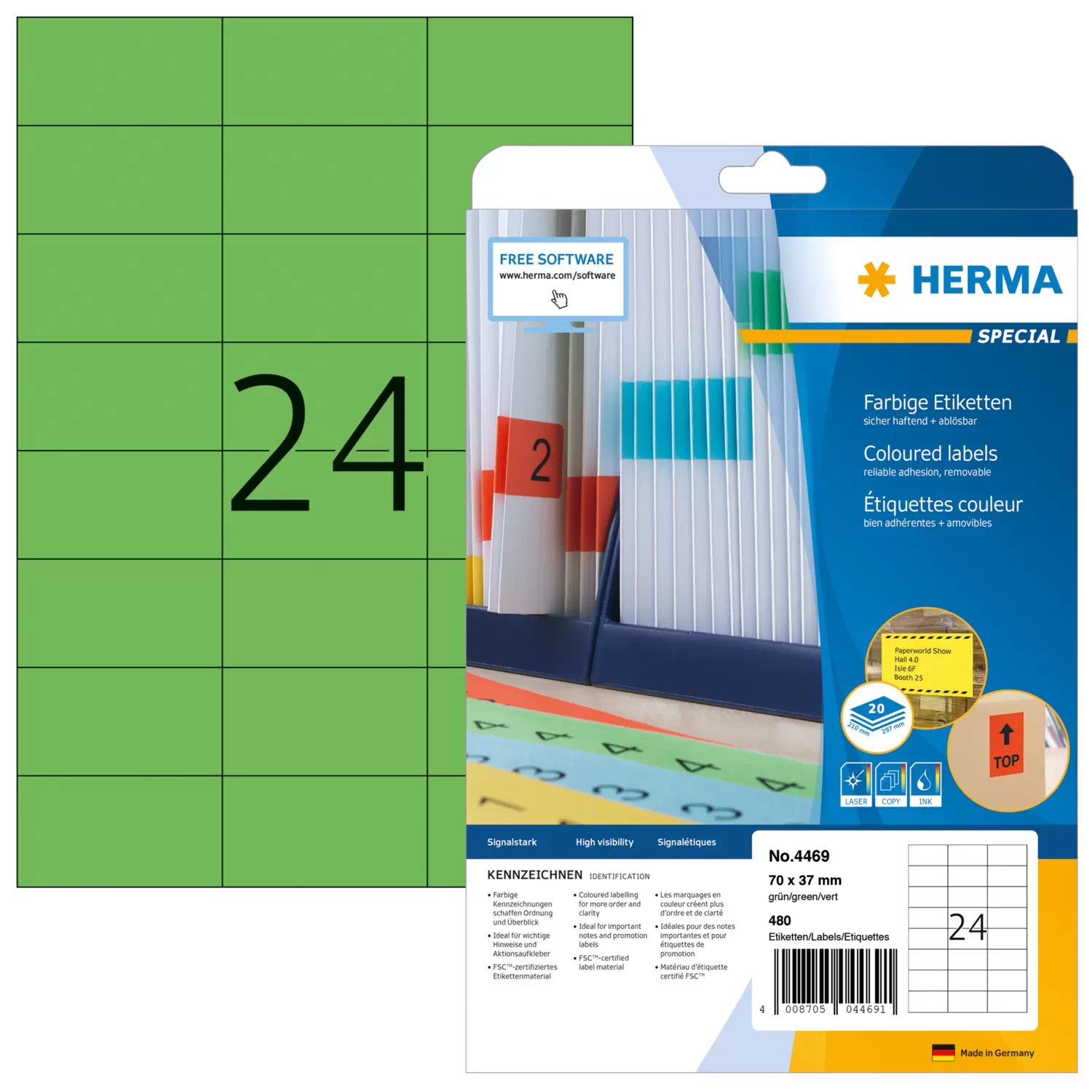 Farbige Etiketten auf A4-Blättern, selbstklebend. Ideal für Kennzeichnungen mit Signalcharakter, z. B. Warnhinweise, Eilvermerke, Adressänderungen, Farbcodierung, Aktionen,... Umweltfreundlich: FSC® Mix Credit-zertifiziertes Etikettenpapier, chlorfrei gebleicht, lösemittelfreier Haftkleber. Etiketten sind 100 % recyclingfähig mit dem Altpapier, Verpackung aus Recyclingkarton. Sehr gute Druckergebnisse auf allen Laser- und Inkjetdruckern, Kopierern, Farblaserdruckern und Farbkopierern. Störungsfreie Verarbeitung durch Rundum-Sicherheitskante und optimale Planlage. Kostenlose Softwarelösungen: www.herma.de/software.