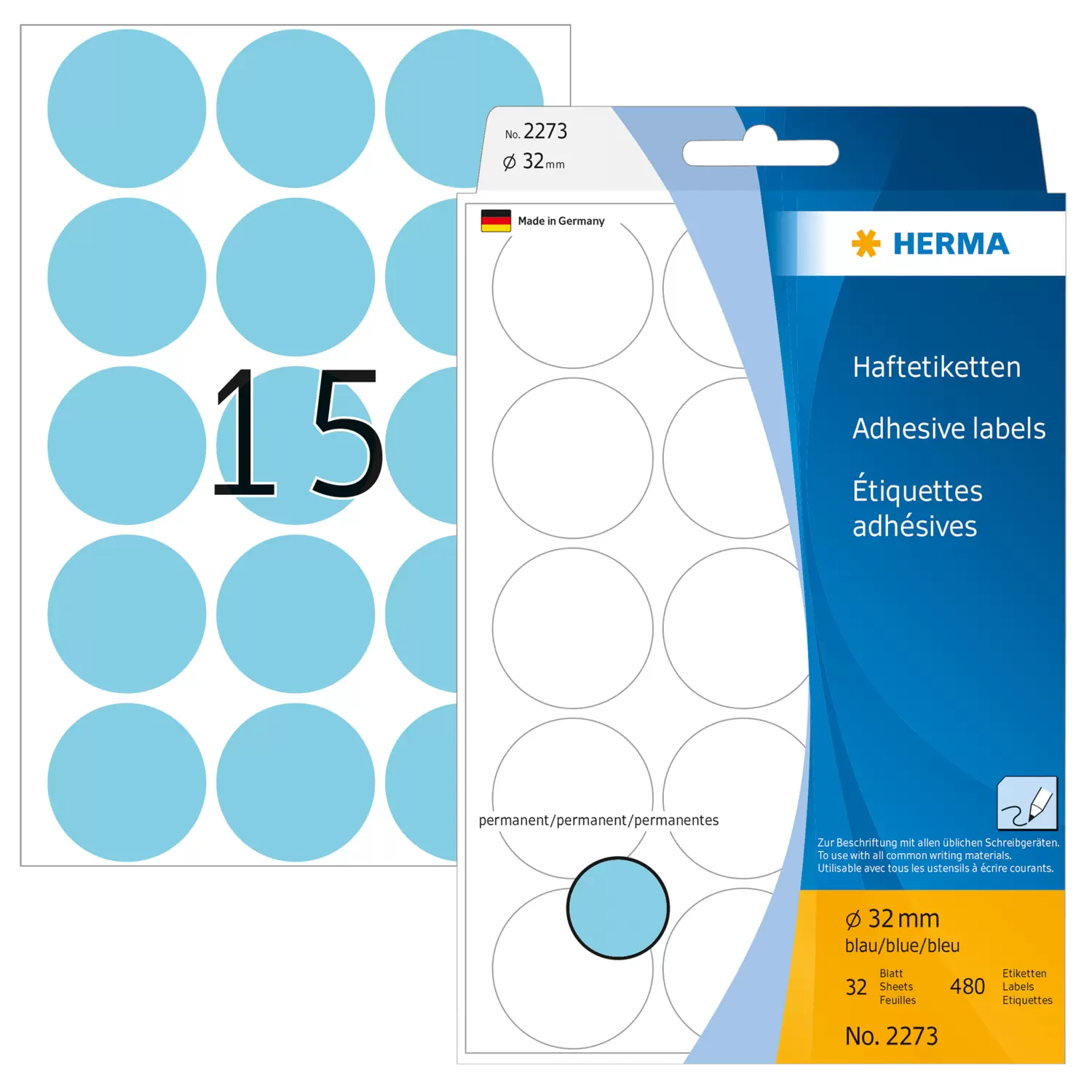 Vielzwecketiketten/Farbpunkte Ø 32 mm, rund, blau, permanent haftend, zur Handbeschriftung