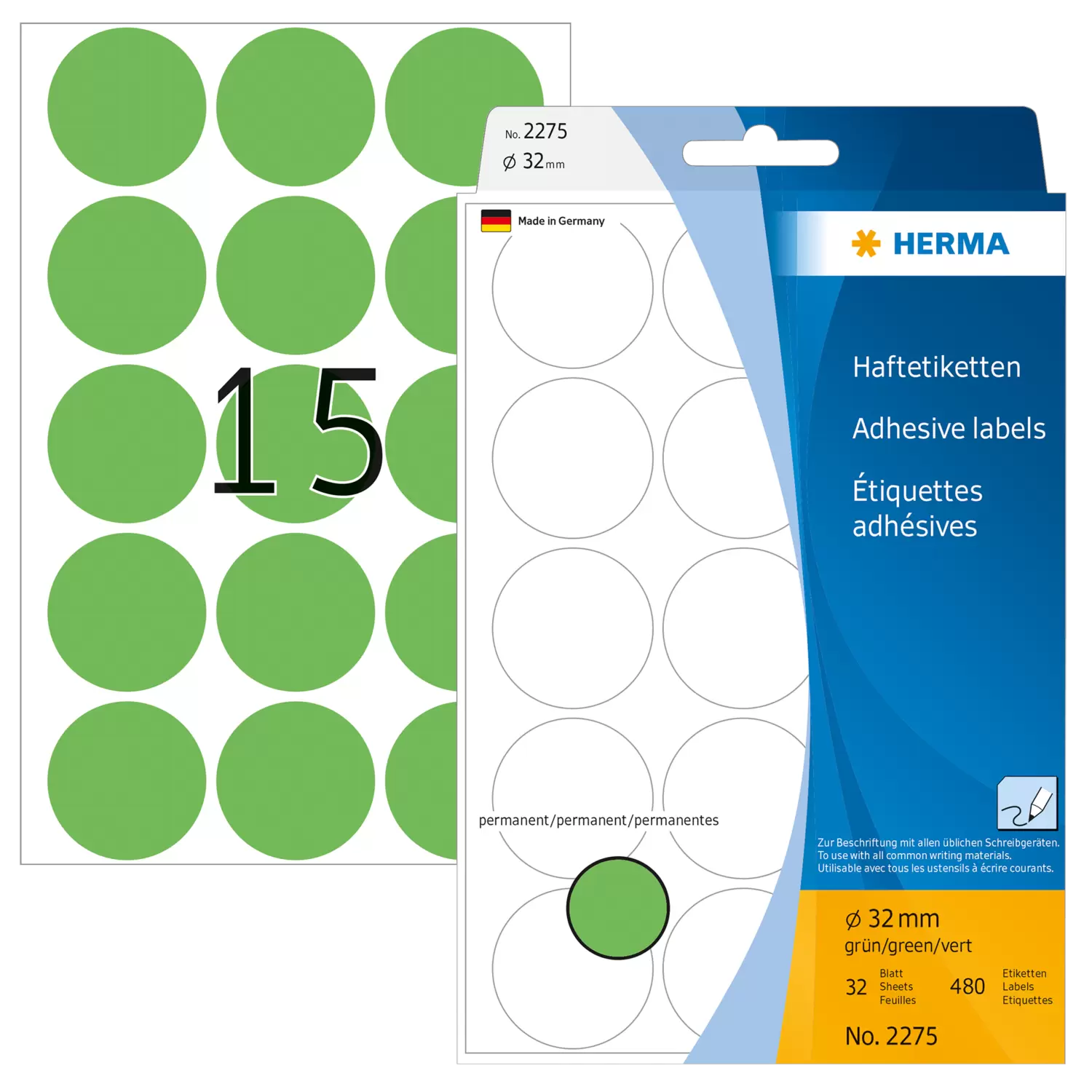 Vielzwecketiketten/Farbpunkte Ø 32 mm, rund, grün, permanent haftend, zur Handbeschriftung