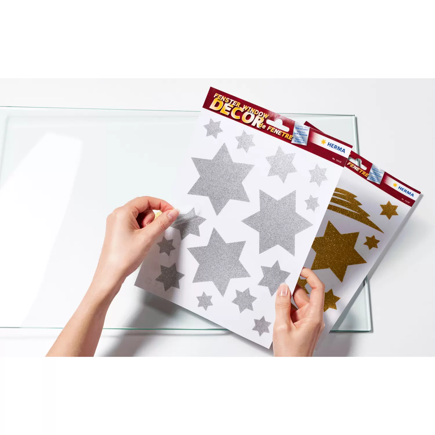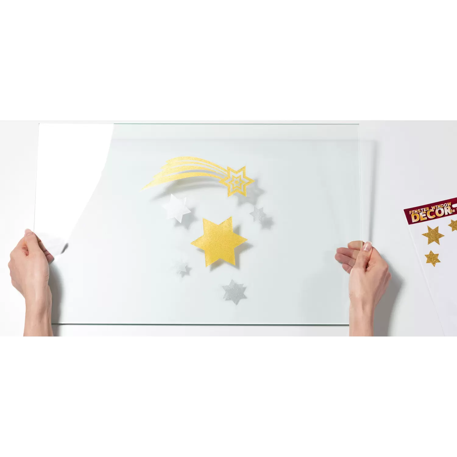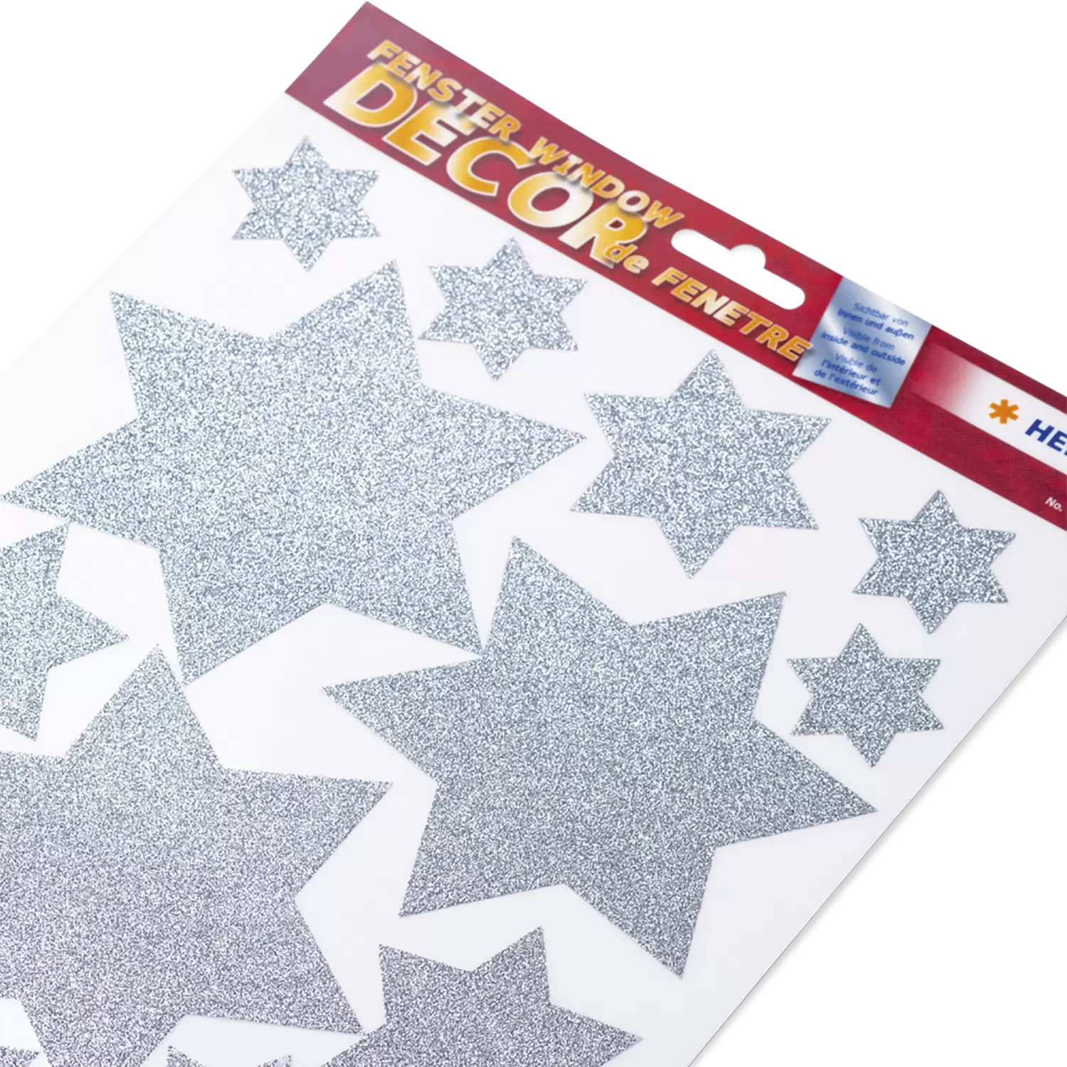 • Silbern glitzernde Fensterdekoration mit Sternen