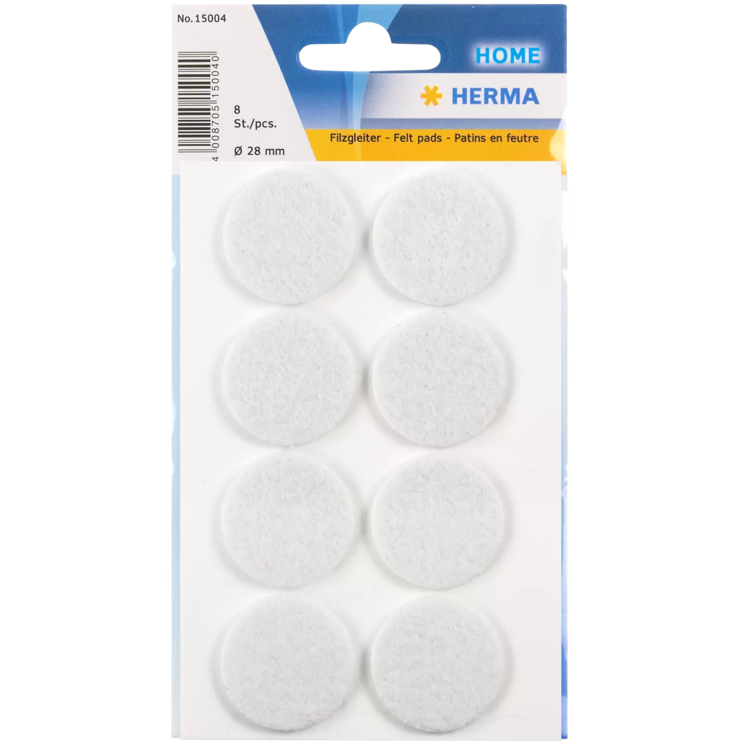 Die weißen Filzgleiter können empfindliche Oberflächen wie Parkett, Laminat oder Fliesen vor Verkratzen schützen und das Verschieben von Möbelstücken auf glatten Untergründen erleichtern. Sie können außerdem zum Schutz von Tischplatten aus Holz, Stein oder Glas genutzt werden. Hierzu müssen die runden Filzgleiter mit Durchmesser von 28 mm nur auf die Unterseite von Möbelstücken, Dekoration oder anderen Gegenständen geklebt werden. Die "Filzgleiter weiß 28 mm" von HERMA sind einfach und schnell anzuwenden und in zahlreichen verschiedensten Bereichen einsetzbar. Tische, Stühle, Sofas oder auch kleinere Gegenstände wie Vasen lassen s ich, dank diesen qualitativ hochwertigen Gleitern, ganz einfach verschieben ohne sensible Untergründe zu beschädigen. Die Gleiter aus Filz in bewährter HERMA-Qualität sind selbstklebend und halten zuverlässig. In einer Packung sind 8 runde Filzgleiter Ø 28 mm in weiß enthalten.