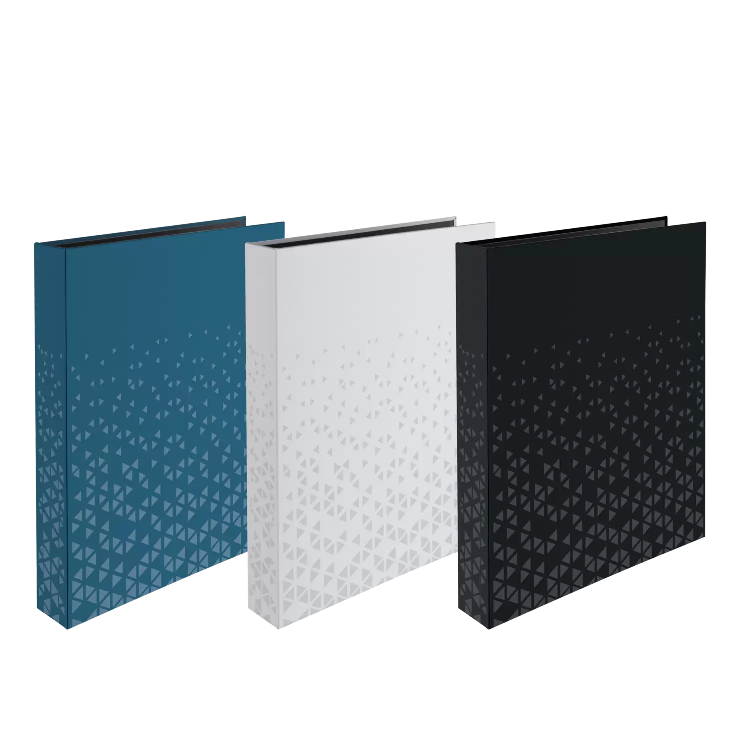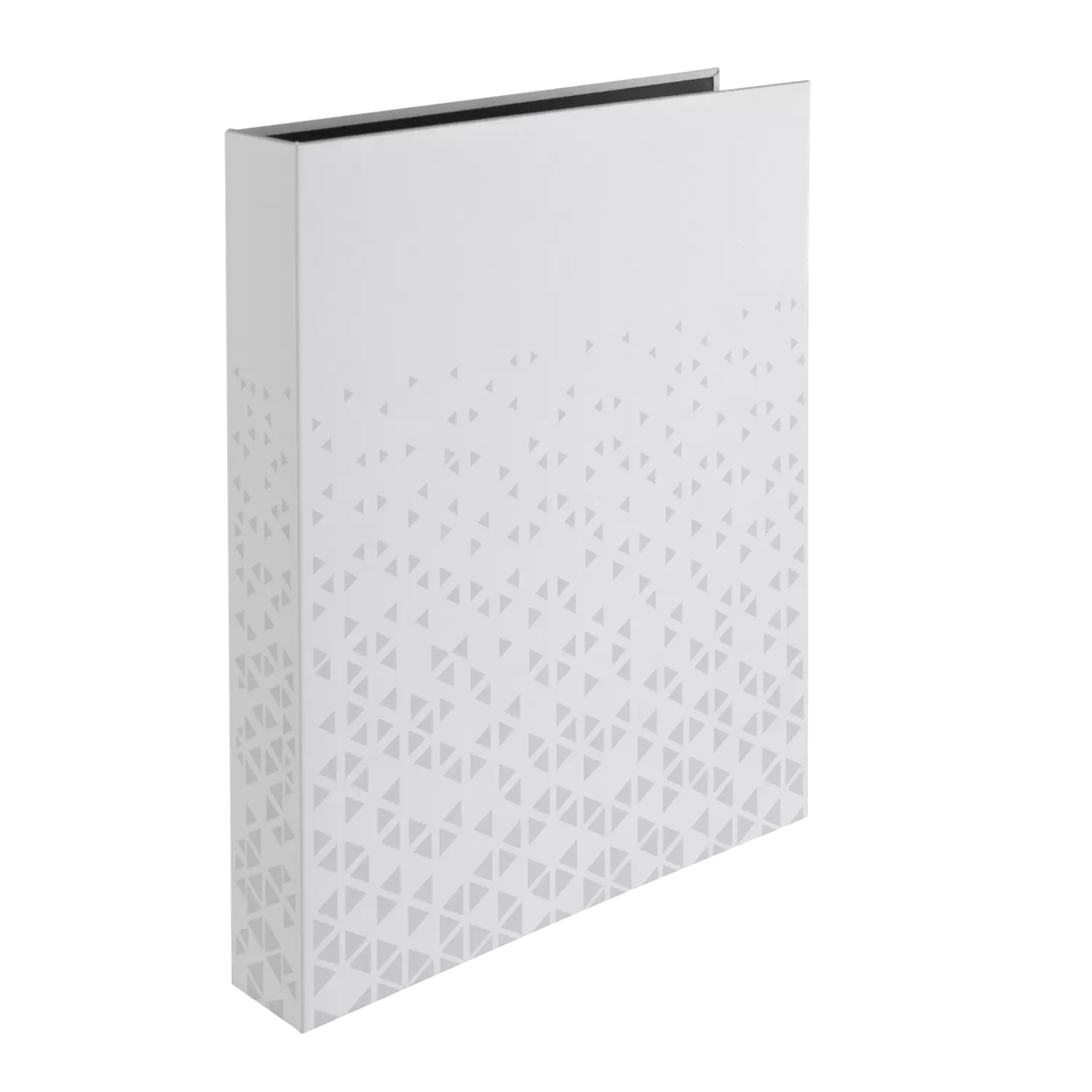 Design trifft Funktion: Das Fotobook, das Ordnung stilvoll macht! Die perfekte Wahl für alle, die Wert auf Stil und Funktionalität legen. Das folienveredelte Dreiecks-Muster in der Farbe weiß und die samtige Softtouch-Oberfläche sorgen für ein modernes und hochwertiges Erscheinungsbild. Der stabile Karton schützt den Inhalt zuverlässig, während die 4-Ring-Mechanik ideal für Foto- und Prospekthüllen ist. Mit einer praktischen Rückenbreite von 46 mm bietet es viel Platz für Fotos und Unterlagen und wirkt dabei elegant und platzsparend.