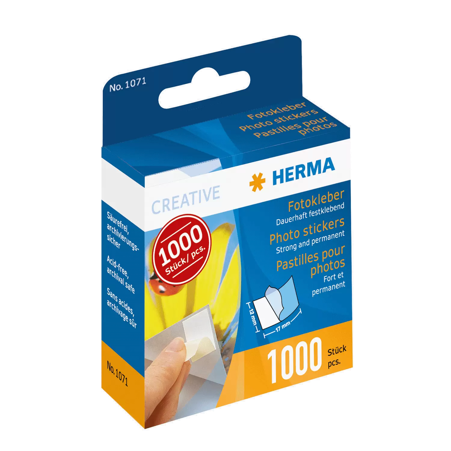 - HERMA Fotokleber, permanent haftend, beidseitig selbstklebende Papierstücke, Vorderseite mit Schutzpapier abgedeckt