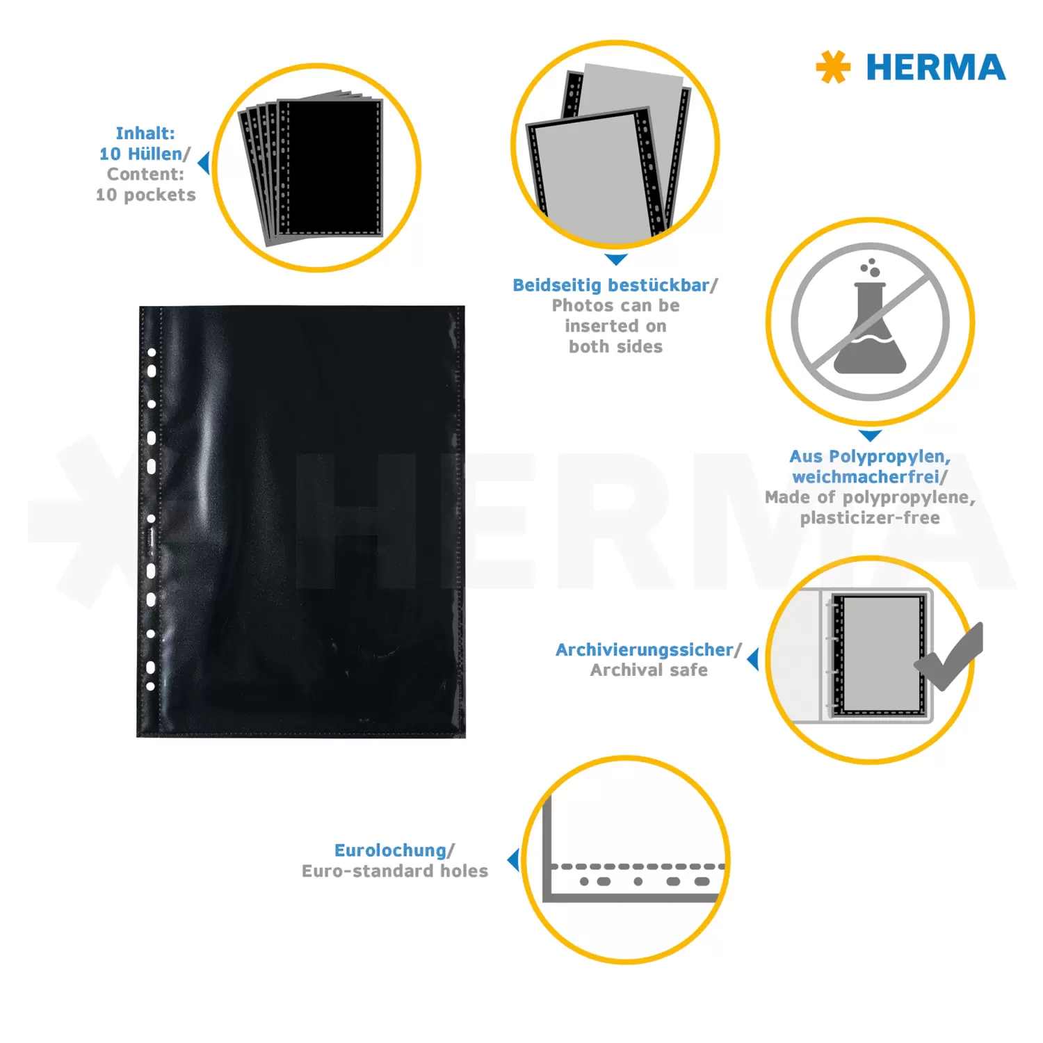 Die HERMA Fotosichthüllen Fotophan sind die praktischen Ordnungs- und Archivierungshelfer für Fotos, Bilder, Postkarten, Eintrittskarten und vieles mehr. Einfach in die Klarsichttaschen schieben und schon ist Alles sicher verstaut - unkompliziert und ganz ohne Kleben! Die Fotosichthüllen bestehen aus robustem schwarzem Polypropylen, mit beidseitig aufgeschweißten klar-transparenten Einstecktaschen für Fotos im Format bis zu 20 x 30 cm. So lassen sich 2 Fotos pro Hülle sicher und geschützt aufbewahren. Die Hüllen sind absolut weichmacherfrei und archivierungssicher, ohne chemische Einflüsse auf die Bilder. Durch die praktische Eurolochung lassen sie sich in alle gängigen Ordner, Alben und Ringbücher für DIN A4 Formate einheften. Ideal sind die HERMA Fotobooks, die in 5 tollen Farben erhältlich sind. Perfekter Schutz, ganz ohne Schmutz, Knicke oder Fingerabdrücke.