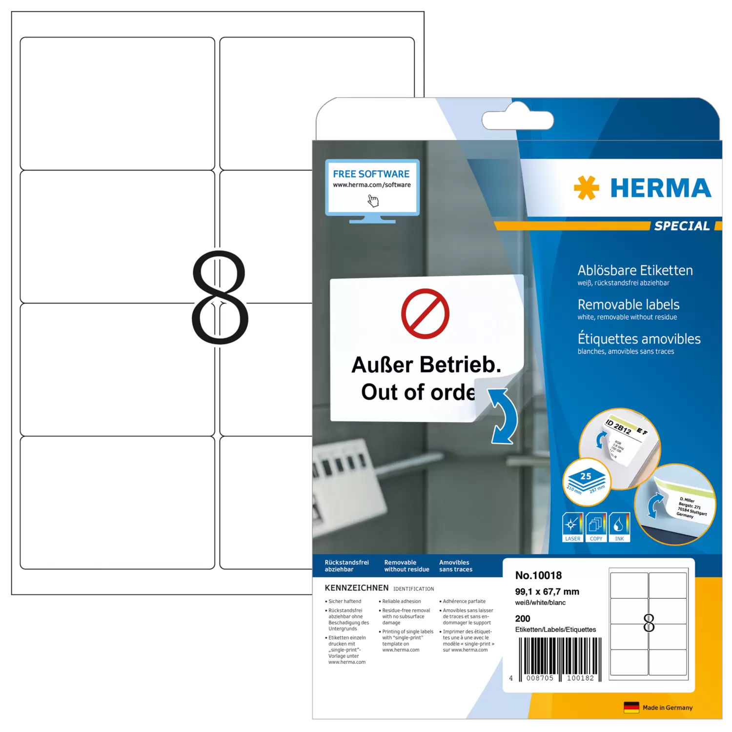 Selbstklebende Etiketten auf A4-Blättern. Sicher haftend auf allen glatten, trockenen, unbeschädigten und staubfreien Flächen. Rückstandsfrei wieder abziehbar, ohne den Untergrund zu beschädigen. Ideal für zeitlich befristete oder wechselnde Kennzeichnungen und Oberflächen, die nicht beschädigt werden sollen. Sehr gute Druckergebnisse auf allen Laser- und Inkjetdruckern, Kopierern, Farblaserdruckern und Farbkopierern. Störungsfreie Verarbeitung durch Rundum-Sicherheitskante und optimale Planlage. Umweltfreundlich: FSC® Mix Credit-zertifiziert, chlorfrei gebleicht, lösemittelfreier Haftkleber. Etiketten sind 100 % recyclingfähig mit dem Altpapier, Verpackung aus Recyclingkarton. Kostenlose Softwarelösungen: www.herma.de/software.