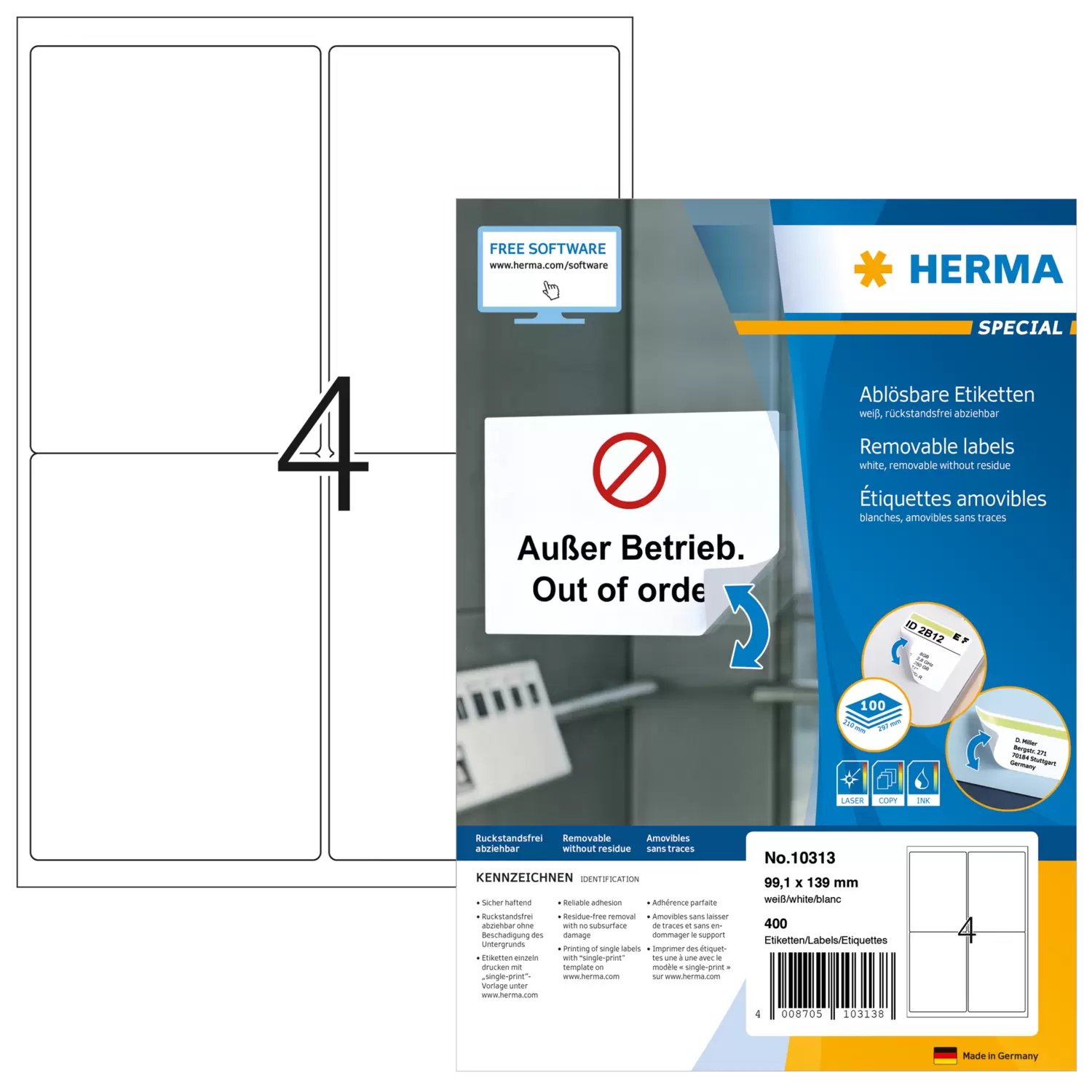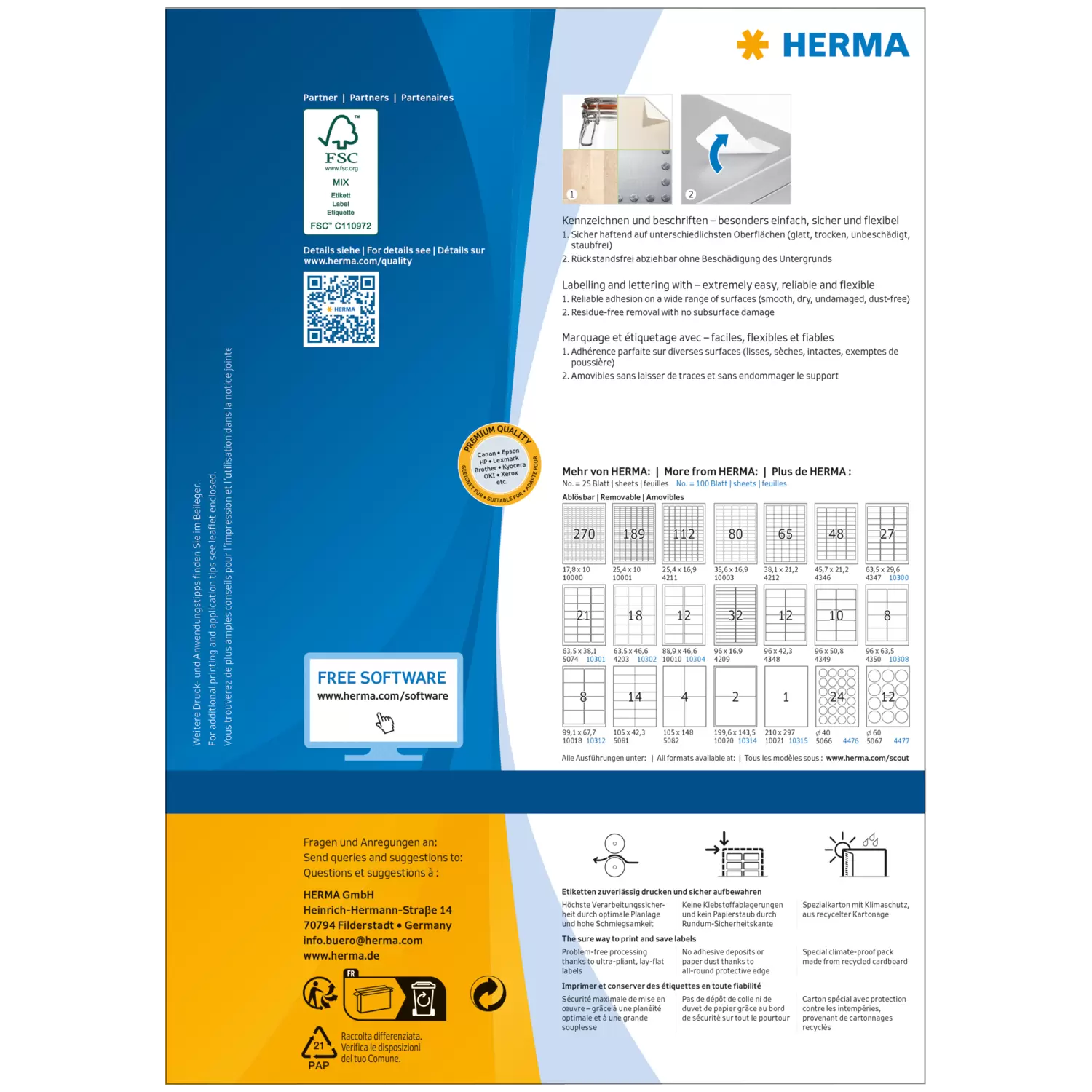 Selbstklebende Etiketten auf A4-Blättern. Sicher haftend auf allen glatten, trockenen, unbeschädigten und staubfreien Flächen. Rückstandsfrei wieder abziehbar, ohne den Untergrund zu beschädigen. Ideal für zeitlich befristete oder wechselnde Kennzeichnungen und Oberflächen, die nicht beschädigt werden sollen. Sehr gute Druckergebnisse auf allen Laser- und Inkjetdruckern, Kopierern, Farblaserdruckern und Farbkopierern. Störungsfreie Verarbeitung durch Rundum-Sicherheitskante und optimale Planlage. Umweltfreundlich: FSC® Mix Credit-zertifiziert, chlorfrei gebleicht, lösemittelfreier Haftkleber. Etiketten sind 100 % recyclingfähig mit dem Altpapier, Verpackung aus Recyclingkarton. Kostenlose Softwarelösungen: www.herma.de/software.