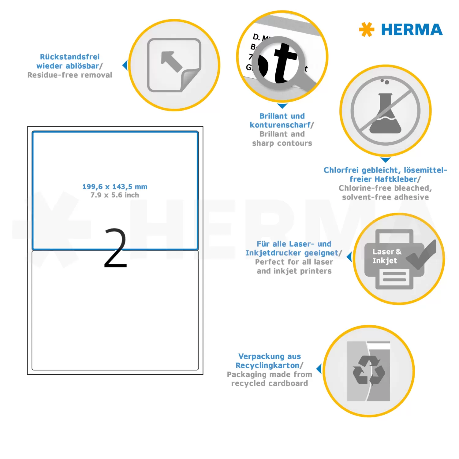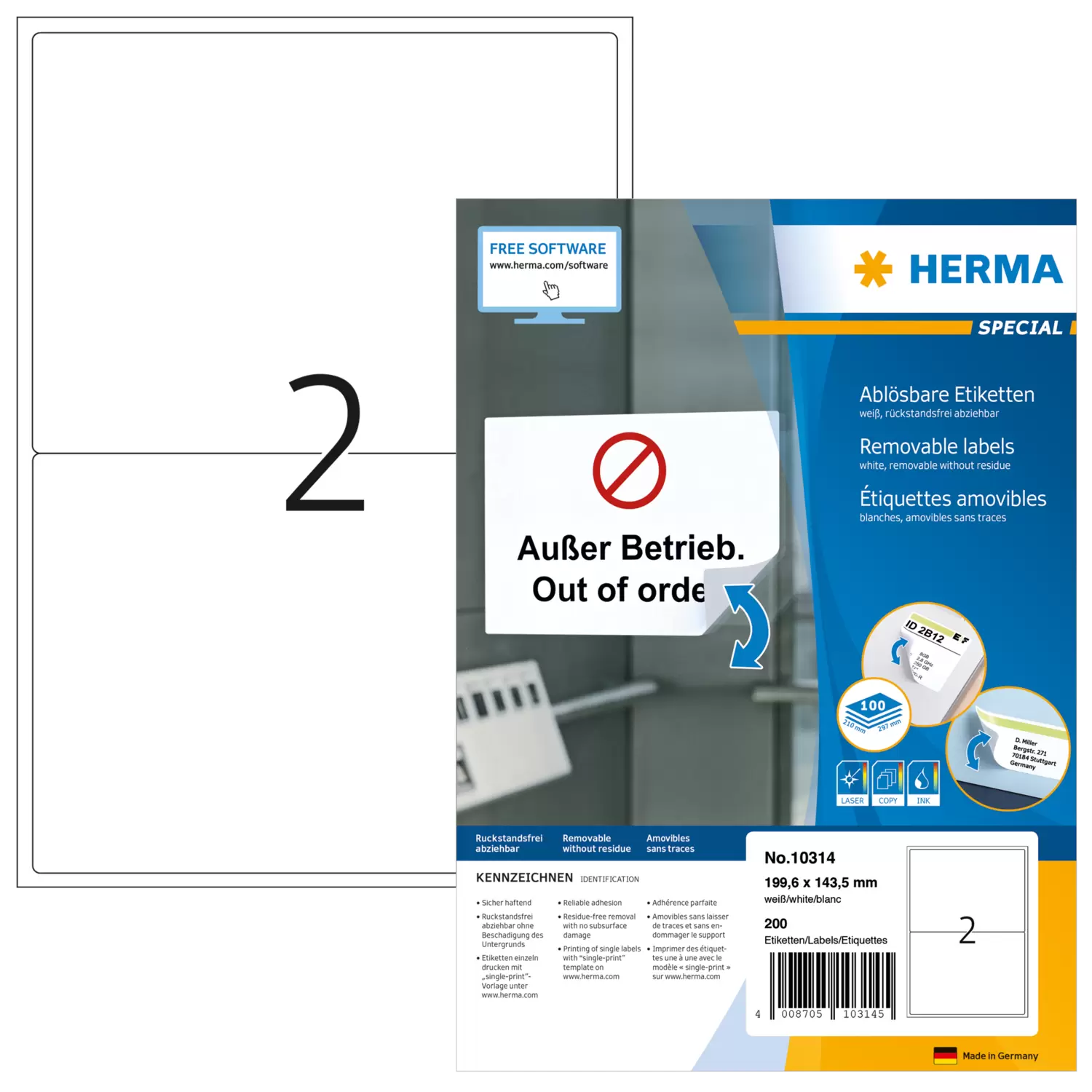 Selbstklebende Etiketten auf A4-Blättern. Sicher haftend auf allen glatten, trockenen, unbeschädigten und staubfreien Flächen. Rückstandsfrei wieder abziehbar, ohne den Untergrund zu beschädigen. Ideal für zeitlich befristete oder wechselnde Kennzeichnungen und Oberflächen, die nicht beschädigt werden sollen. Sehr gute Druckergebnisse auf allen Laser- und Inkjetdruckern, Kopierern, Farblaserdruckern und Farbkopierern. Störungsfreie Verarbeitung durch Rundum-Sicherheitskante und optimale Planlage. Umweltfreundlich: FSC® Mix Credit-zertifiziert, chlorfrei gebleicht, lösemittelfreier Haftkleber. Etiketten sind 100 % recyclingfähig mit dem Altpapier, Verpackung aus Recyclingkarton. Kostenlose Softwarelösungen: www.herma.de/software.