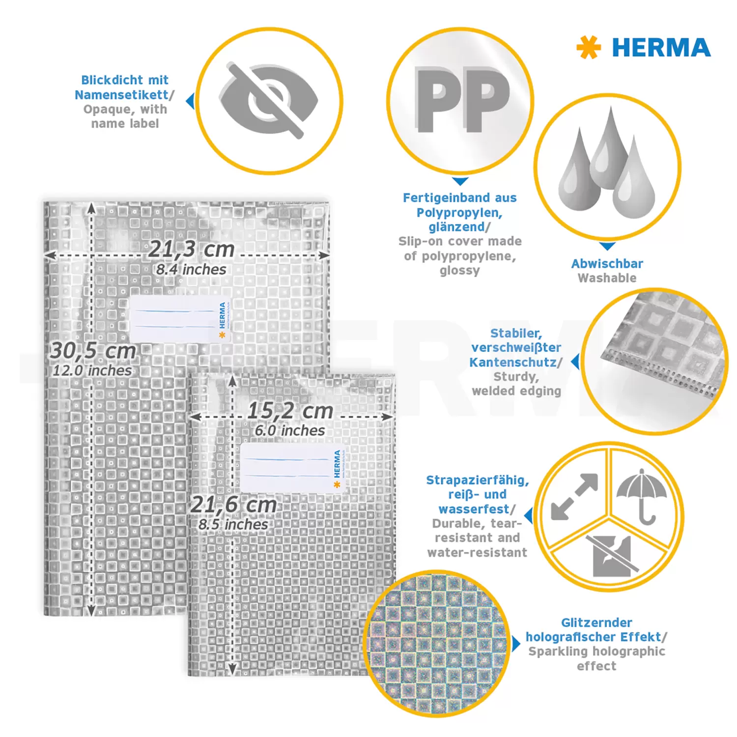 Dieser funkelnde A5 Heftschoner von HERMA ist ein echter Eyecatcher: Durch die auffällige, holografische Glanzfolie, bekommt die silberfarbende Hefthülle im Licht eine ganz besondere Eigenschaft. Fällt Licht auf den Umschlag, verzaubert er durch bunte Regenbogenfarben, die wunderschön funkeln und glitzern. Das kleine Muster, welches auf die Folie gedruckt ist, wirkt dadurch noch besser. Der Heftschutz von HERMA überzeugt sowohl durch das außergewöhnliche Design, als auch die praktische Funktionalität. Das robuste Material Polypropylen ist ein widerstandsfähiger Kunststoff, der sämtliche Arbeitsunterlagen, Rechenhefte sowie Schreib- und Schulhefte in DIN A5 Format sicher vor Umwelteinflüssen wie Staub und Schmutz sowie vor dauerhafter Beanspruchung schützt. Außerdem wird die Gefahr von lästigen Eselsohren an den Eckem minimiert, wodurch die Hefte länger "wie neu" aussehen. Zusätzlich verfügt der Heftschutz über ein auf der Vorderseite angebrachtes Beschriftungsetikett, auf dem wichtige Anmerkungen eingetragen werden können. Informationen über den Besitzer des Heftes, die besuchte Schule oder Klasse oder andere, individuelle Bemerkungen finden hier ihren Platz. Mit diesem Heftumschlag bringen Sie etwas Magie in den Alltag und sorgen gleichzeitig für langlebige, ordentliche Hefte.