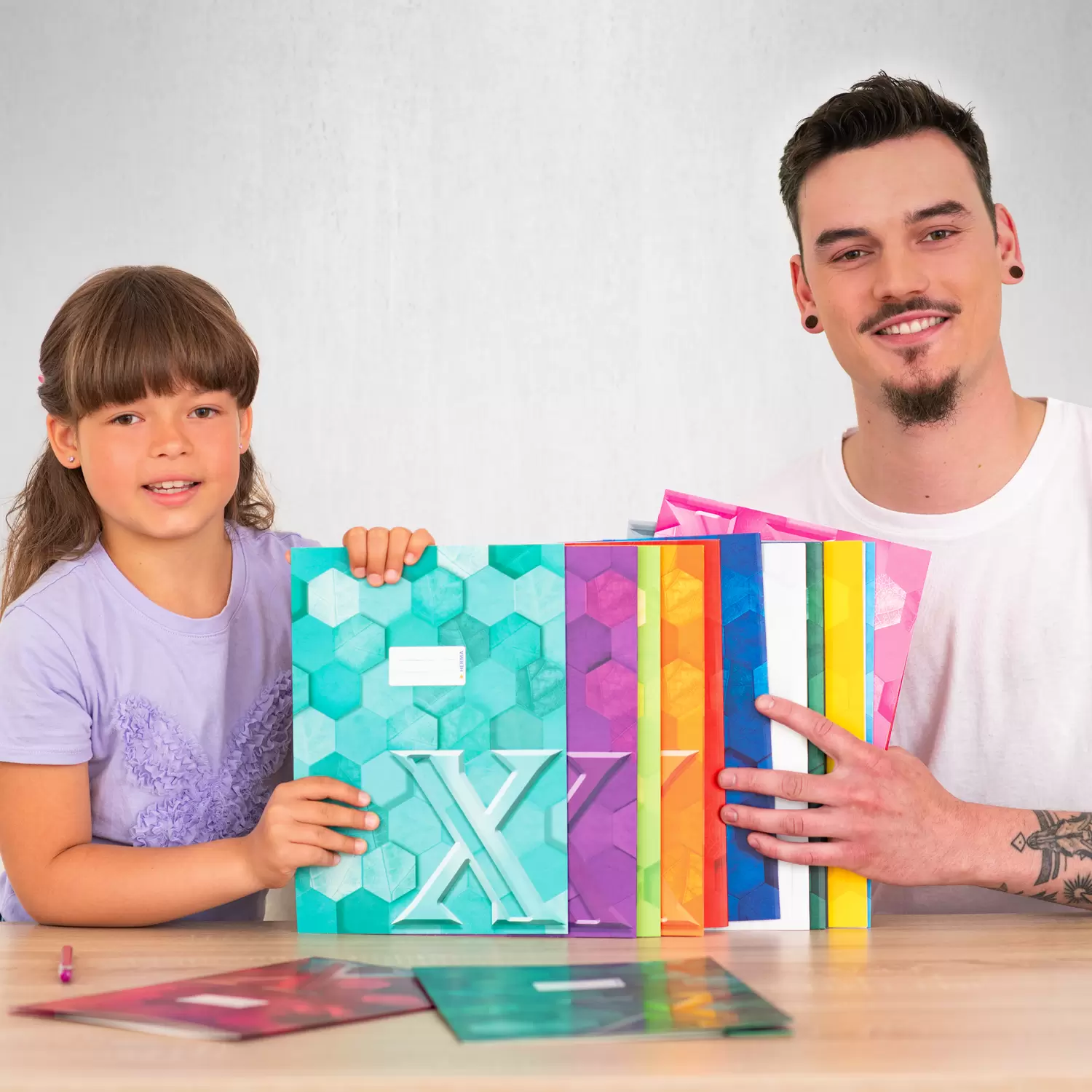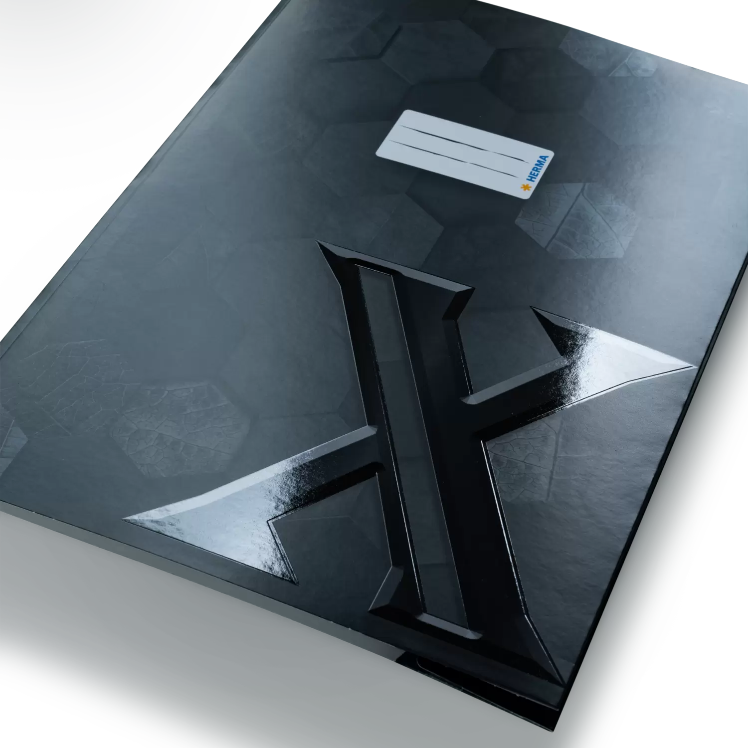 Der HERMA Heftschoner X aus robustem Karton, ist einmalig und geheimnisvoll. Steht das leuchtende, veredelte X auf der Vorderseite für die Variable in der Mathematik, als Code für ein Geheimnis, für das kreative Element oder als Unbekannte für den Inhalt des Heftes, welches geschützt wird? Der Heftschoner der Serie X ist nicht nur ein einfacher Schutzumschlag, sondern ein Tor zu einer Welt voller Abenteuer und Geheimnisse, mystisch und vielfältig. Dieser schwarze Heftschoner X hat das Format DIN A4 und ist mit kunstvollen Hexagonen verziert, diese sind mit feinen Blattstrukturen gefüllt, die eine faszinierende organische Struktur erzeugen. Der Blick auf das coole Design mit dem leuchtenden, veredelten X entfesselt die Kreativität und bringt spielend die Gedanken aufs Papier. Ob in der Schule, beim Lernen oder in der Freizeit – dieser Heftschoner ist der perfekte Begleiter für alle, die das Besondere suchen: Die neue Serie X.