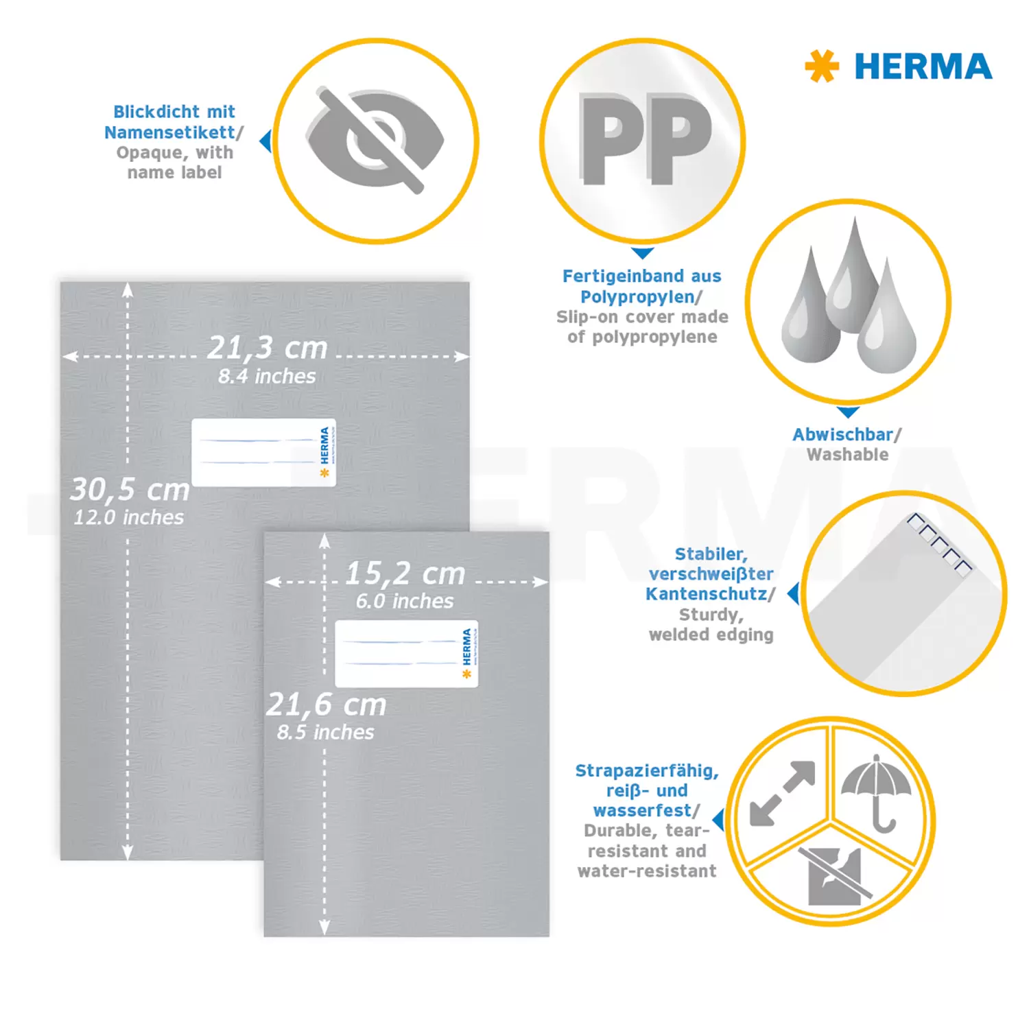 Die bewährten Marken-Heftumschläge von HERMA in den Formaten DIN A4, DIN A5 oder DIN A6 werden aus strapazierfähiger, abwischbarer Polypropylen-Folie produziert und sind ideal für die Verwendung an Grundschule, Schule und Universität. Die Hefthüllen aus Plastik sind in vielen satten Farben und Formaten erhältlich. Das kräftige Material schützt Schulhefte und Arbeitsunterlagen vor Schmutz und Feuchtigkeit. HERMA Marken-Heftschoner sind seit Jahrzehnten bekannt und bewährt.