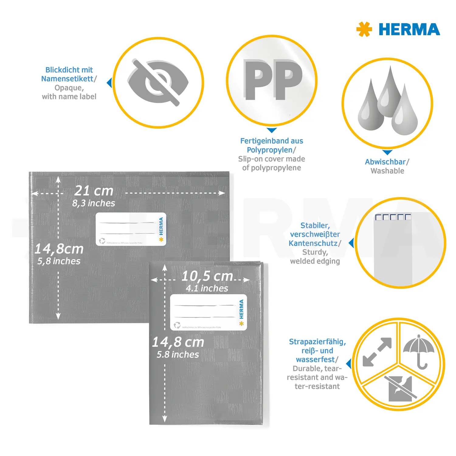 Die bewährten Marken-Heftumschläge von HERMA in den Formaten DIN A4, DIN A5 oder DIN A6 werden aus strapazierfähiger, abwischbarer Polypropylen-Folie produziert und sind ideal für die Verwendung an Grun dschule, Schule und Universität. Die Hefthüllen aus Plastik sind in vielen satten Farben und Formaten erhältlich. Das kräftige Material schützt Schulhefte und Arbeitsunterlagen vor Schmutz und Feuchtigkeit. HERMA Marken-Heftschoner sind seit Jahrzehnten bekannt und bewährt.