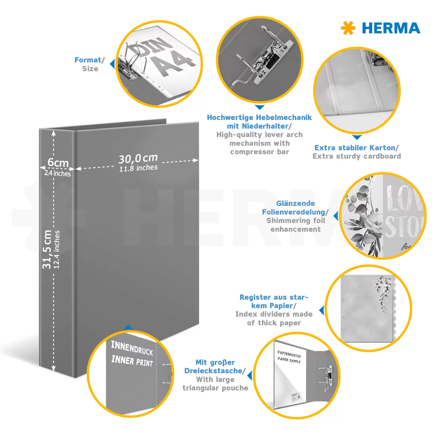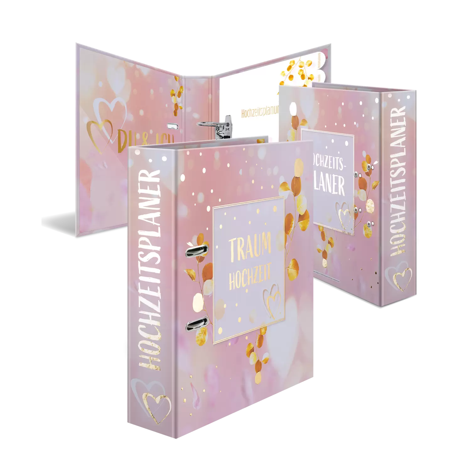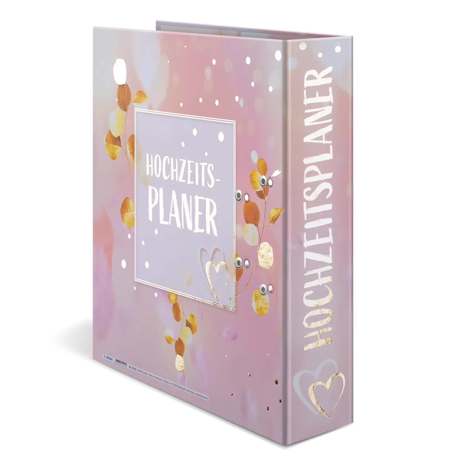 Bald läuten die Hochzeitsglocken und der schönste Tag im Leben zweier Liebenden rückt näher und näher. Doch bevor der Traum einer perfekten Hochzeit wahr wird, müssen Sie im Vorfeld Ihr Organisationstalent unter Beweis stellen. Der Hochzeitsordner von HERMA hilft Ihnen dabei. Viele Dinge müssen geplant und organisiert werden: Wo findet die Trauung statt? Wer wird eingeladen? Wie sieht die Tischdekoration aus? Dieser hübsche und modern gestaltete Ordner hilft Ihnen bei der Archivierung aller wichtigen Hochzeitsunterlagen und sorgt dafür, dass keine Dokumente, Listen oder Notizen verloren gehen. Im handlichen DIN A4 Format lässt er sich einfach überall hin transportieren, sodass Sie alle notwendigen Papiere immer dabei haben. Die hochwertige Hebelmechanik und der Niederhalter aus Metall halten den Ordnerinhalt eng beisammen, sodass dieser nicht verdreckt wird oder herausfallen kann. Das ill ustrierte und übersichtliche Register hilft Ihnen bei der Planung und berücksichtigt alle Punkte, die für eine Hochzeit wichtig sind, wie z.B. die Organisation der Tischdeko, des Caterings, der Gästeliste uvm. Ihre Termine sind sofort, immer und überall griffbereit. Mit dem 60 mm breiten Ordnerrücken und dem 300 x 315 Format ist für ausreichend Platz gesorgt.