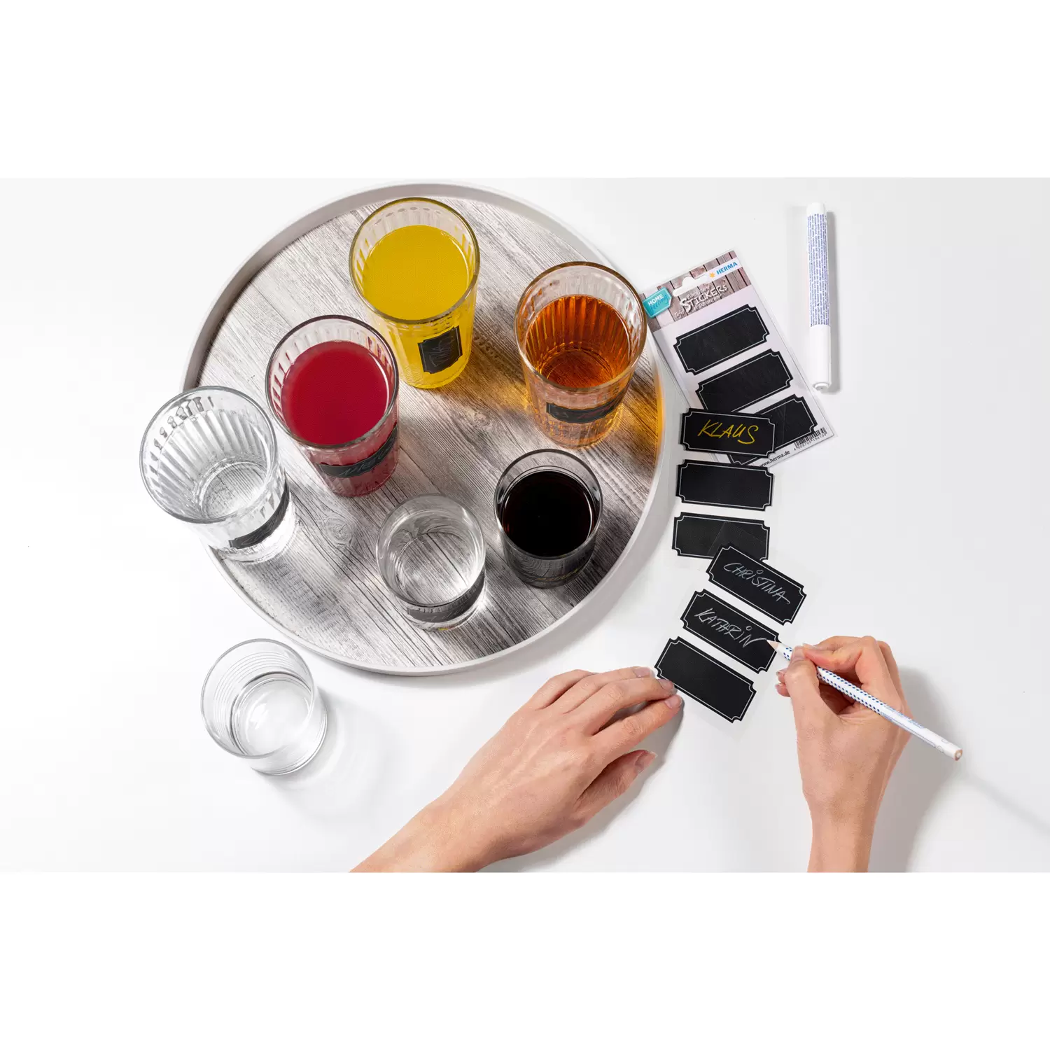 Diese "Tafeletiketten Schilder" von HERMA sind perfekt zum Dekorieren oder Verschenken. Einfach mit Kreide oder einem Kreidestift beschriften, aufkleben und fertig. Mit den schwarzen, stylischen Tafeletiketten lassen sich persönliche Botschaften auf eine ganz besondere Weise vermitteln. Sie verleihen Geschenken eine ganz individuelle Note und sind selbstverständlich nicht nur bei Geschenken eine gute Idee. Auch zu Hause sind sie ein praktischer und besonders angesagter Helfer und können beispielsweise für die Beschriftung von Flaschen oder Vorratsdosen verwendet werden. Alles, was zur Beschriftung der Tafelfolie gebraucht wird, ist herkömmliche Tafelkreide oder ein Kreidestift. Die selbstklebende Tafelfolie kann bei Bedarf einfach feucht abgewischt und neu beschrieben werden. Die Aufkleber haften permanent auf allen glatten Oberflächen wie Glas, Keramik, Kunststoff und Metall In einer Packung sind zwei Bögen à 3 Tafeletiketten im eckigen Design enthalten.