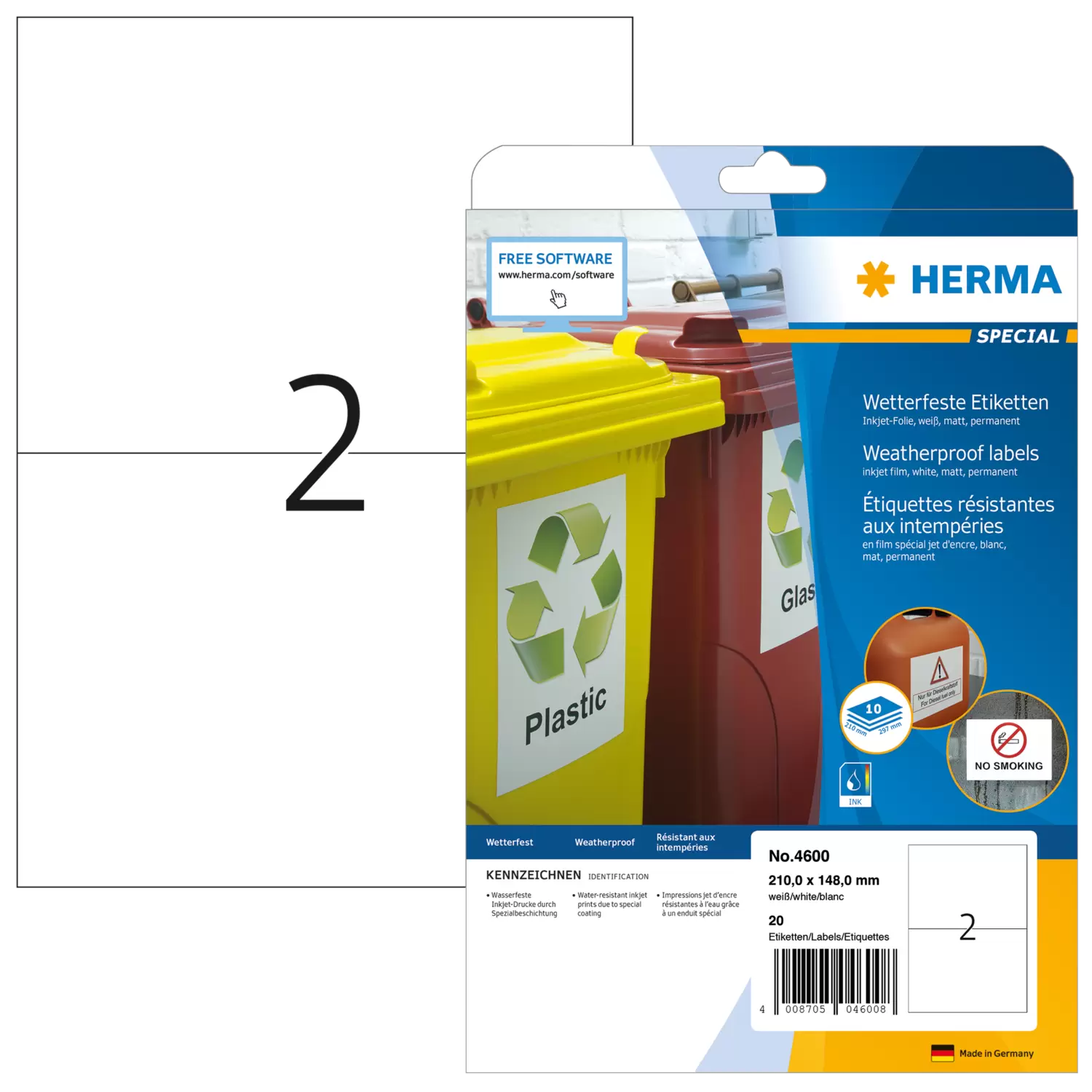 Wetterfeste Inkjet Folien-Etiketten auf A4-Blättern, weiß/matt, selbstklebend. Hervorragende Inkjetdrucke in Schwarz und Farbe. Für den Einsatz im gewerblichen und privaten Bereich, z. B. für die Auszeichnung von Waren im Freigelände, für Informationen am Schaufenster oder Hinweis- und Warnschilder. Garantiert wasserfeste Ausdrucke in Schwarz und Farbe, lichtechte Tinte verwenden. Spezialbeschichtung sorgt für Tintenfixierung direkt nach dem Druck. Mit umlaufendem Rand: vollflächig bedruckbar und ideal auch für Inkjetdrucker mit kritischen Papierführungen. Kostenlose Softwarelösungen: www.herma.de/software.