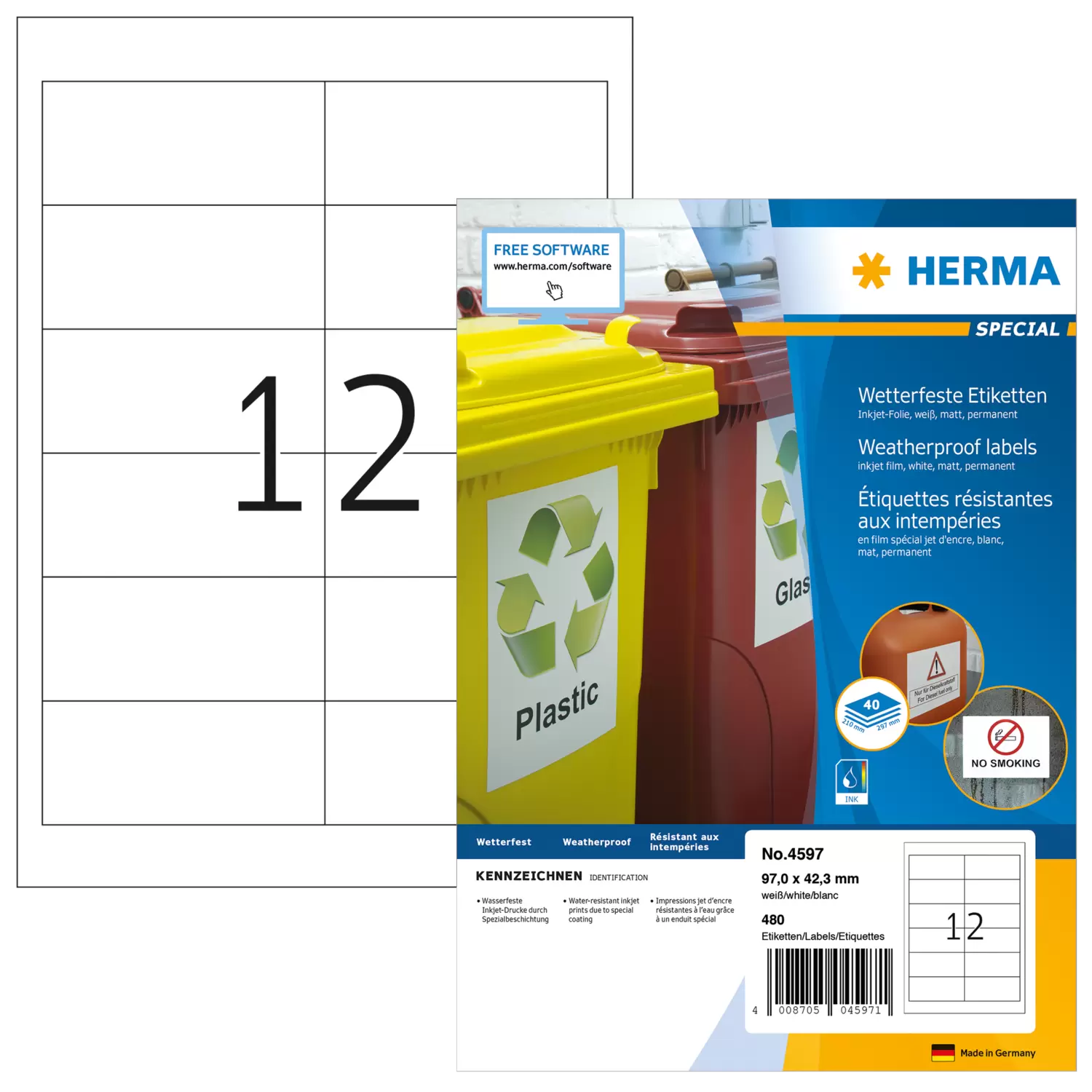 Wetterfeste Inkjet Folien-Etiketten auf A4-Blättern, weiß/matt, selbstklebend. Hervorragende Inkjetdrucke in Schwarz und Farbe. Für den Einsatz im gewerblichen und privaten Bereich, z. B. für die Auszeichnung von Waren im Freigelände, für Informationen am Schaufenster oder Hinweis- und Warnschilder. Garantiert wasserfeste Ausdrucke in Schwarz und Farbe, lichtechte Tinte verwenden. Spezialbeschichtung sorgt für Tintenfixierung direkt nach dem Druck. Mit umlaufendem Rand: vollflächig bedruckbar und ideal auch für Inkjetdrucker mit kritischen Papierführungen. Kostenlose Softwarelösungen: www.herma.de/software.