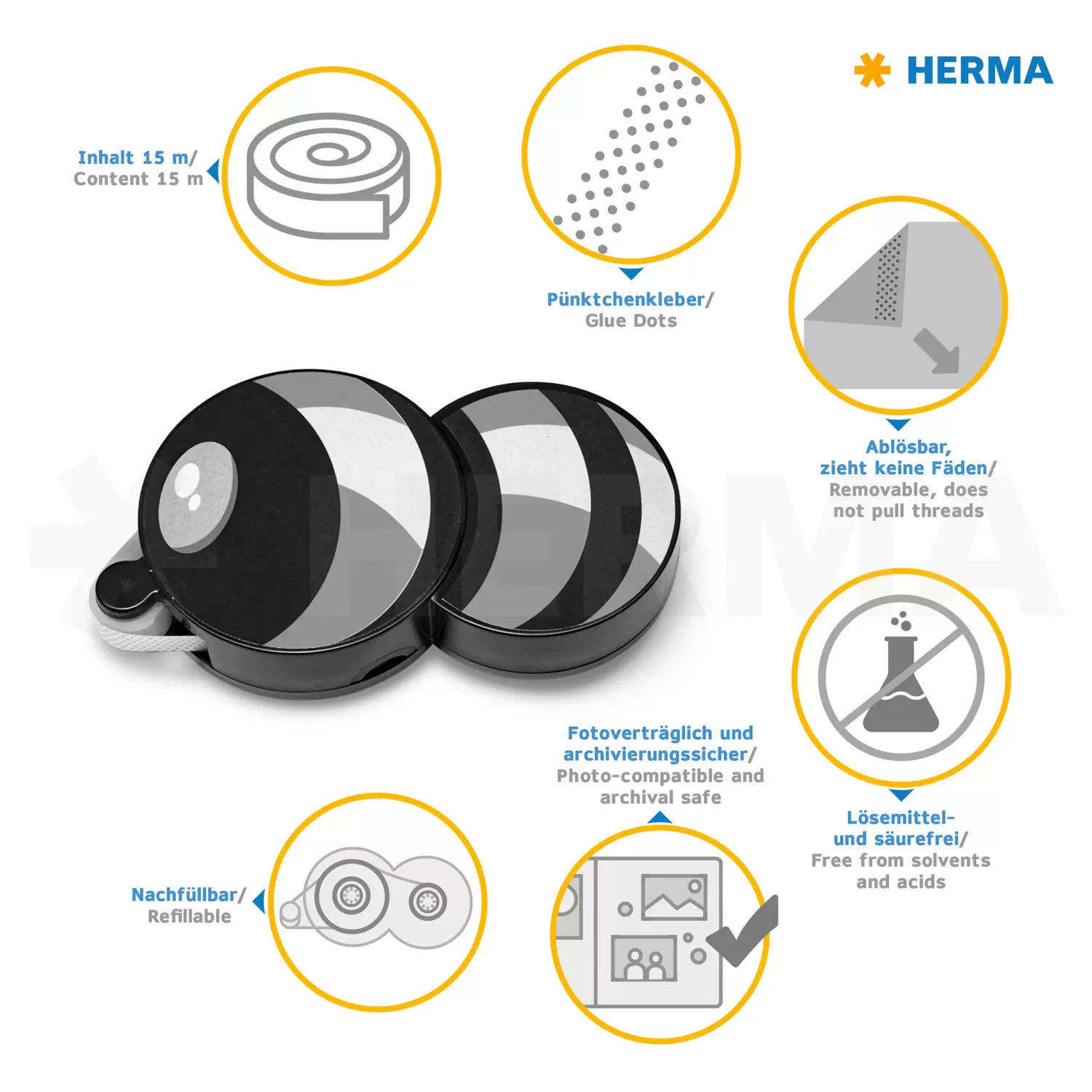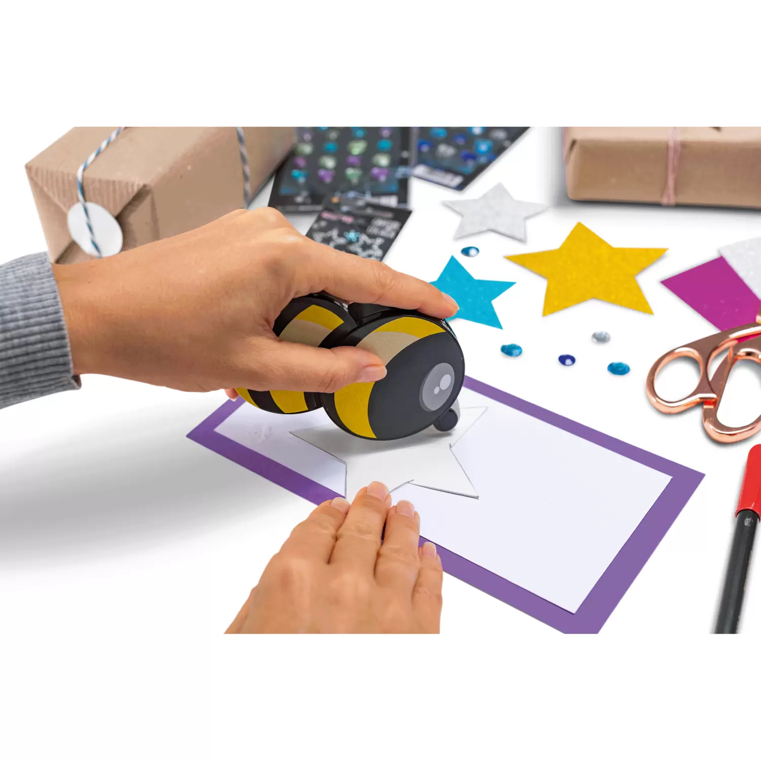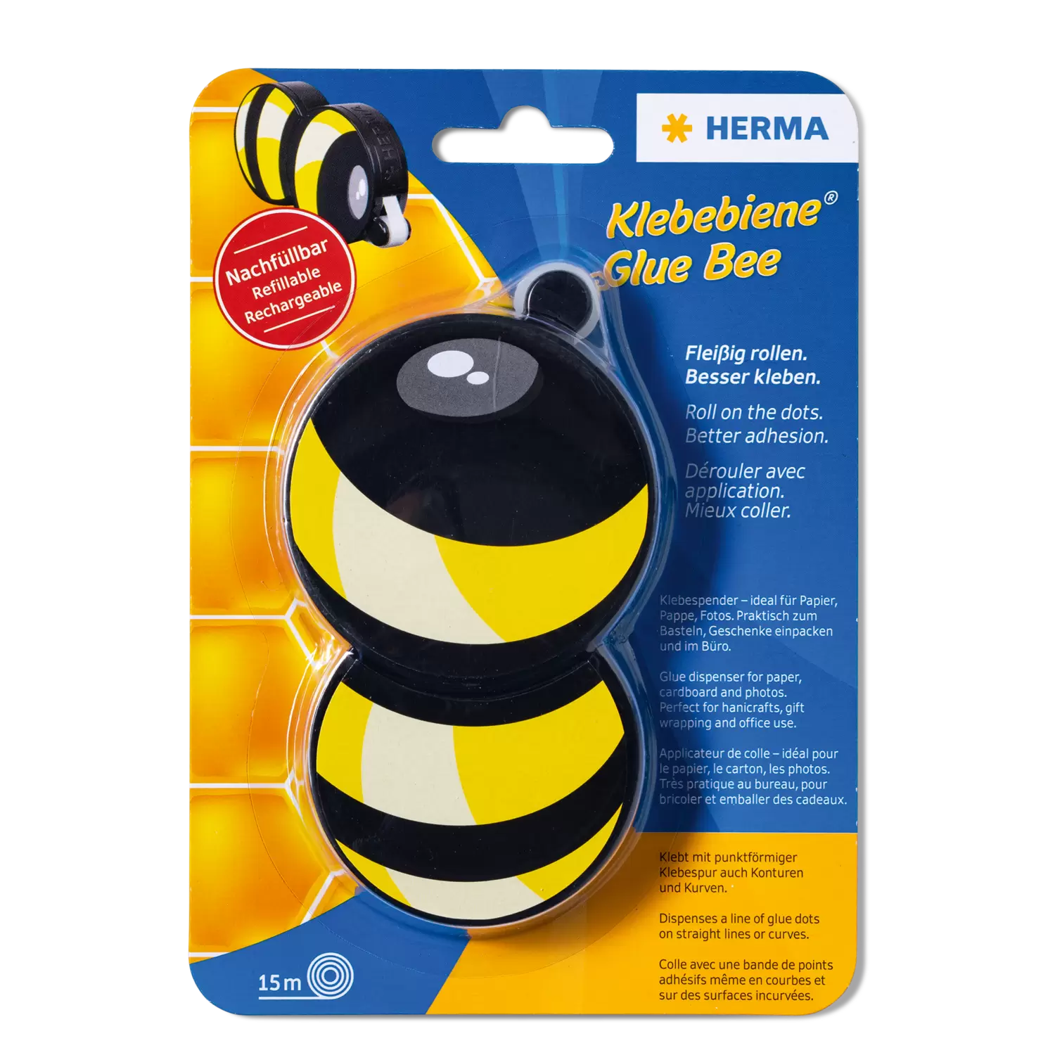 Die HERMA Klebebiene, ablösbar ist die schnelle und einfache kindgerechte Klebelösung für alle kleinen und großen Klebespzialisten. So können auch kleine Kinderhände sauber und präzise auf Papier, Pappe und vielen weiteren Materialien nach Herzenslust Kleben. Die süßen Klebespender im niedlichen Bienen-Design lassen sich mit einer Hand bedienen und sind dank der praktischen Nachfüllrolle stets einsatzbereit, auch für Linkshänder. Verklebt? Kein Problem – der Klebestreifen härtet nicht aus und lässt so das Repositionieren zu. Die Reste des Klebestreifens lassen sich leicht mit den Fingern abrubbeln. Der transparente 9 mm breite Klebestreifen ist lösemittel- und säurefrei, dabei fotoverträglich und archivierungsbeständig. Durch das Abrollen werden kleine Klebepunkte aufgetragen, somit ist sicherer Halt garantiert.