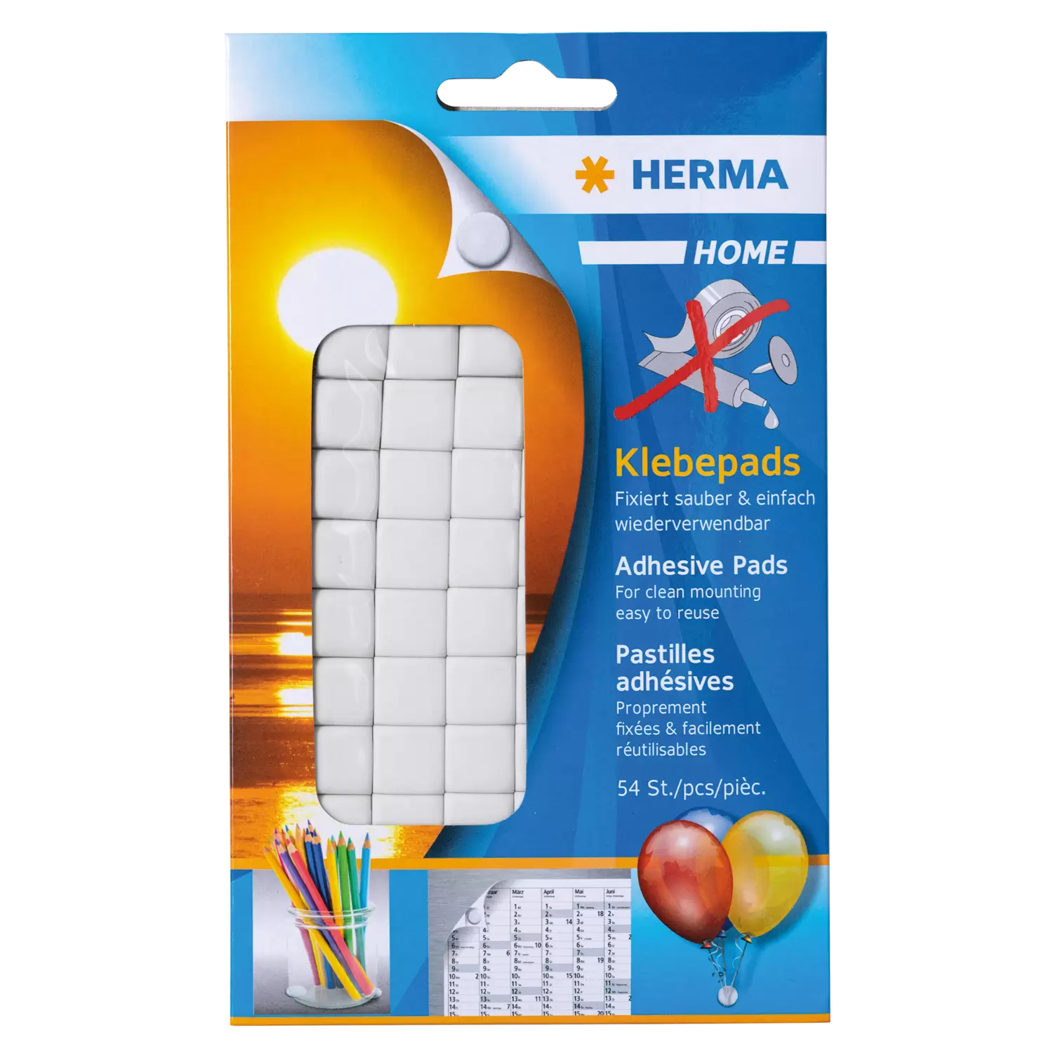 Kleben, fixieren, dekorieren: Die HERMA Klebepads aus flexiblem Haftgummi sind die kleinen Alleskönner in Sachen Befestigung. Ideal für alle glatten nicht strukturierten Oberflächen geeignet. Einfach ein oder mehrere Pads aus der Packung nehmen, kurz kneten bis die Masse weich ist, andrücken und ohne weitere Wartezeit Postkarten, Fotos, Dekorationen und Vieles mehr durch Andrücken fixieren. Der Haftgummi trocknet nicht aus und lässt sich mehrmals wieder verwenden. Erneut kneten, dann ist die Masse sofort wieder einsetzbar. Die Klebepads sind eine tolle Alternative zu Reißnägeln oder Klebeband, einfach in der Handhabung, dabei praktisch und vielfältig. Nach Gebrauch lassen sie sich rückstandsfrei wieder entfernen, auch an den befestigten und aufgehängten Gegenständen. Wichtig ist, dass alle Teile, trocken, sauber und frei von Fetten und Ölen sind. In einer Verpackung sind 54 Klebepads auf Trägerpapier enthalten.