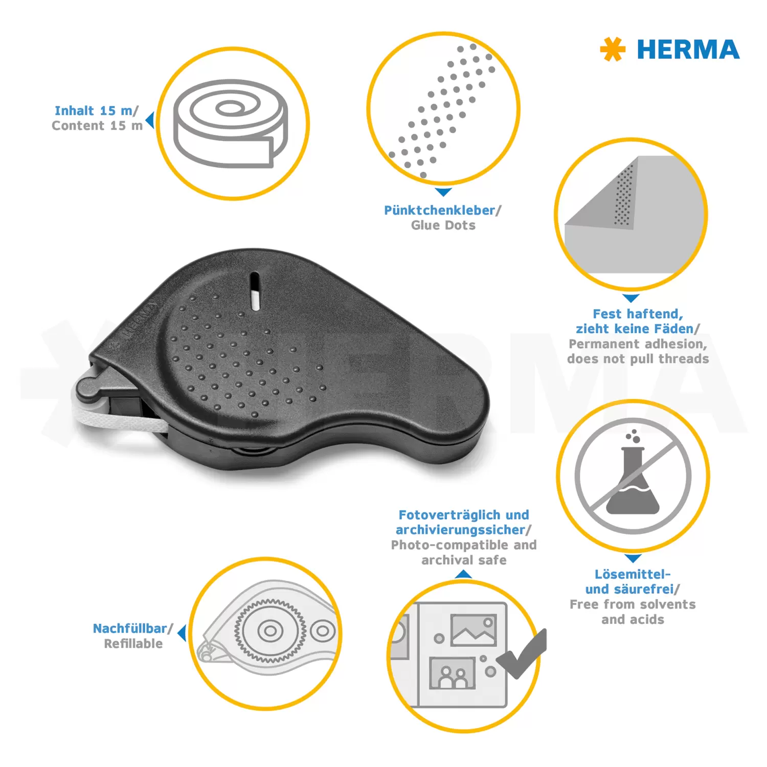 • Inklusive nachfüllbarer 15-Meter Kleberolle