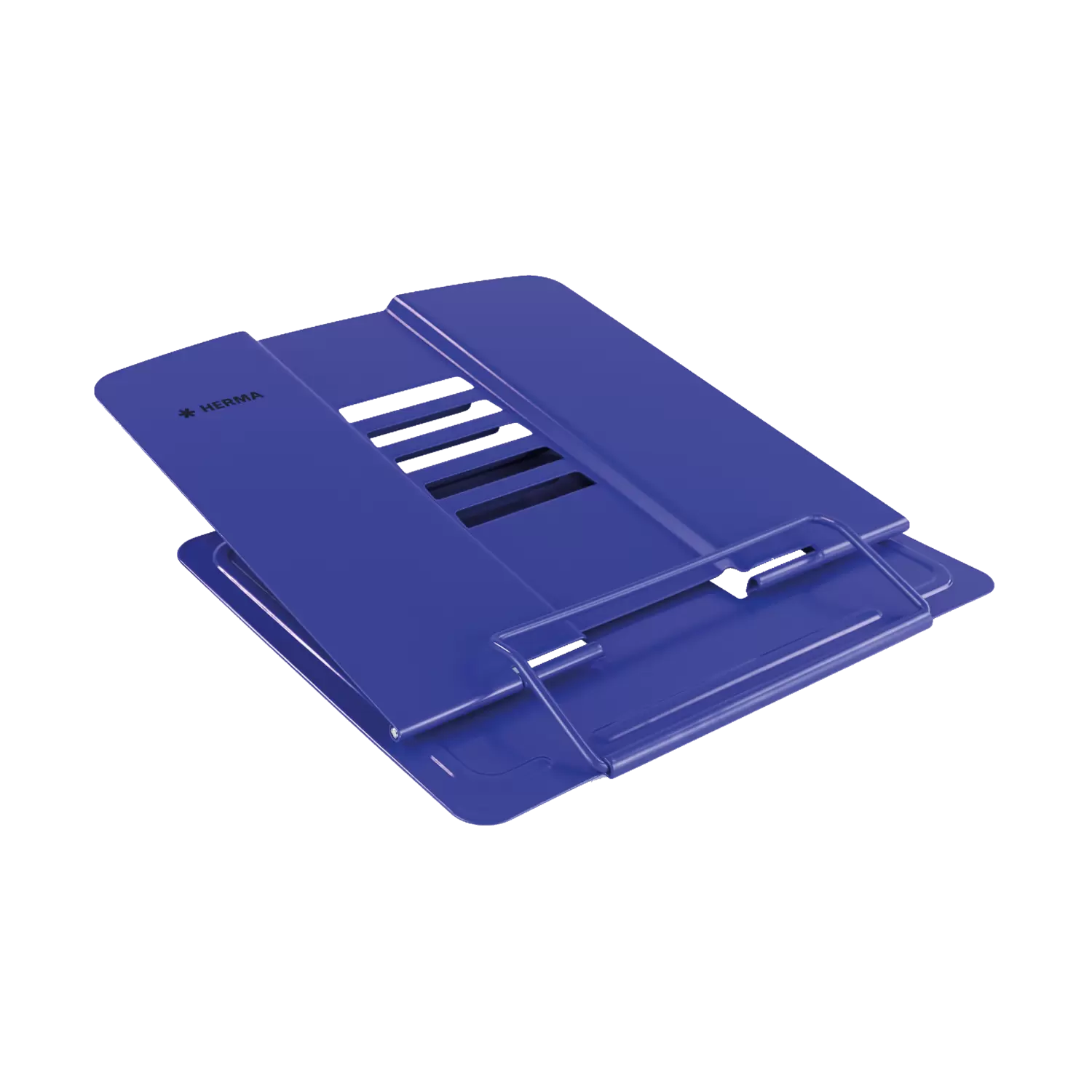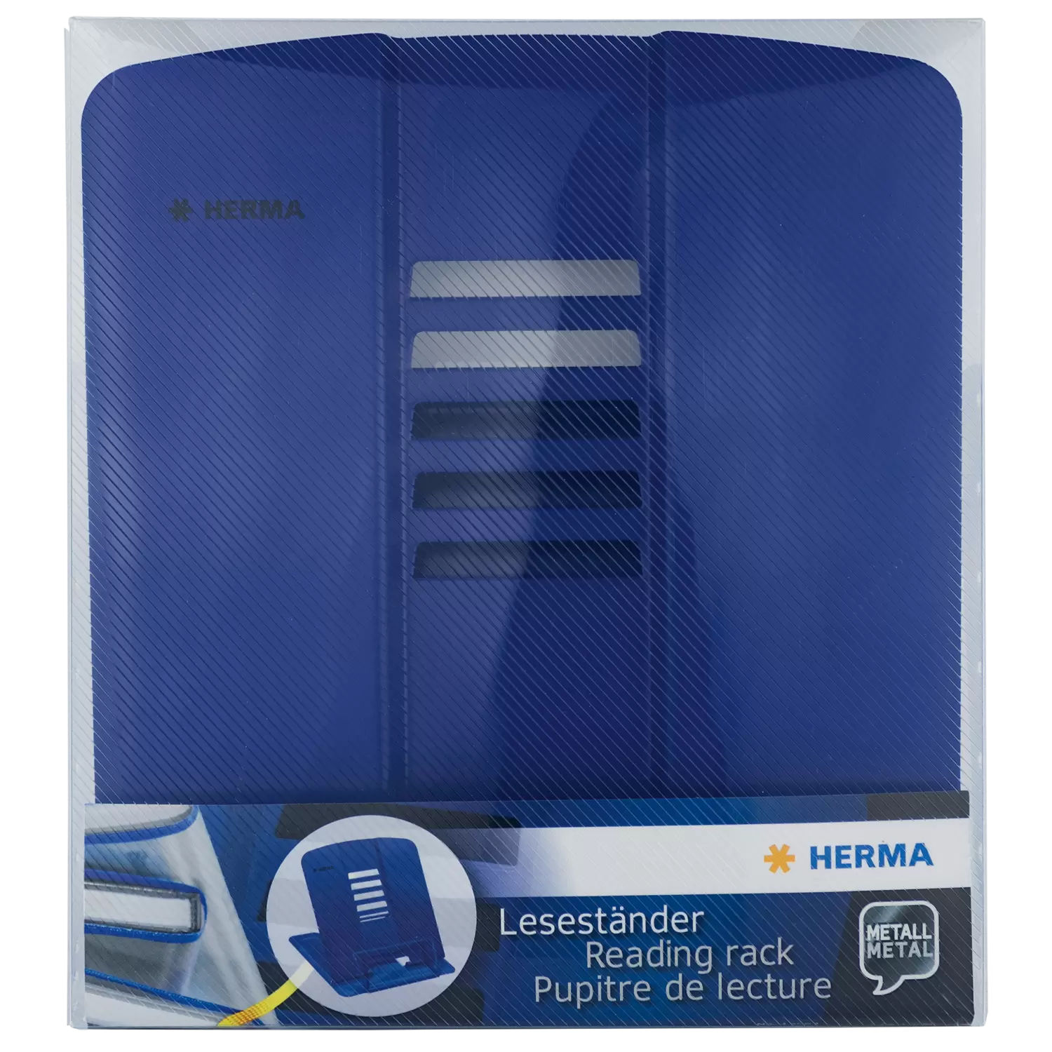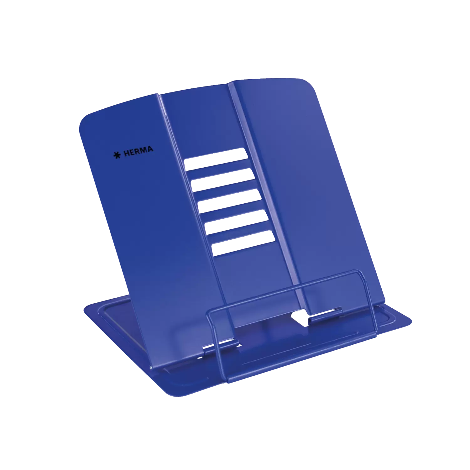 Leseständer, Buchstütze, Buch- und Kochbuchhalter, Tablet-Stütze: Es gibt viele Bezeichnungen für den einzigartigen und multifunktionalen Bücherständer von HERMA. Der Leseständer ist blau, aus lackiertem Metall und hat aufgeklappt eine Höhe von 19 cm, eine Breite von 19,8 cm und eine Tiefe von 15,7 cm. Daher ist er auch für schwere Bücher, Atlanten und Tablets bestens geeignet. Sein Neigungswinkel kann man in 5 verschiedene Positionen einstellen, so dass es zum Schauen auf dem Schreibtisch, auf dem Campus oder in der Küche, für den Nacken bequem ist. Für den festen und optimalen Stand ist er an der Unterseite mit Anti-Rutsch-Noppen versehen. Wird er mal nicht gebraucht oder muss er transportiert werden, dann kann man ihn ganz einfach zusammenklappen und verstauen. Den multifunktionalen Bücherständer gibt es in den Farben weiß, blau, pink, schwarz und rot. Perfekt um beispielsweise Bücher, Tablets, Magazine, Hefte, Noten und Kochbücher, in unterschiedlichen Größen, den perfekten Stand und Halt zu bieten. Flexibel einsetzbar im Büro oder HomeOffice, auf Reisen, in der Schule, auf dem Campus, im Kindergarten, in der Küche oder beim Outdoor Grillen und zu Hause auf dem Sofa.