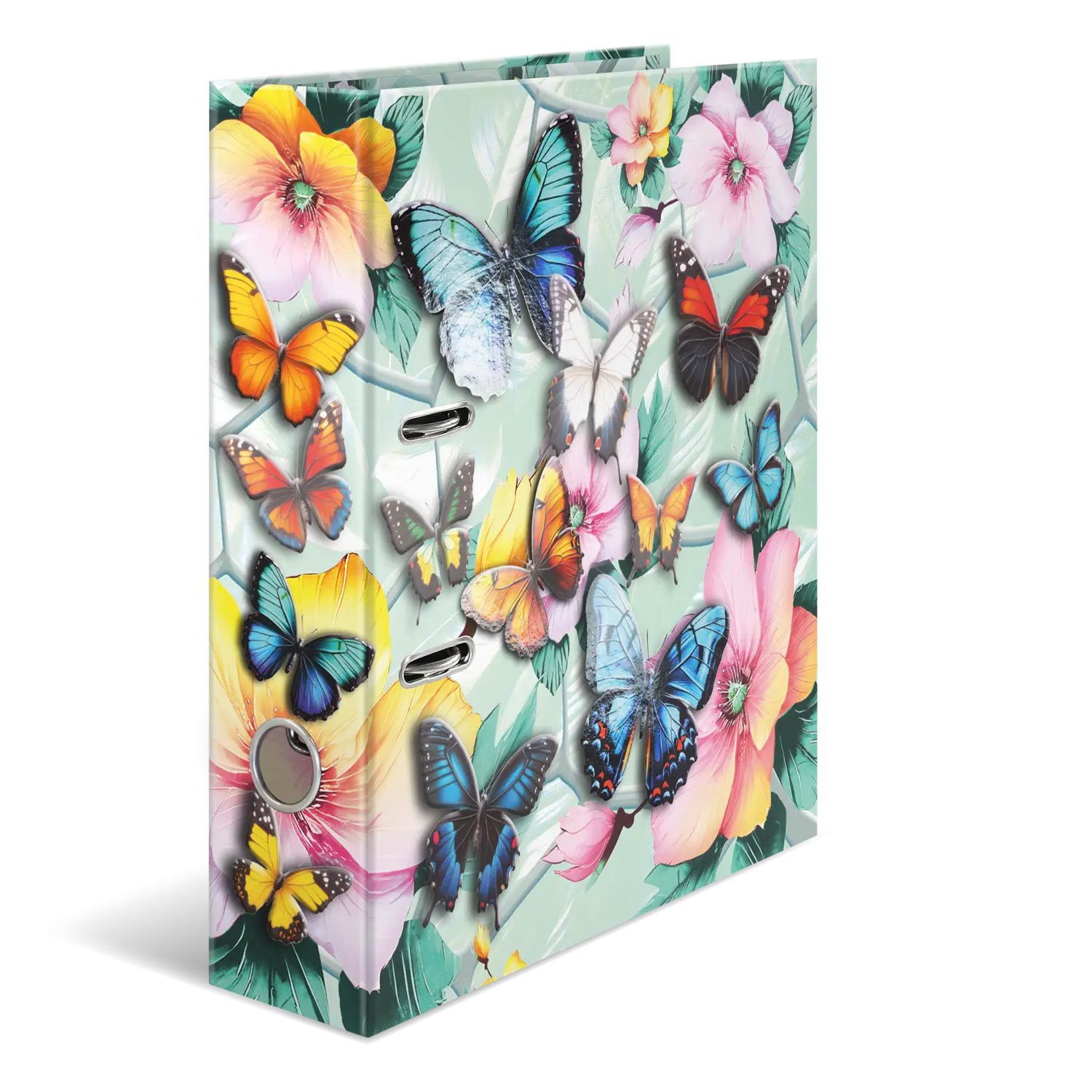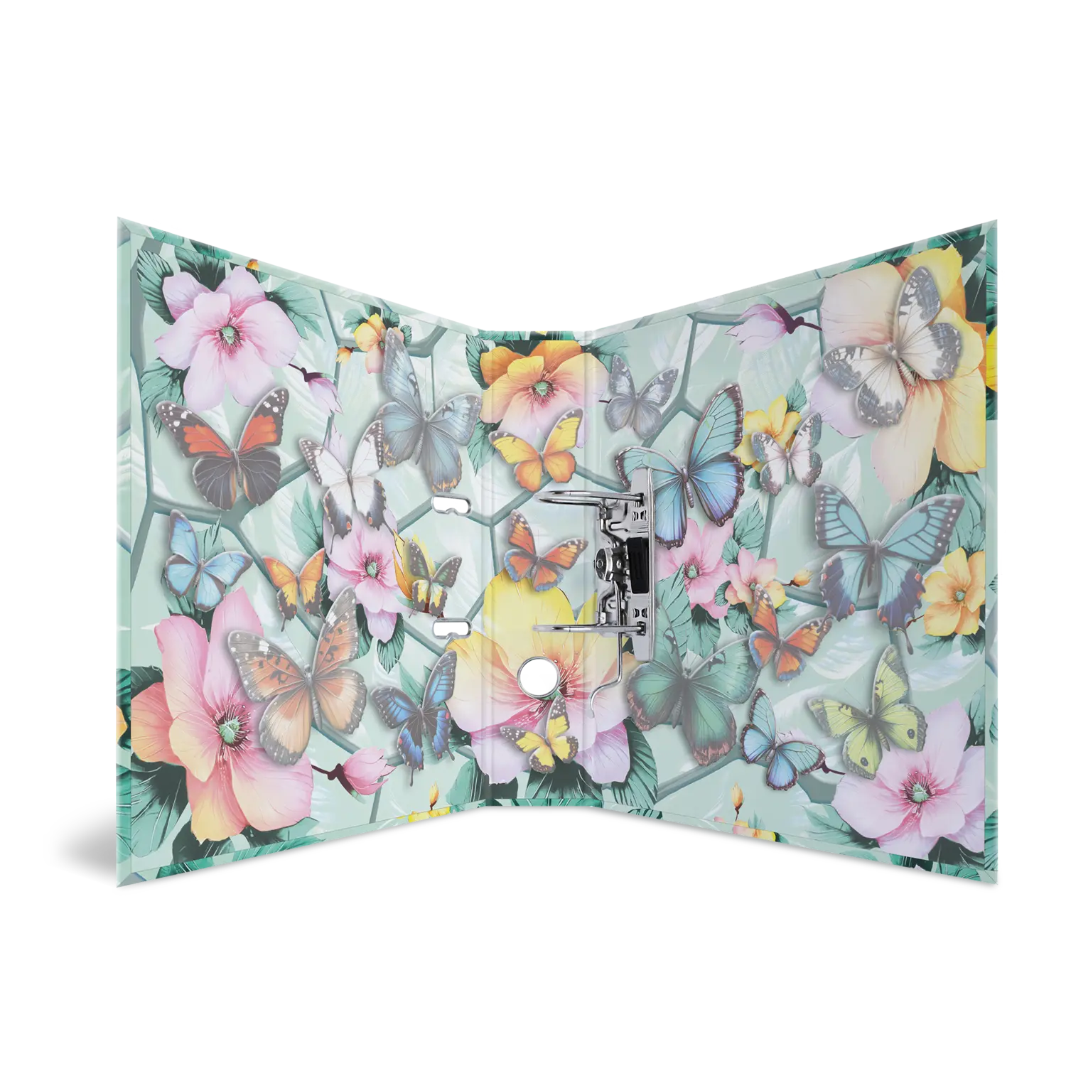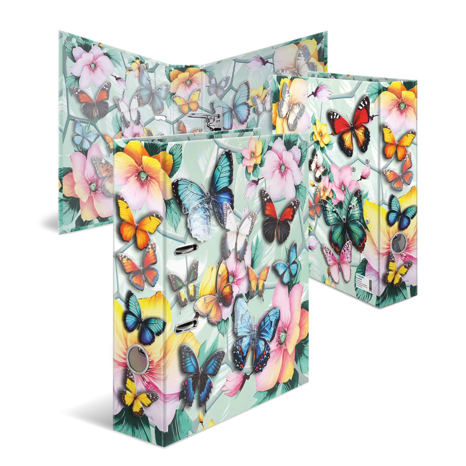 Willkommen im Traumgarten: Zarte Blüten kombiniert mit eleganten Schmetterlingen in wunderschönen Pastellfarben. Dieser Motiv-Ordner ist mit viel Liebe und Feingefühl für's Detail ein absoluter Hingucker. Die filigranen Schmetterlinge auf der Außenseite des Ordners erwachen dank der leuchtenden Farben und der glänzenden Folienveredelung beinahe zum Leben. Von leuchtendem Blau über sonniges Gelb bis hin zu zartem Rosa. hier schlägt das Herz jedes Naturliebhabers höher. Der Ordner aus stabilem Karton ist hochwertig verarbeitet, mit Innendruck und stabiler Hebelmechanik. Er garantiert eine optimale Aufbewahrung von Dokumenten und Klarsichtfolien für optimale Ordnung zu Hause, in der Schule, Uni oder im Büro. Ein echter Hingucker im Regal und auf dem Schreibtisch.