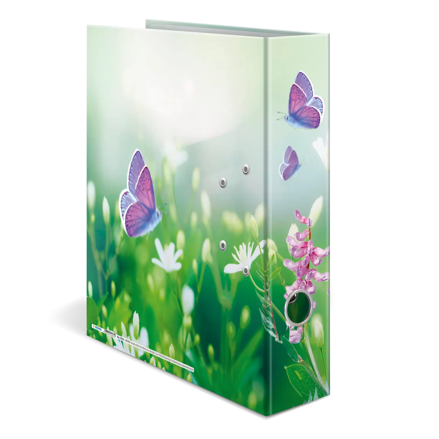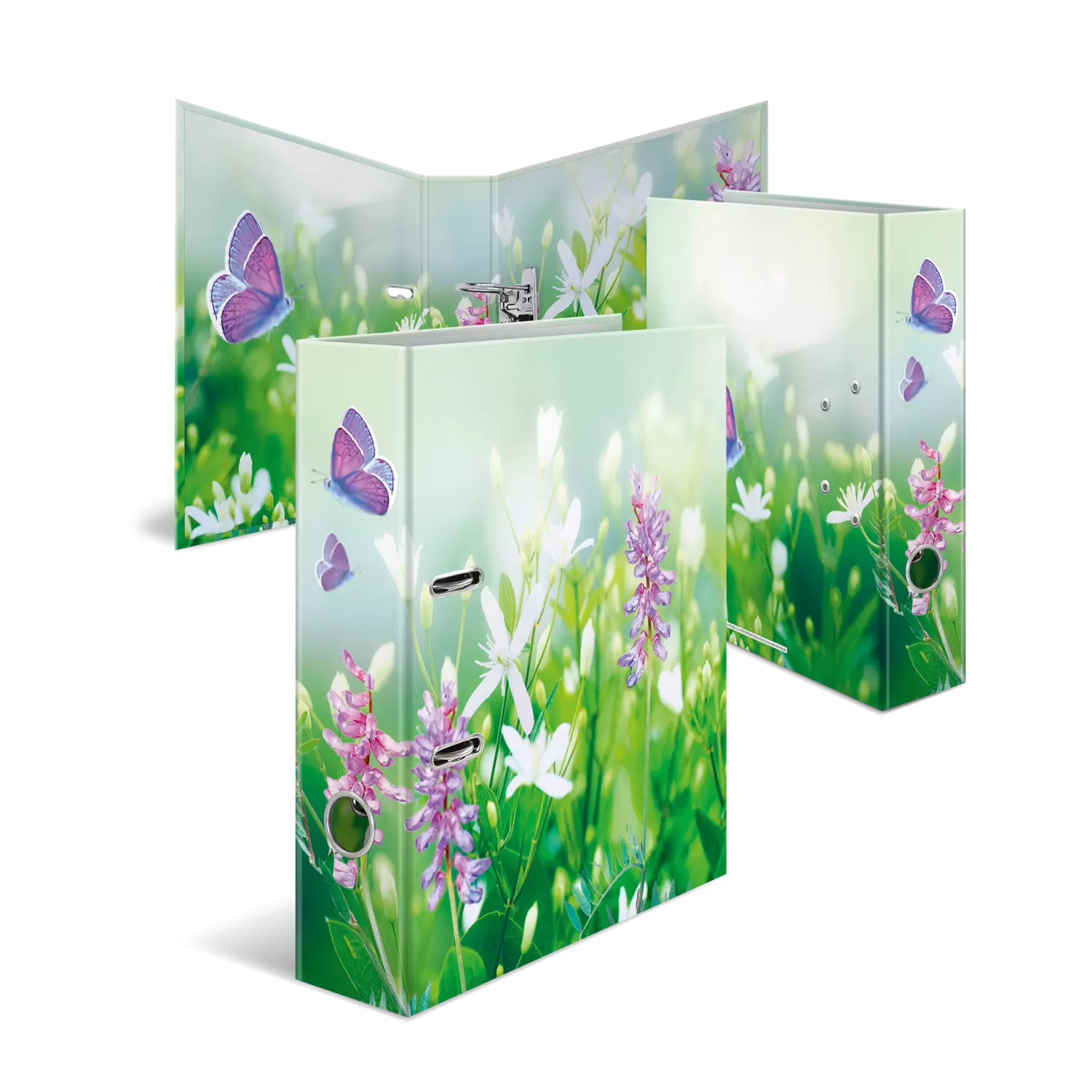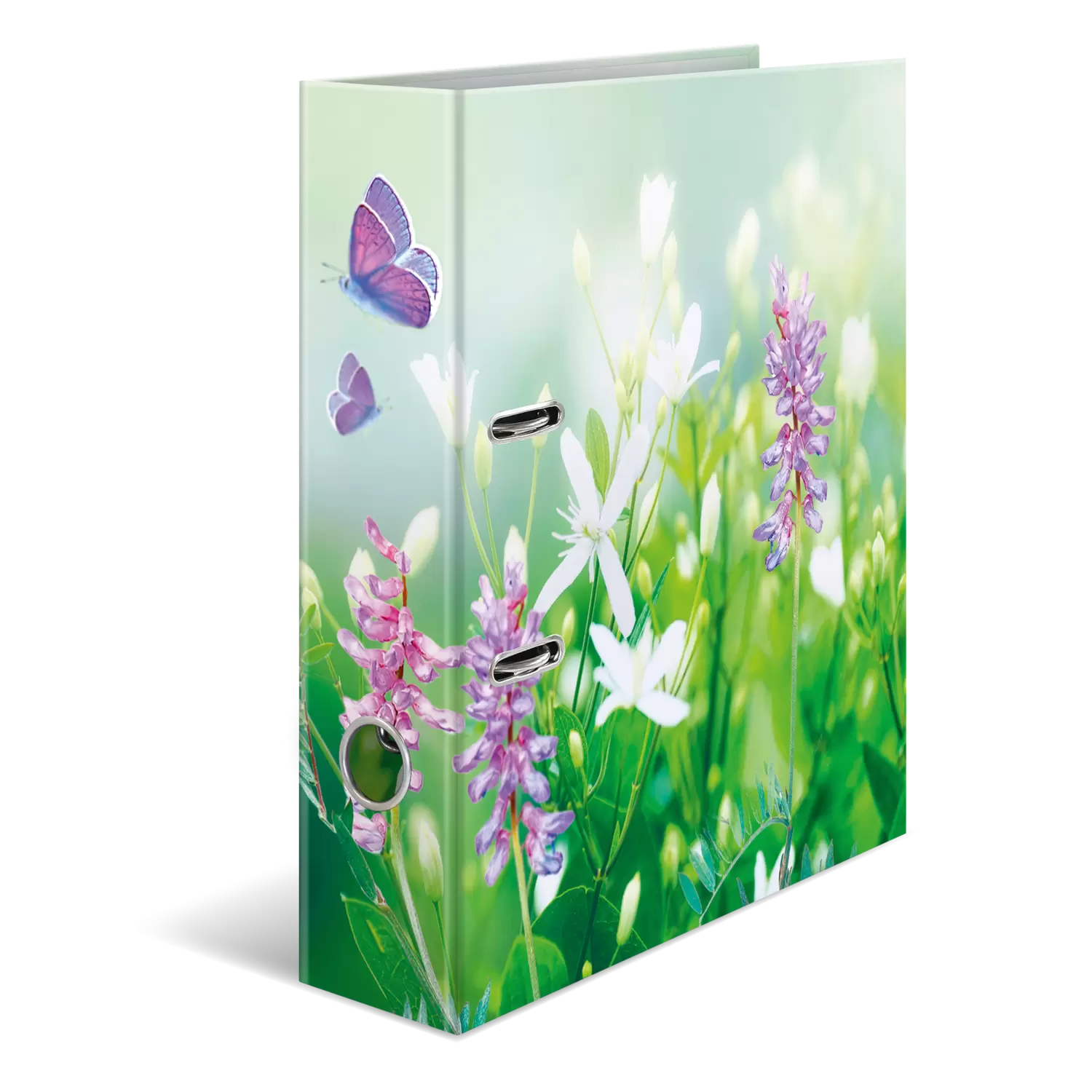 Mit dem HERMA Motiv-Ordner im Design Wild Flowers aus der Serie Flowers holen sie sich die Schönheit der Blumenwelt nach Hause, in das Büro oder in die Schule. Blumen sind nicht umsonst die Königinnen der Flora: sie haben schon immer fasziniert. Es umgibt sie dieser Hauch von Grazie und Anmut, den nur die floralen Schönheiten an sich haben. Jede Art hat ihre Farben, ihren Duft, ihre Aura, zart oder kräftig, dezent oder prachtvoll, immer besonders und einzigartig: Ein Geschenk an bunter Vielfalt, eine Freude für die Sinne. Eine farbenfrohe Sommerwiese, ein Genuss für Augen und Seele. Die spezielle Hebelmechanik mit Niederhalter aus Metall sorgt dafür, den Ordnerinhalt ordentlich und stabil beisammen zu halten. Der breite Rücken garantiert Stabilität im Regal und ausreichend Platz für viele Unterlagen im Format bis DIN A4.