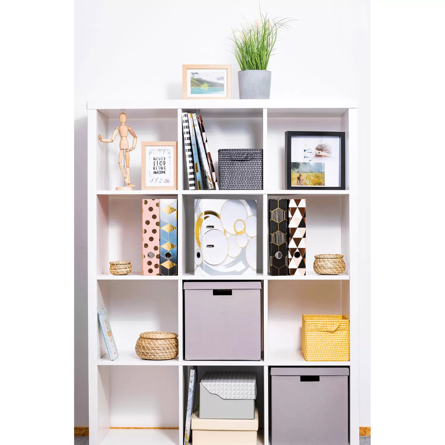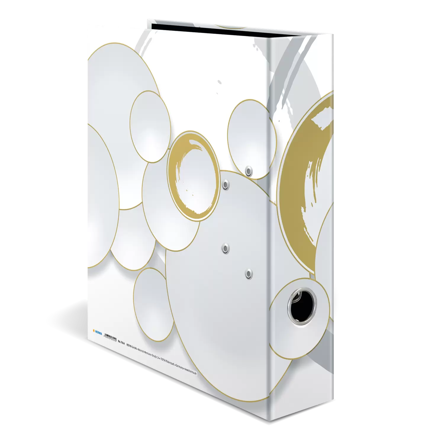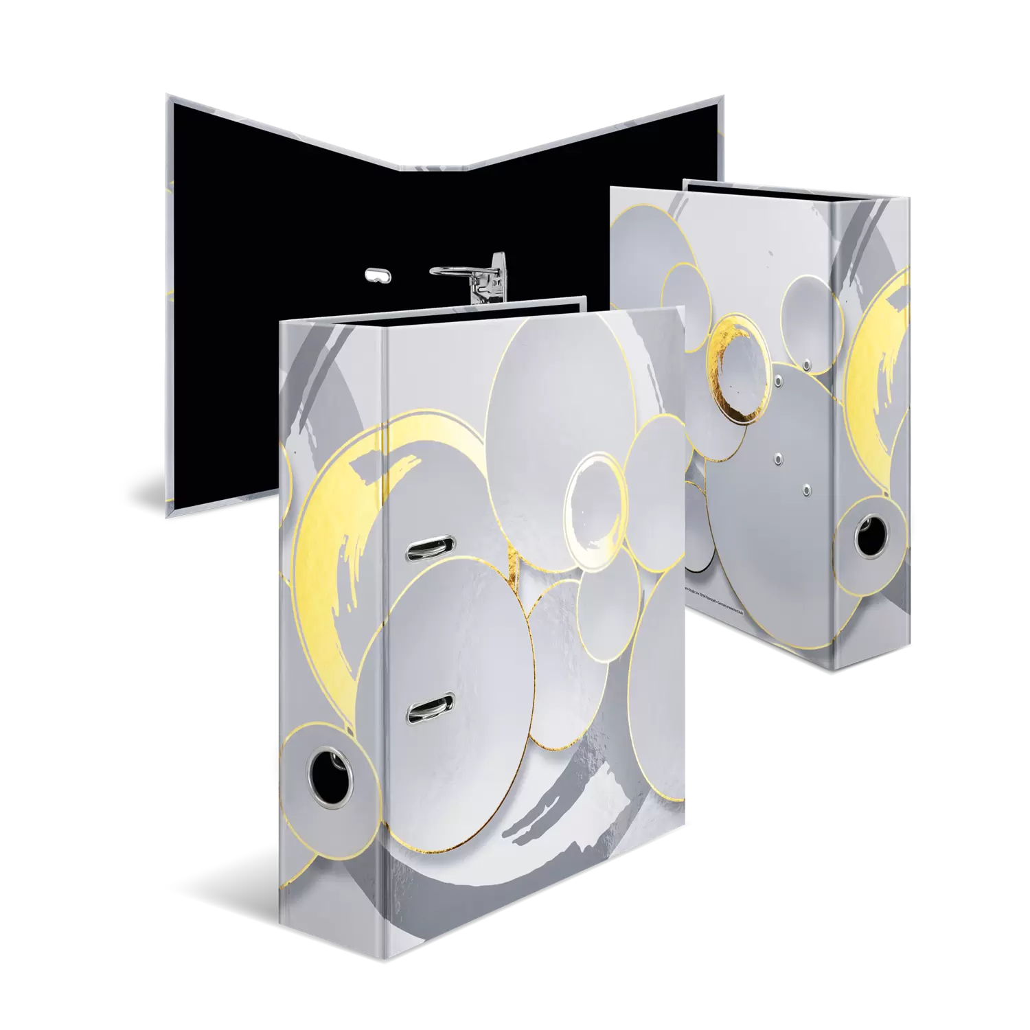 Der Motiv-Ordner Circles ist etwas ganz Besonderes, denn er vereint Design und Funktonalität auf höchstem Niveau. Das Design ist in zarten Weiß- und Grautönen gehalten, feine Kreise umschlingen sich in glänzendem Gold, umspielt von organisch-runden Formen. Ein Highlight und Hingucker! Der Ordner ist aus hochwertigem Karton hergestellt, mit Goldfolie veredelt und durch das praktische Griffloch ganz einfach hervorzuholen und wieder zurückzustellen. Die spezielle Hebelmechanik mit Niederhalter aus Metall sorgt dafür, den Ordnerinhalt ordentlich und stabil beisammen zu halten. Der breite Rücken garantiert Stabilität im Regal und ausreichend Platz für viele Unterlagen im Format bis DIN A4.