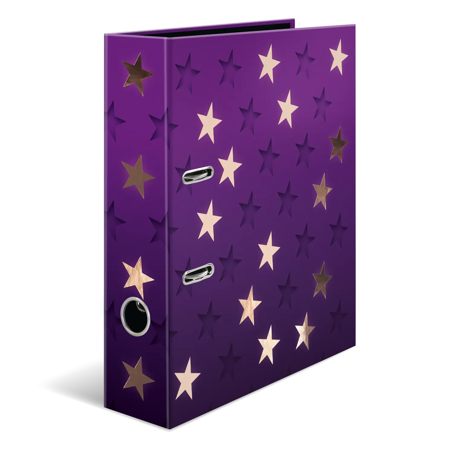 Der Motiv Ordner Stars ist etwas ganz Besonderes, denn er vereint Design und Funktonalität auf höchstem Niveau. Das tief dunkelviolette Design bringt in Kombination mit der glänzend schimmernden Roségold Foli enveredelungen die Sterne des Motivs wie am Nachthimmel zum Strahlen. Der stylische Tiefeneffekt versetzt dem Ordner außerdem einen zusätzlichen Hingucker und sorgt dafür, dass die Sterne beinahe wie gestanzt aussehen. Ein Highlight und Hingucker! Der Ordner ist aus hochwertigem Karton hergestellt, mit Roségoldfolie veredelt und durch das praktische Griffloch ganz einfach hervorzuholen und wieder zurückzustellen. Die spezielle Hebelmechanik mit Niederhalter aus Metall sorgt dafür, den Ordnerinhalt ordentlich und stabil beisammen zu halten. Der breite Rücken garantiert Stabilität im Regal und ausreichend Platz für viele Unterlagen im Format bis DIN A4.