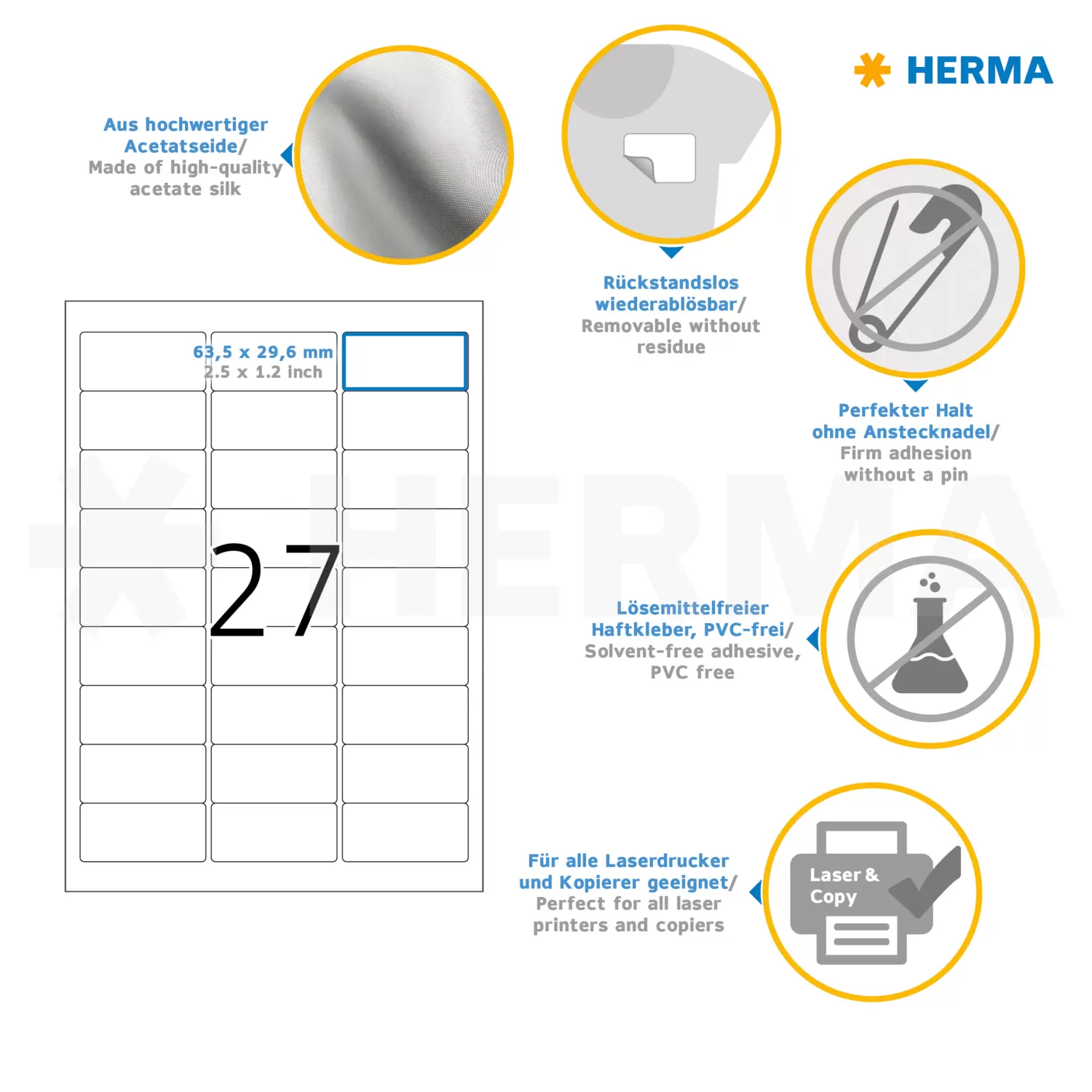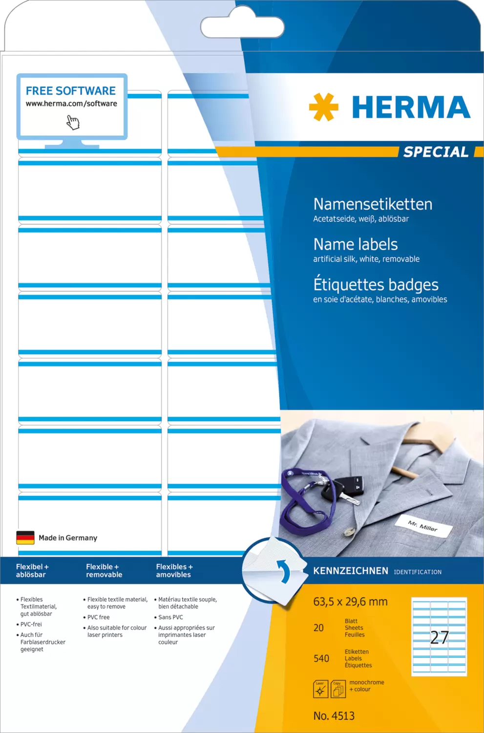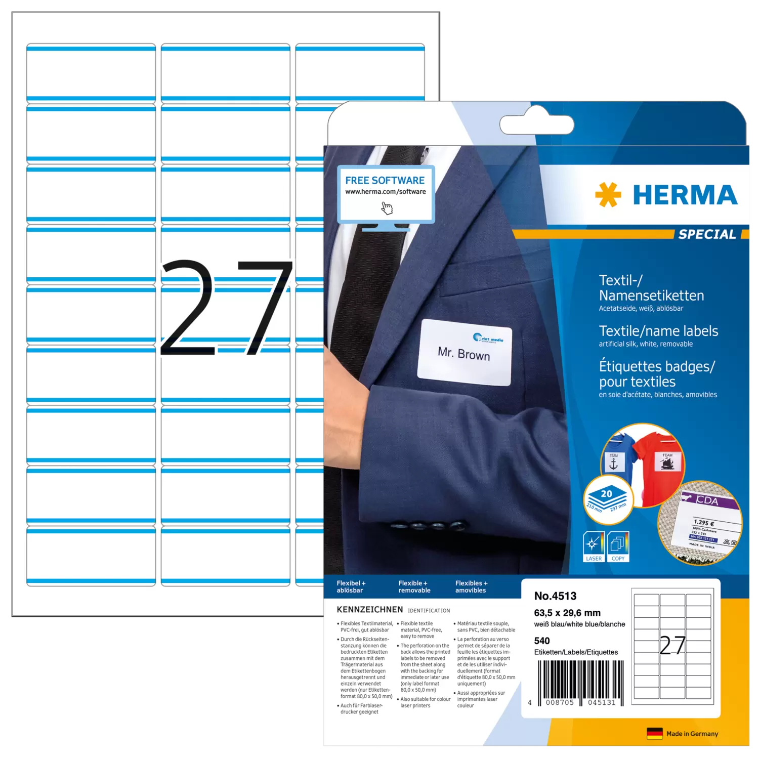 Textiletiketten lassen sich ganz einfach und professionell mit unserer kostenlosen Online-Software, dem Etiketten Assistent Online, gestalten und bedrucken.https://www.herma.de/buero-zuhause/vorlagen-software/etiketten-assistent-online/ Zur Verfügung stehen Ihnen außerdem unsere Word-Vorlagen. www.herma.de/buero-zuhause/vorlagen-software/vorlagen-fuer-word/ Die Handbeschriftung mit einem geeigneten Filzstift ist ebenso möglich.