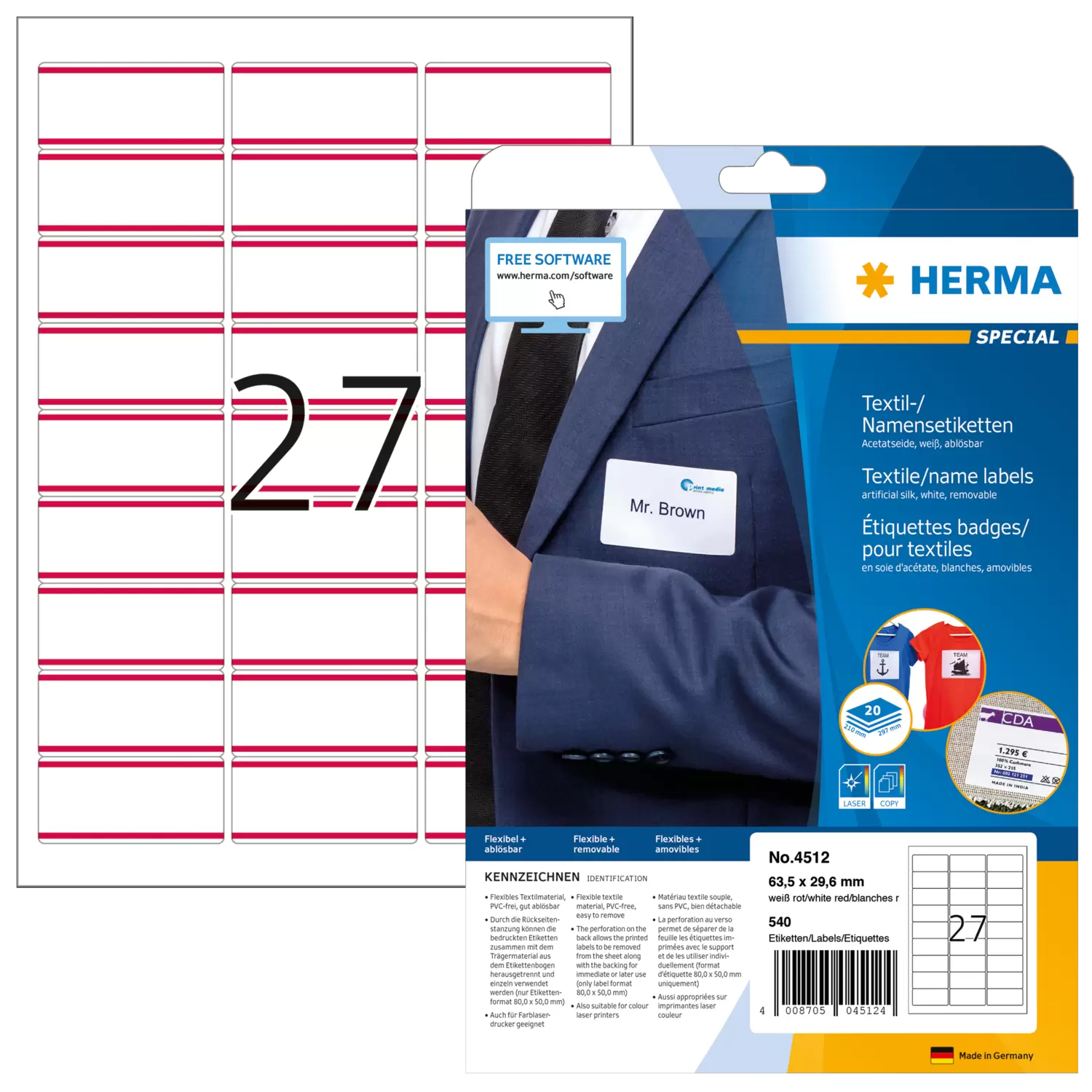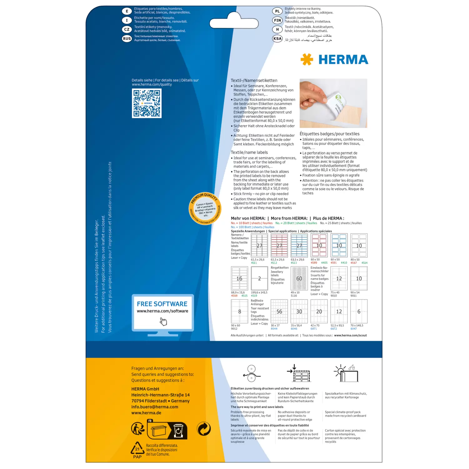 Textiletiketten lassen sich ganz einfach und professionell mit unserer kostenlosen Online-Software, dem Etiketten Assistent Online, gestalten und bedrucken.https://www.herma.de/buero-zuhause/vorlagen-software/etiketten-assistent-online/ Zur Verfügung stehen Ihnen außerdem unsere Word-Vorlagen. www.herma.de/buero-zuhause/vorlagen-software/vorlagen-fuer-word/ Die Handbeschriftung mit einem geeigneten Filzstift ist ebenso möglich.