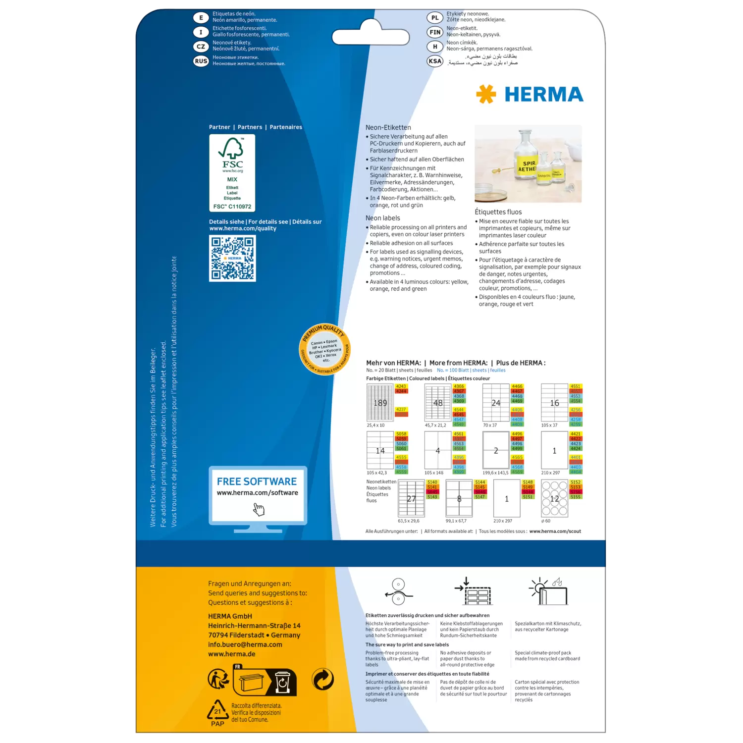 Etiketten in Neonfarben für Informationen mit Signalwirkung, auf A4-Blättern, selbstklebend. Auffallend und informativ: ideal für Kennzeichnungen mit Signalcharakter, z. B. Warnhinweise, Eilvermerke, Aktionen, Farbcodierungen,... In 4 signalstarken Neonfarben, FSC® Mix Credit-zertifiziert. Für Laser- und Inkjetdrucker, Kopierer, Farblaserdrucker und Farbkopierer geeignet. Störungsfreie Verarbeitung durch Rundum-Sicherheitskante und optimale Planlage. Kostenlose Softwarelösungen: www.herma.de/software.