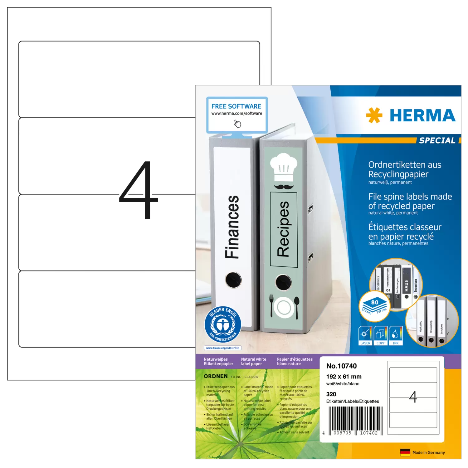 Selbstklebende Etiketten aus naturweißem Recyclingpapier, auf A4-Blättern. Ausgezeichnet mit dem Blauen Engel. Ideal zum Adressieren und Kennzeichnen. Etikettenpapier aus 100 % Recyclingpapier. Hoher Weißegrad (ISO 97/CIE 133), ohne Chlorbleiche. Wasserbasierender lösemittelfreier Haftkleber. Etikettenpapier ist zu 100 % recyclingfähig mit dem Altpapier. Verpackung aus Recyclingkarton. Störungsfreie Verarbeitung durch Rundum-Sicherheitskante und optimale Planlage. Sehr gute Druckergebnisse auf allen Laser- und Inkjetdruckern, Kopierern, Farblaserdruckern und Farbkopierern. Kostenlose Softwarelösungen: www.herma.de/buero-zuhause/vorlagen-software/.
