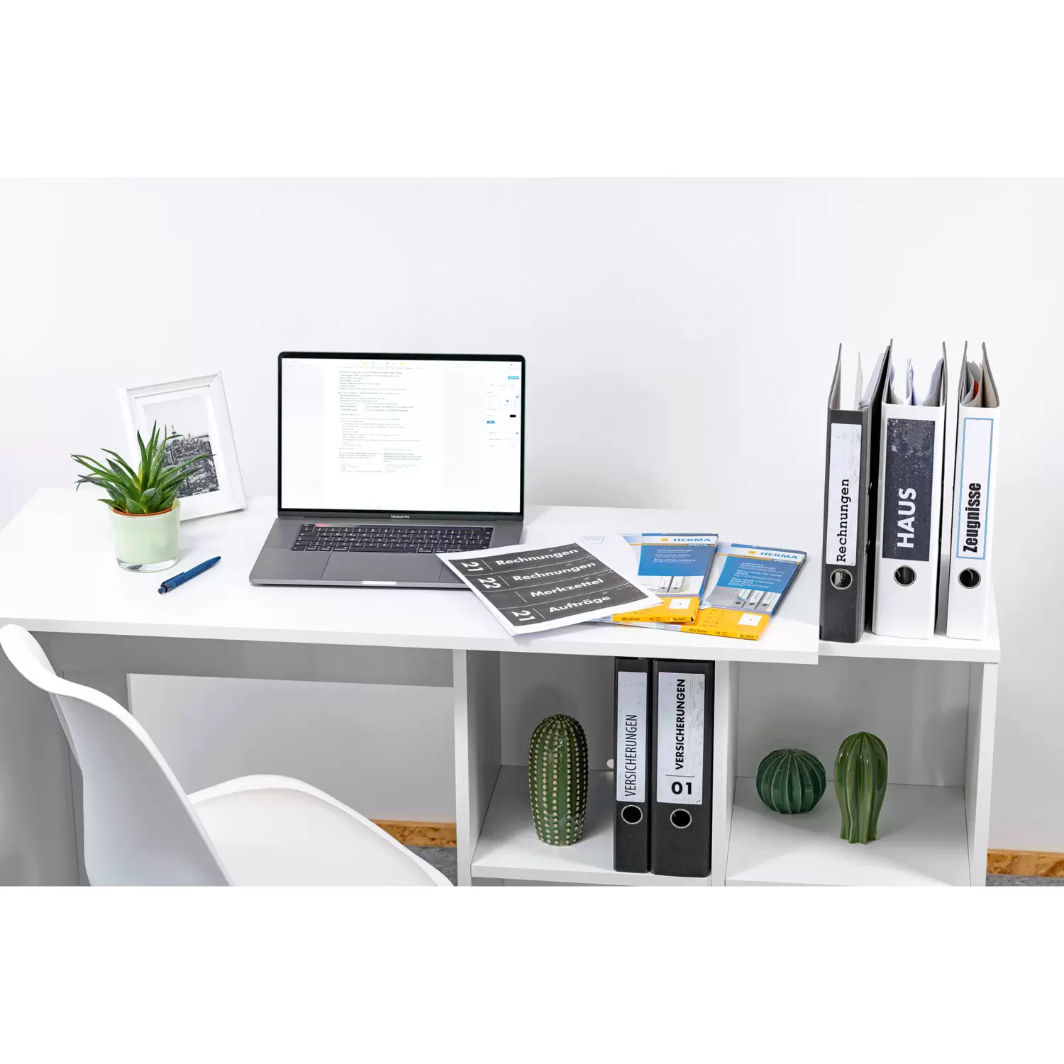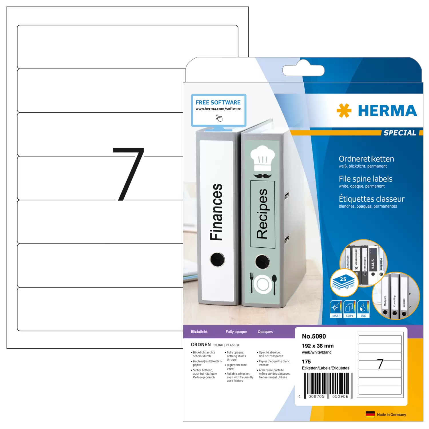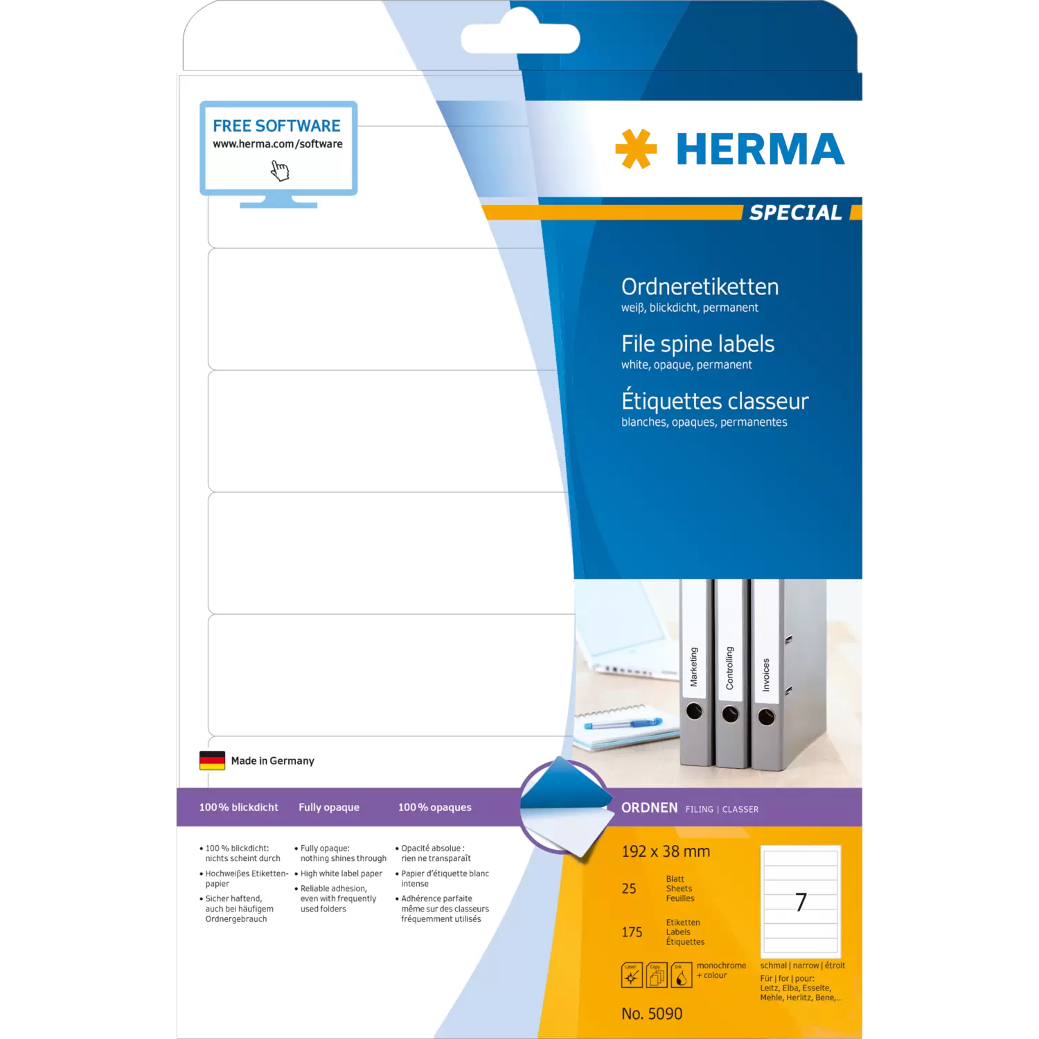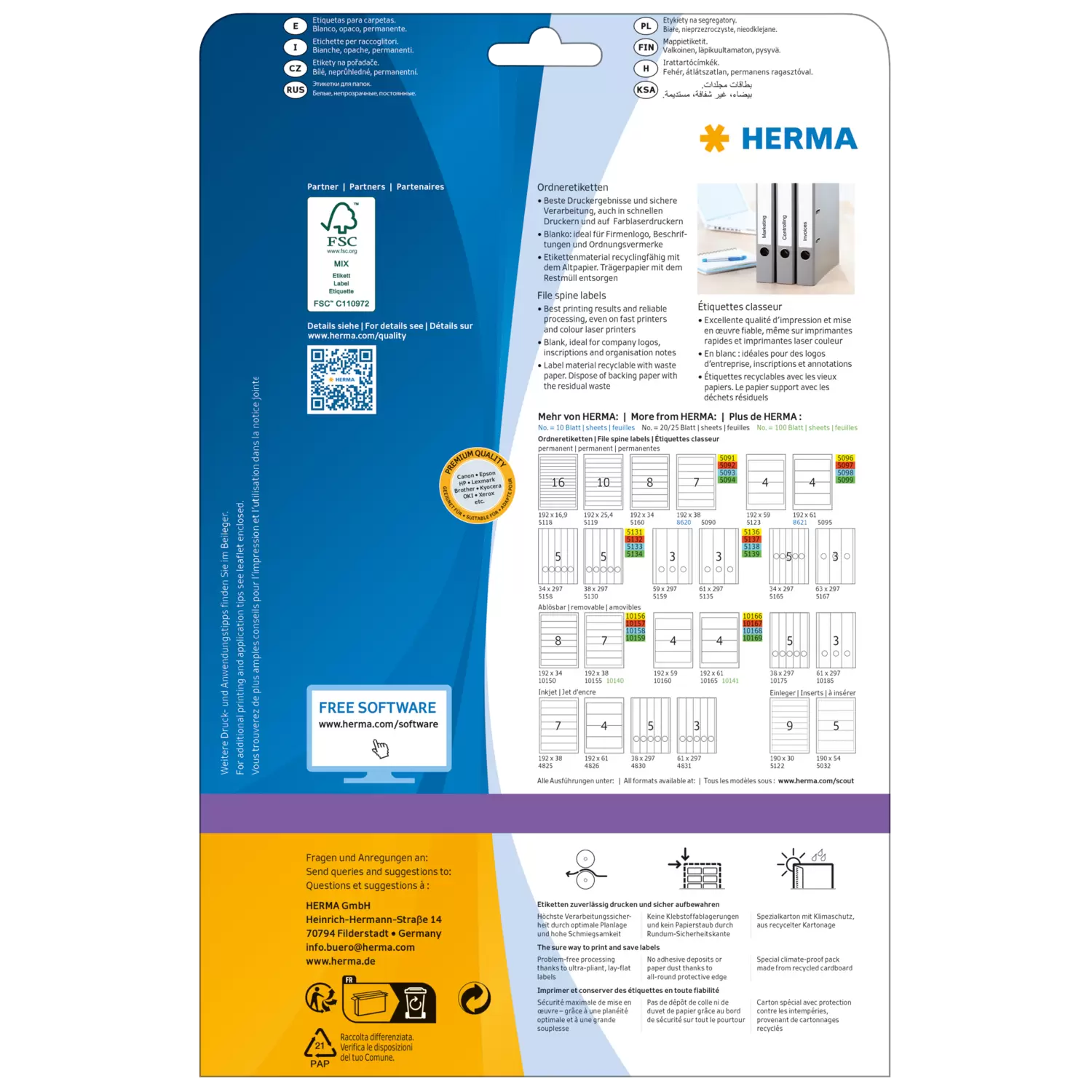 Ordneretiketten auf A4-Blättern, selbstklebend. Für ein einheitliches Erscheinungsbild im Büro und Zuhause. Für alle gängigen Ordner geeignet. Absolut blickdichtes Material mit hohem Weißgrad, alte Ordnerbeschriftungen scheinen nicht durch. Blanko: Ideal für Firmenlogo, Beschriftungen und Ordnungsvermerke. Sicher haftend, auch bei häufigem Ordnergebrauch. Umweltfreundlich: hochwertiges, chlorfrei gebleichtes Spezialpapier, FSC® Mix Credit-zertifiziert, lösemittelfreier Haftkleber. Etiketten sind 100 % recyclingfähig mit dem Altpapier, Verpackung aus Recyclingkarton. Sehr gute Druckergebnisse auf allen Laser- und Inkjetdruckern, Kopierern, Farblaserdruckern und Farbkopierern. Störungsfreie Verarbeitung durch Rundum-Sicherheitskante und optimale Planlage. Kostenlose Softwarelösungen: www.herma.de/software.